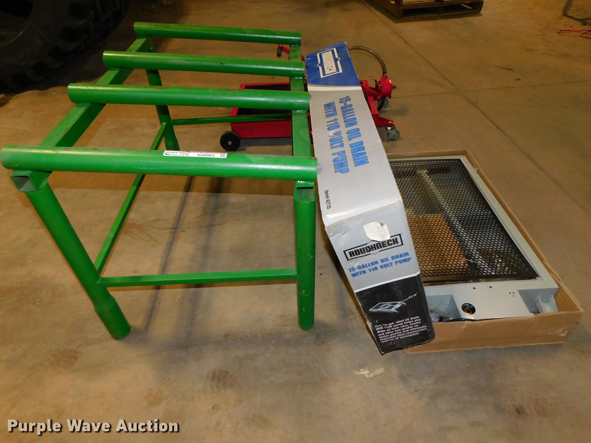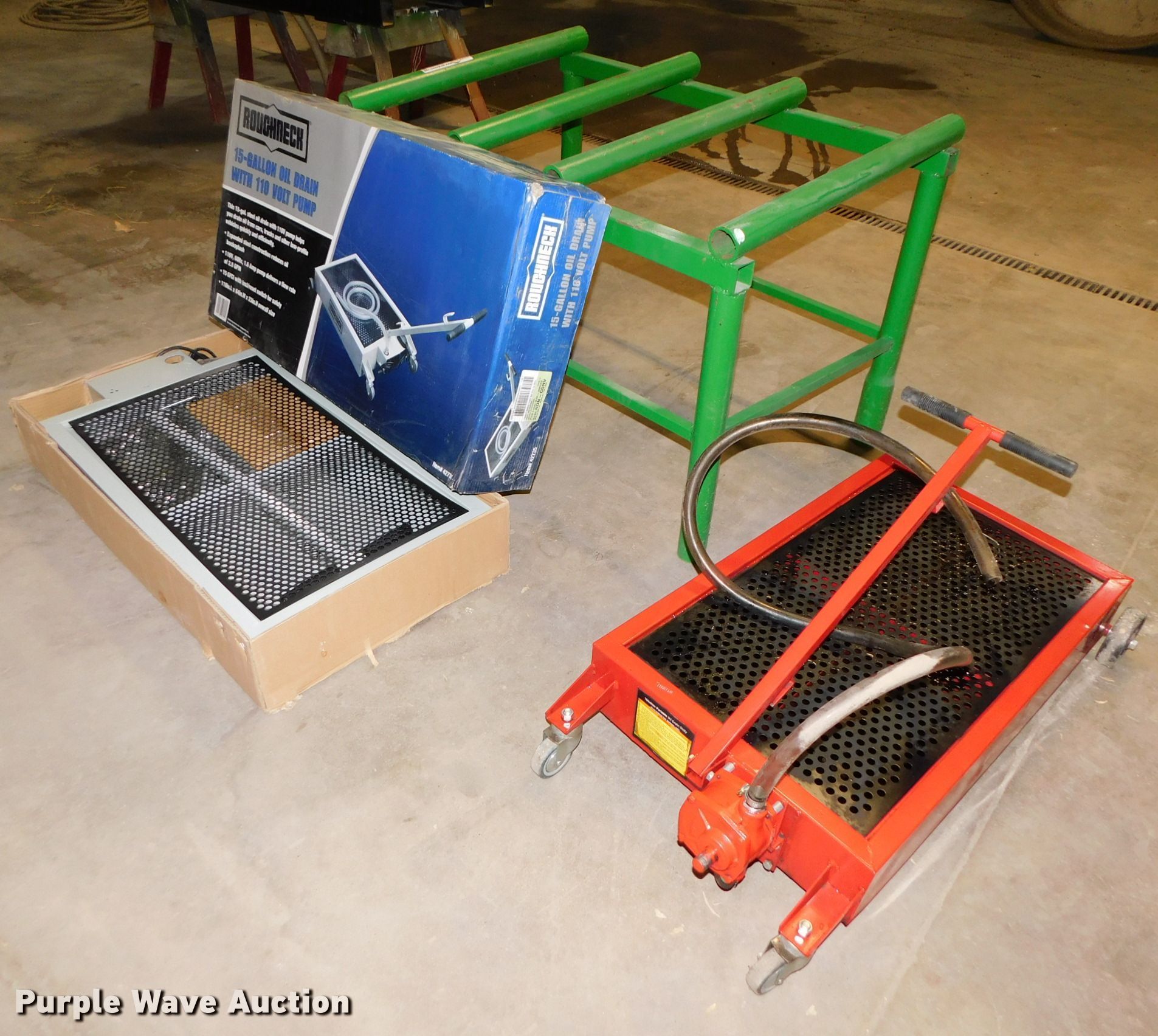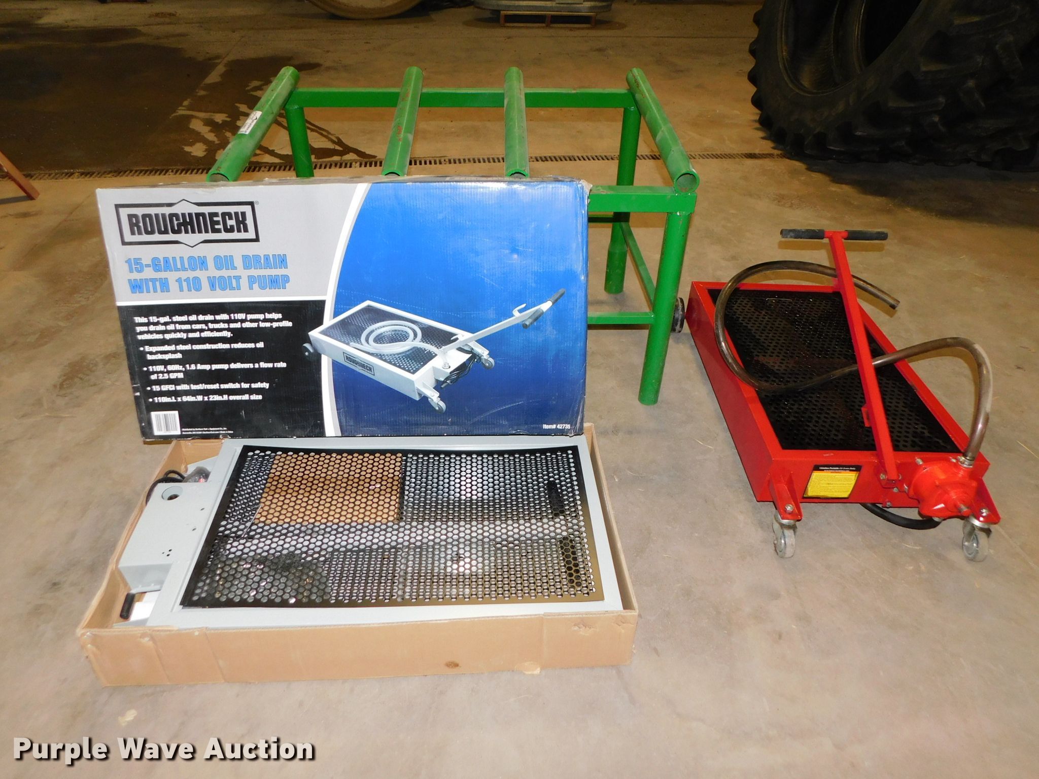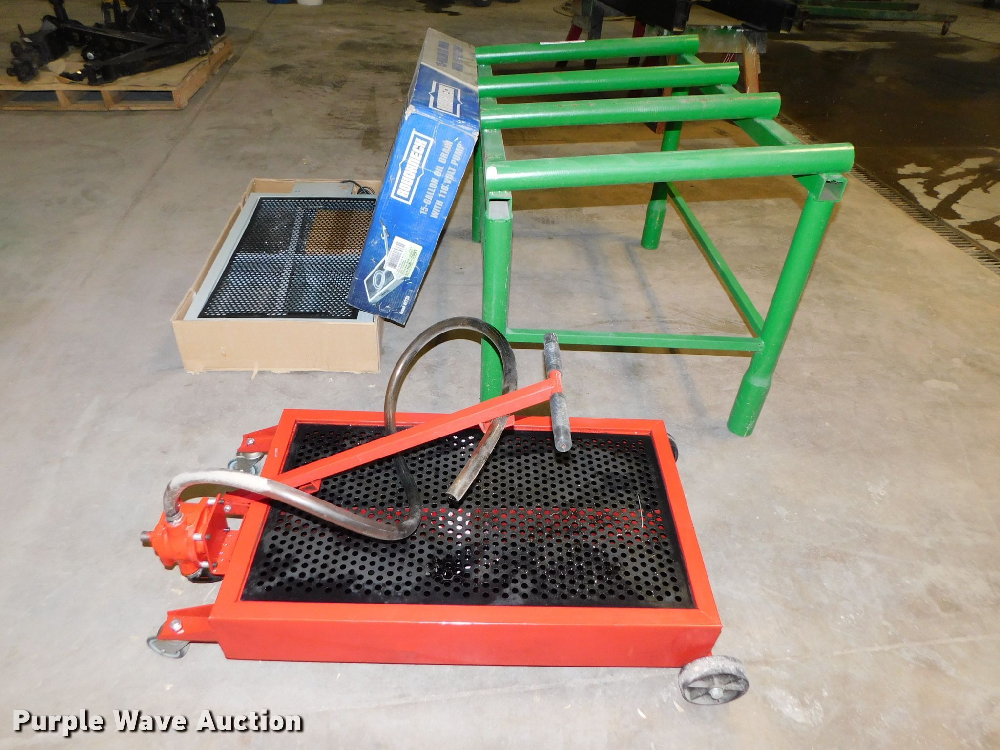 Purple Wave is selling a used Tools in Nebraska. This item is a Tools with the following: Shop built 55 gallon drum rack, Approx. 46"W x 30"D x 32"H, Roughneck 15 gallon oil drain dolly, Manual pump, Handle, Casters, Roughneck 15 gallon oil drain dolly, 110V pump, Handle, Casters, Unused