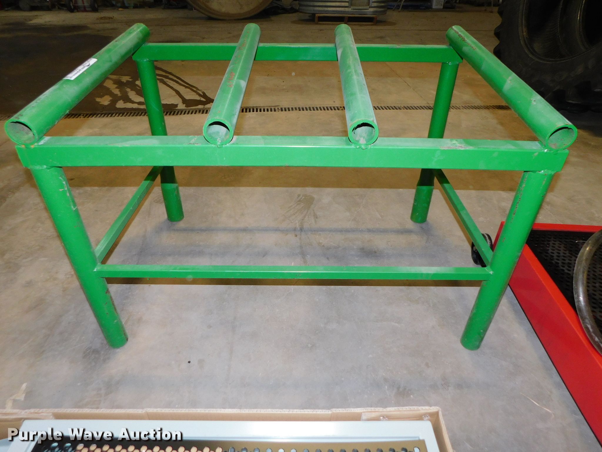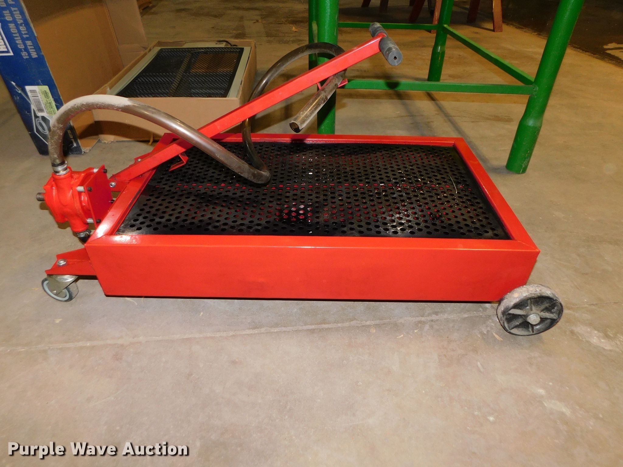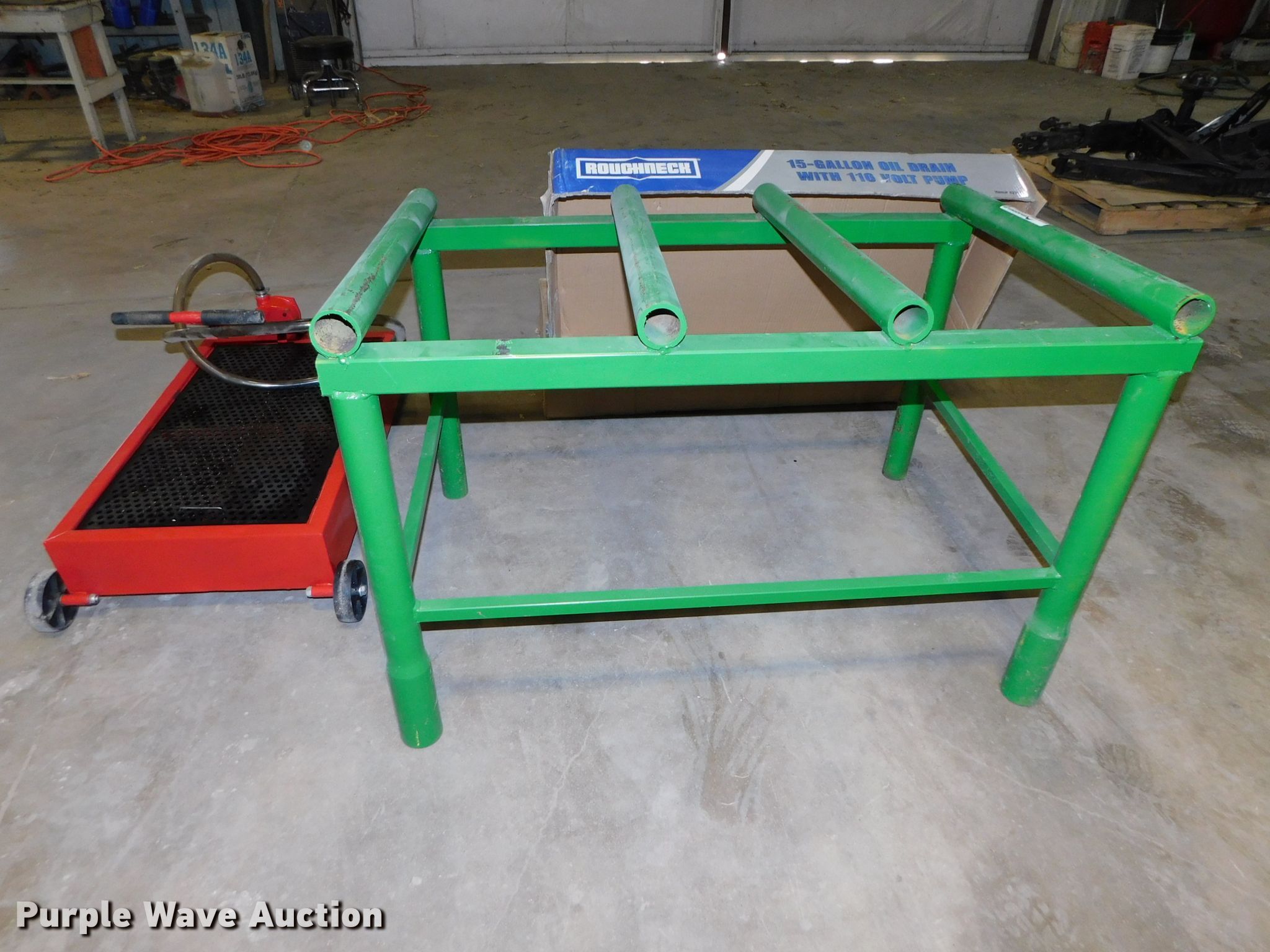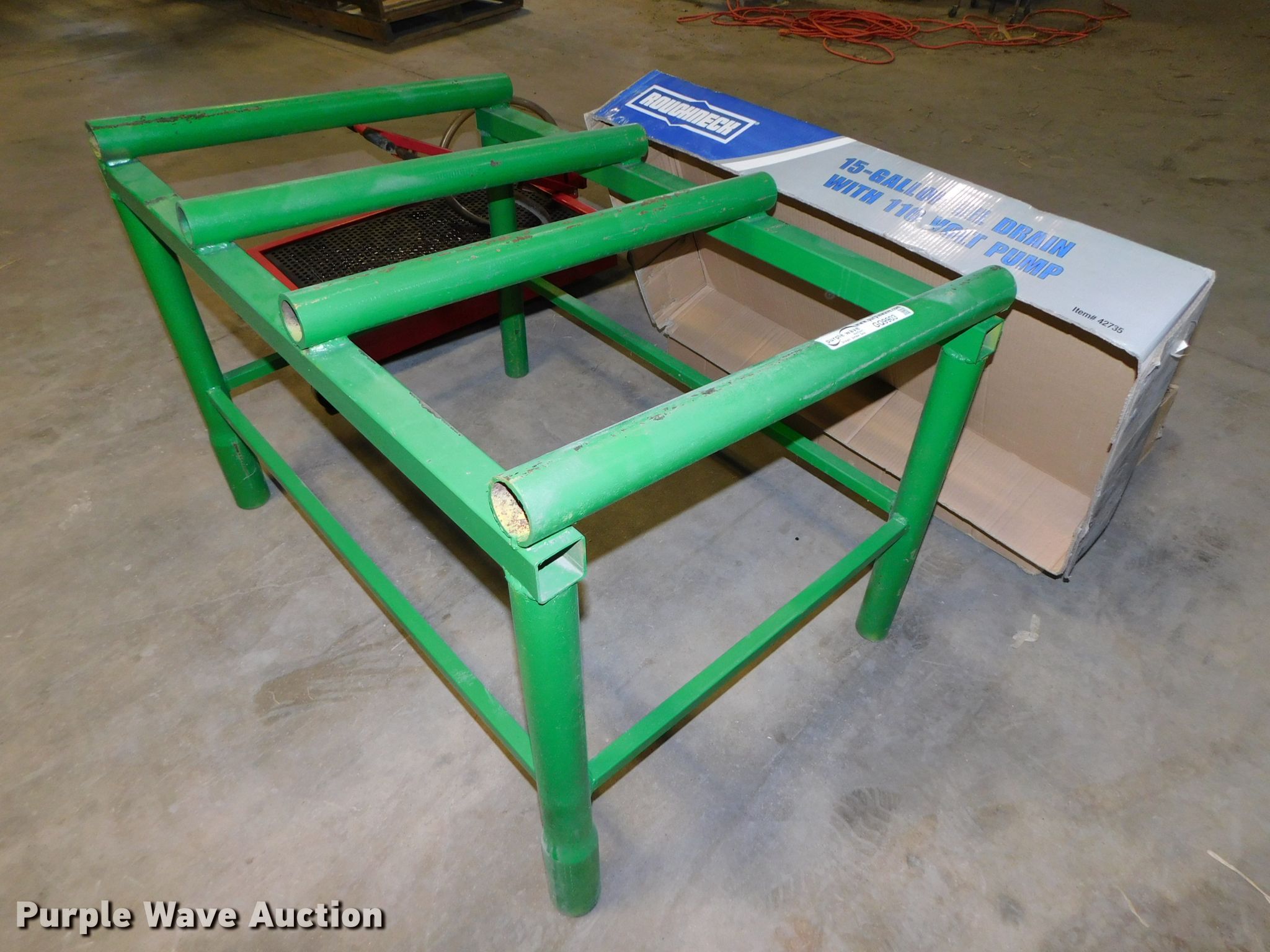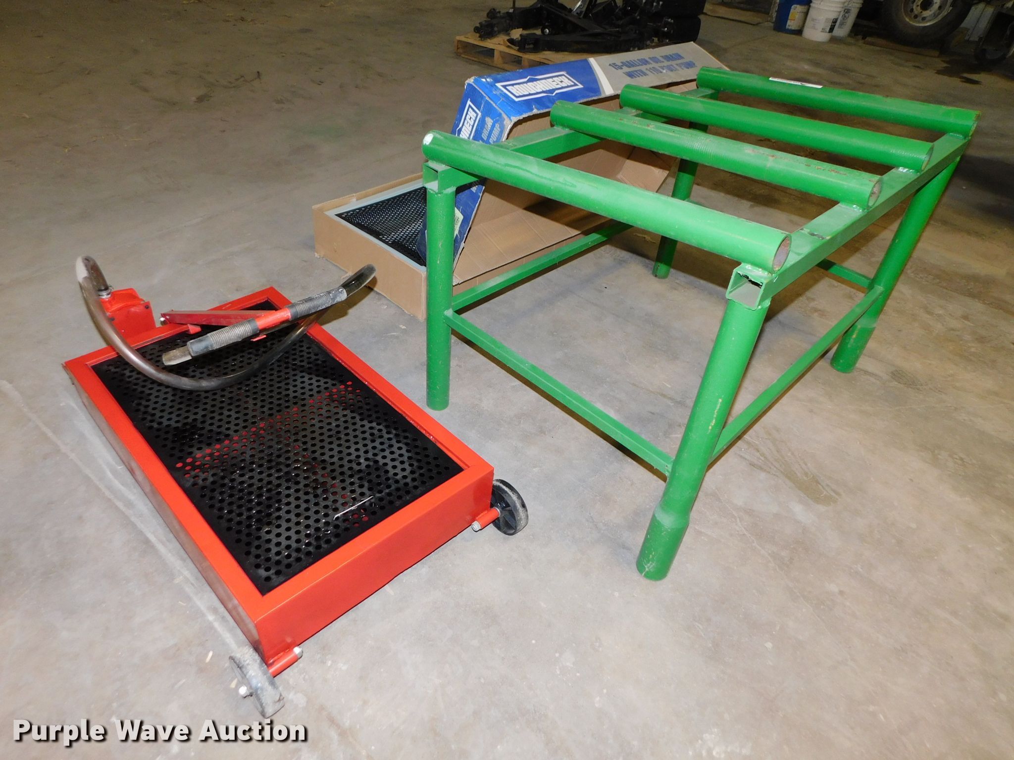 Purple Wave is selling a used Tools in Nebraska. This item is a Tools with the following: Shop built 55 gallon drum rack, Approx. 46"W x 30"D x 32"H, Roughneck 15 gallon oil drain dolly, Manual pump, Handle, Casters, Roughneck 15 gallon oil drain dolly, 110V pump, Handle, Casters, Unused