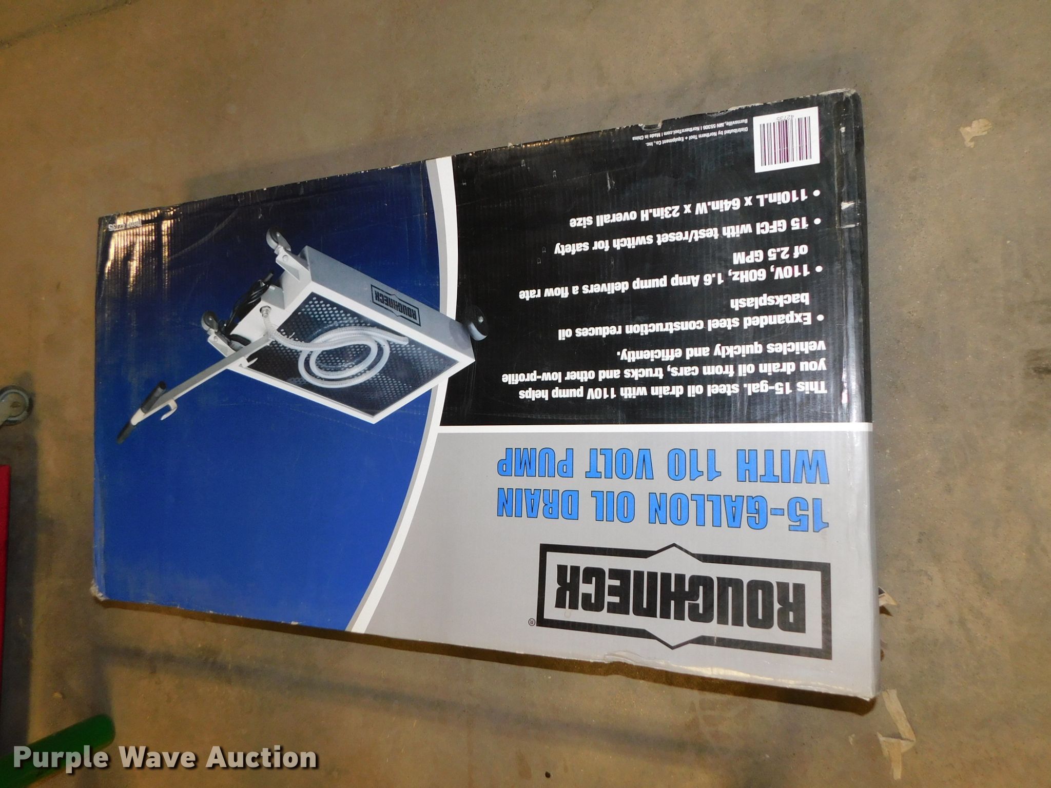 Tools. Shop built 55 gallon drum rack Approx. 46"W x 30"D x 32"H, Roughneck 15 gallon oil drain dolly Manual pump, Handle, Casters, Roughneck 15 gallon oil drain dolly 110V pump, Handle, Casters, Unused. TB Farms & Seed Sales. 71365 570th Ave. Fairbury, NE 68352