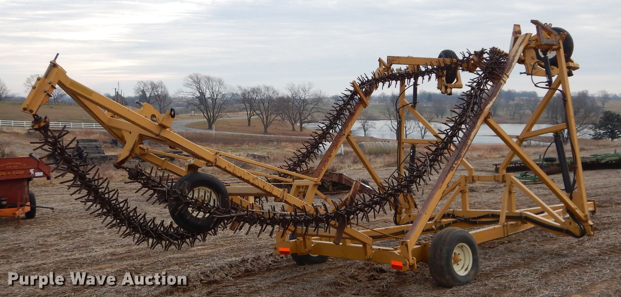 Purple Wave is selling a used Rotary Tillage in Kansas. This item is a Phillips 4305A rotary hoe with the following: 25'L overall, 40'W swath, 14" diameter blades, Goodyear 12.5L-15 tires, Serial 43TA-04147