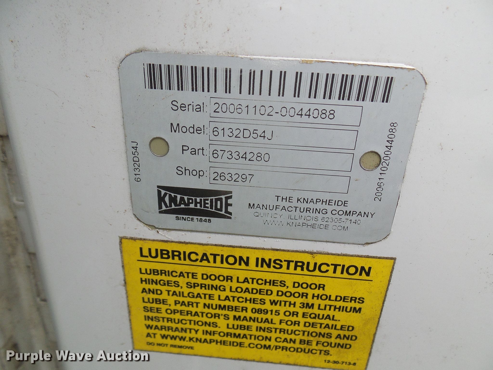 Purple Wave is selling a used Truck Part and Attach. in Missouri. This item is a Knapheide 6132D54J utility bed with the following: 12'L x 8'W, Serial 20061102-0044088