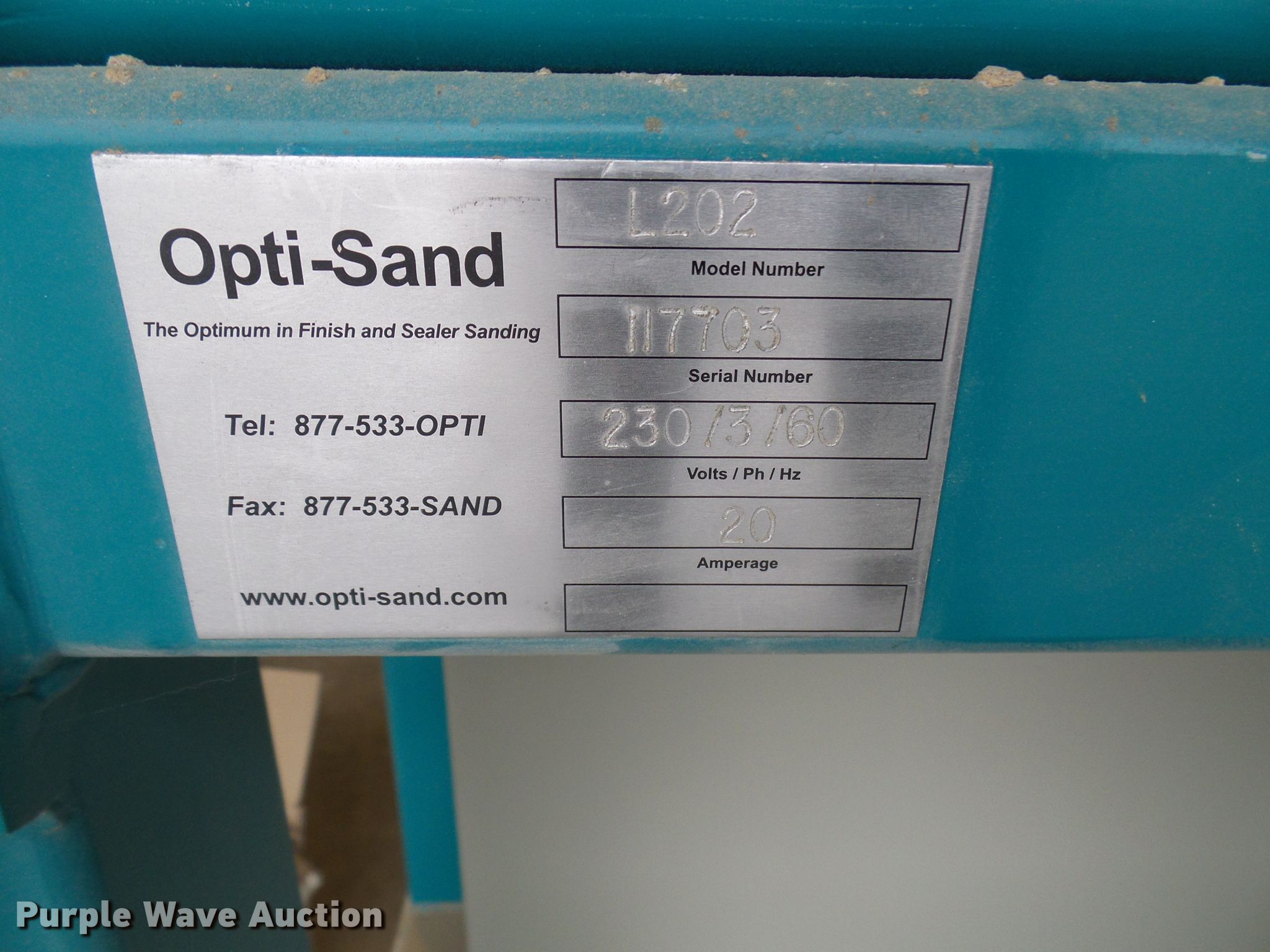 Purple Wave is selling a used Tools in Missouri. This item is a Opti Sand L202 sander with the following: Three phase, 20 amp, Serial 117703