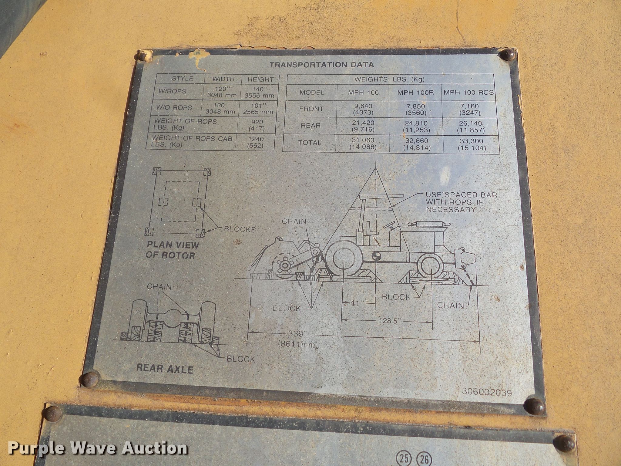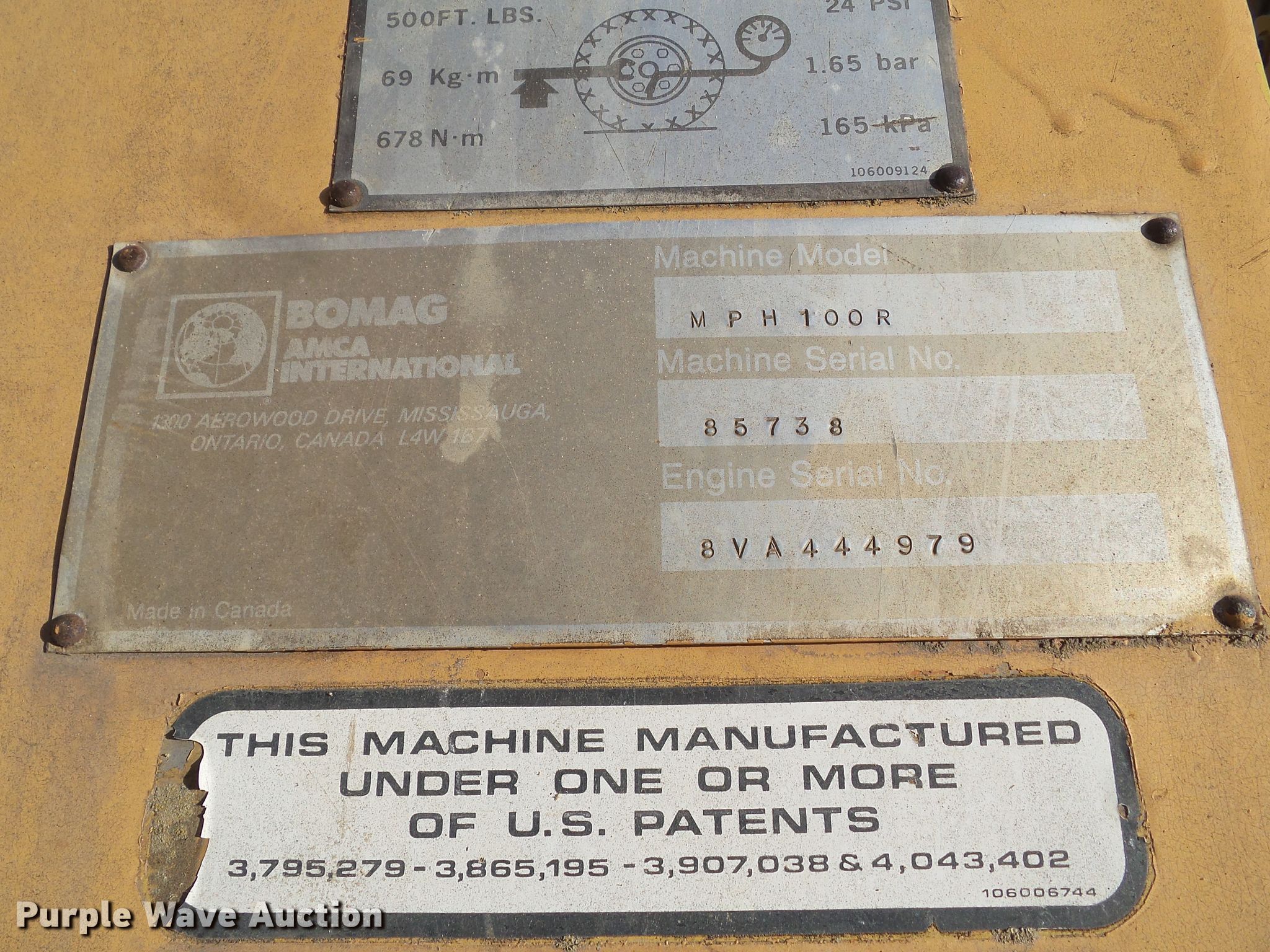 Bomag MPH 100R reclaimer. 8,086 hours on meter, Serial: 85738. Engine Detroit Diesel, Serial: 8VA444979, Cylinders: 8, Fuel type: Diesel. Transmission Hydrostatic. Operators station Canopy, OROPS. Operational Cutting head Width: 74", Teeth Carbide, Water/emulsion application system. Tires Front: 11.25-24SL, Rear: 28L-26. Notes Counter Weight. Grimes Asphalt & Paving. 5550 NE 22nd St. Des Moines, IA 50316