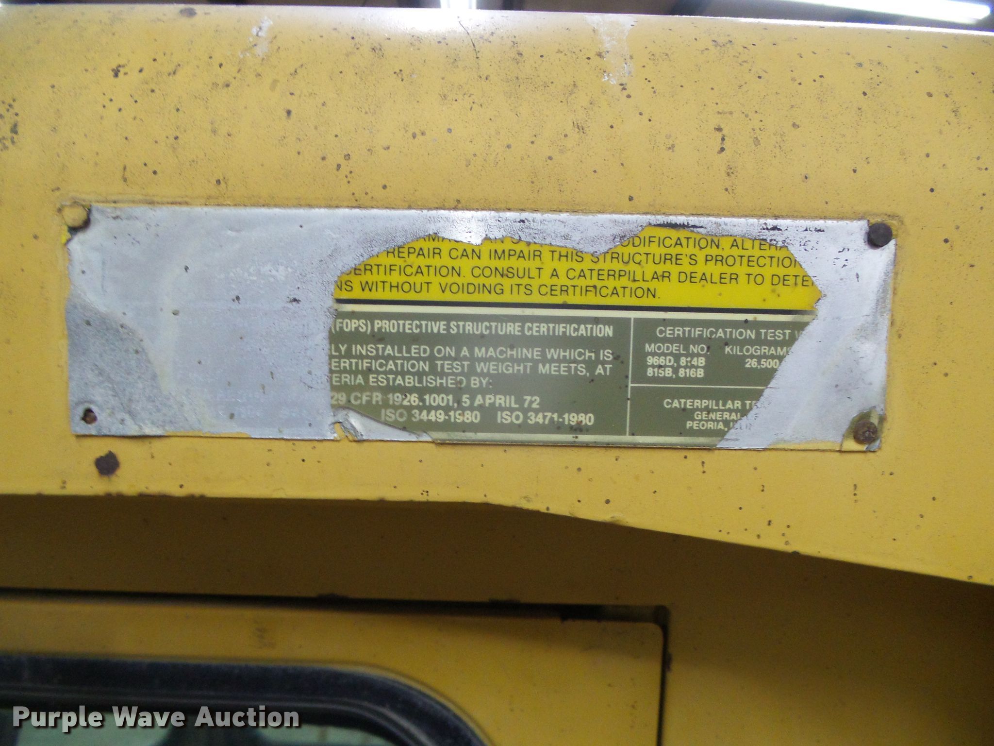 1987 Caterpillar 966D wheel loader. 8,899 hours on meter, Serial: 99Y05019. Engine Caterpillar 3306, Serial: 01Z40385, Cylinders: 6, Fuel type: Diesel. Transmission Powershift, 4F - 4R. Operators station EROPS AC, Heat, Bucket controls: Two-lever. Operational Counter weights, Bucket Make: Caterpillar, Model: 6W7794, Width: 120", Cutting edge: Bolt-on. Tires Size: 26.5R25. Notes Windshield chipped or cracked. Thunder Struck Farms. 955 S Circle Land Rd. Garden City, KS 67846