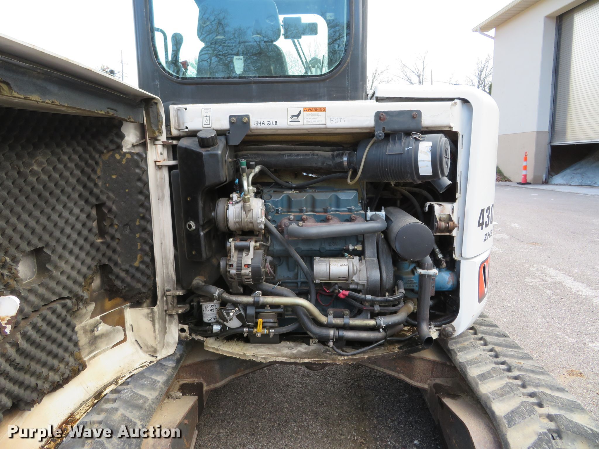 2004 Bobcat 430 ZHS mini excavator. 6,050 hours on meter, Serial: 562711163, Unit #: 173. Engine Kubota V2203-M-DI-ES, Displacement: 2.2L, Cylinders: 4, Fuel type: Diesel, HP: 49. Transmission Hydrostatic, Two speed travel. Operators station Enclosed cab, AC, Heat, Pattern changer. Operational Auxiliary hydraulics, Backfill blade Width: 70", Boom Swing, Stick Stick length: 47", Quick coupler: Mechanical Bobcat, Bucket Bobcat , Width: 18", Teeth: 3, Bucket Bobcat, Width: 24" , Teeth: 5. Tracks Width: 12", Rubber. Kelpe Contracting, Inc.. Wildwood, MO 63038