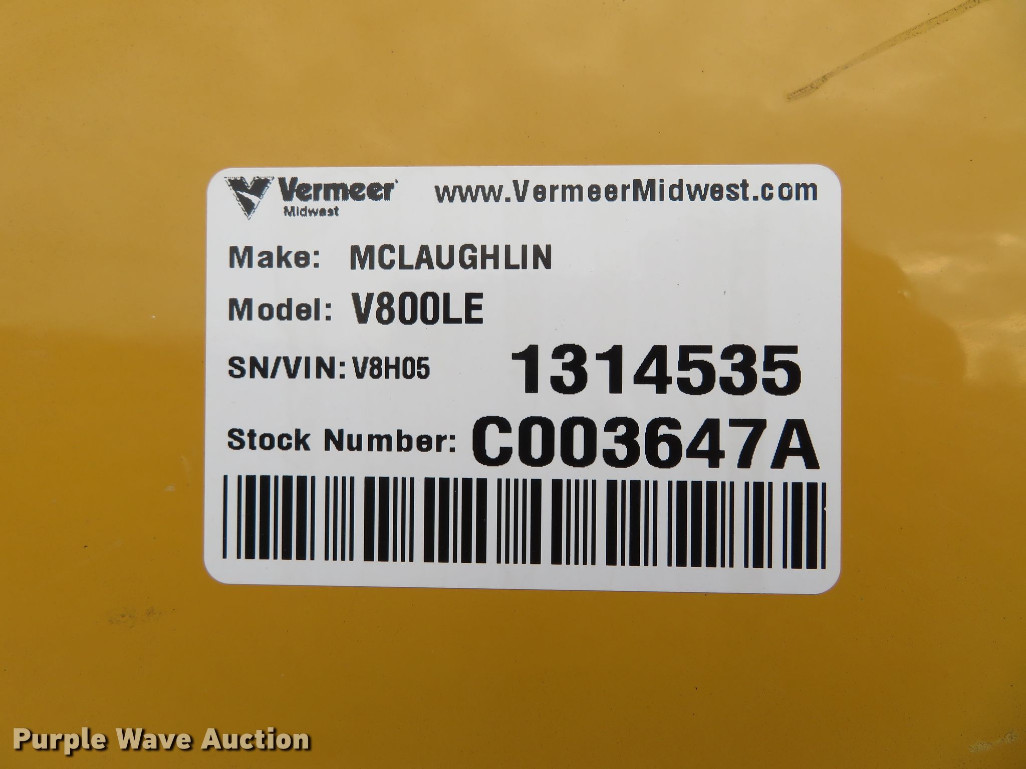 Purple Wave is selling a used Vacuum Excavator in Missouri. This item is a 2014 Vermeer V800LEHD vacuum excavator with the following: 718 hours on meter, Kubota four cylinder diesel engine, 1,025 CFM blower, Reverse flow, Water pump, (2) 205 gallon poly water tanks, 800 gallon debris tank, 4" diameter vacuum hose, Hydraulic boom, Remote control, Single leg hydraulic landing gear, Spring suspension, Electric brakes, 215/75R17.5 tires, GVWR 18,000 lbs, GAWR 9,000 lbs, Serial V8H051314535, Unit# C003647A