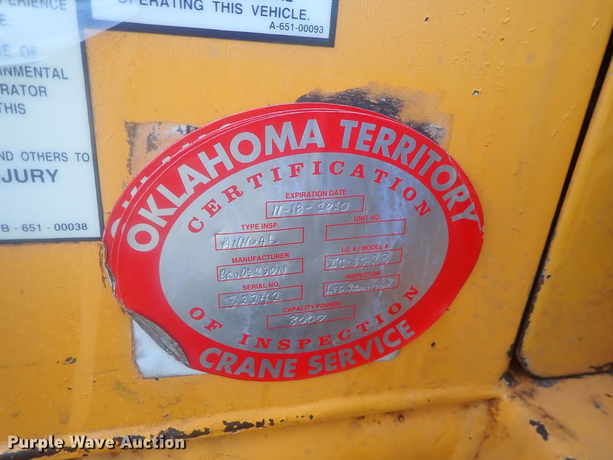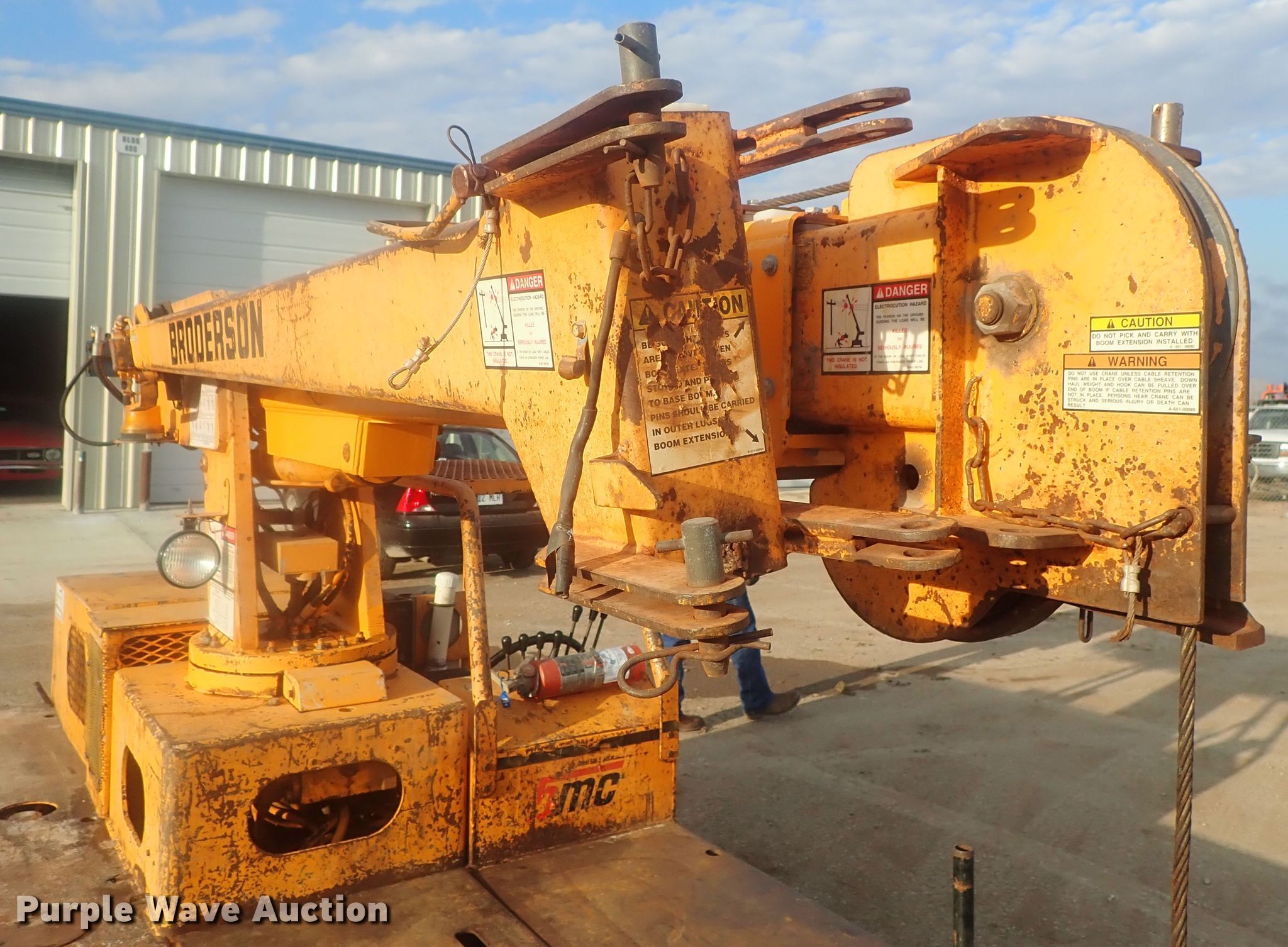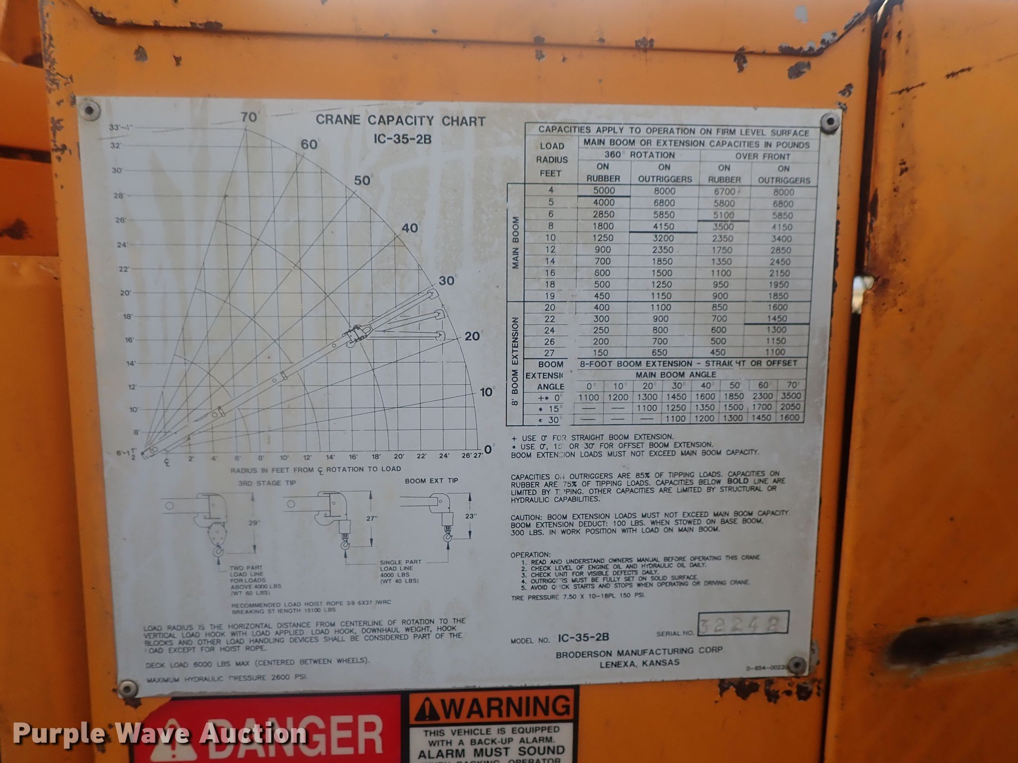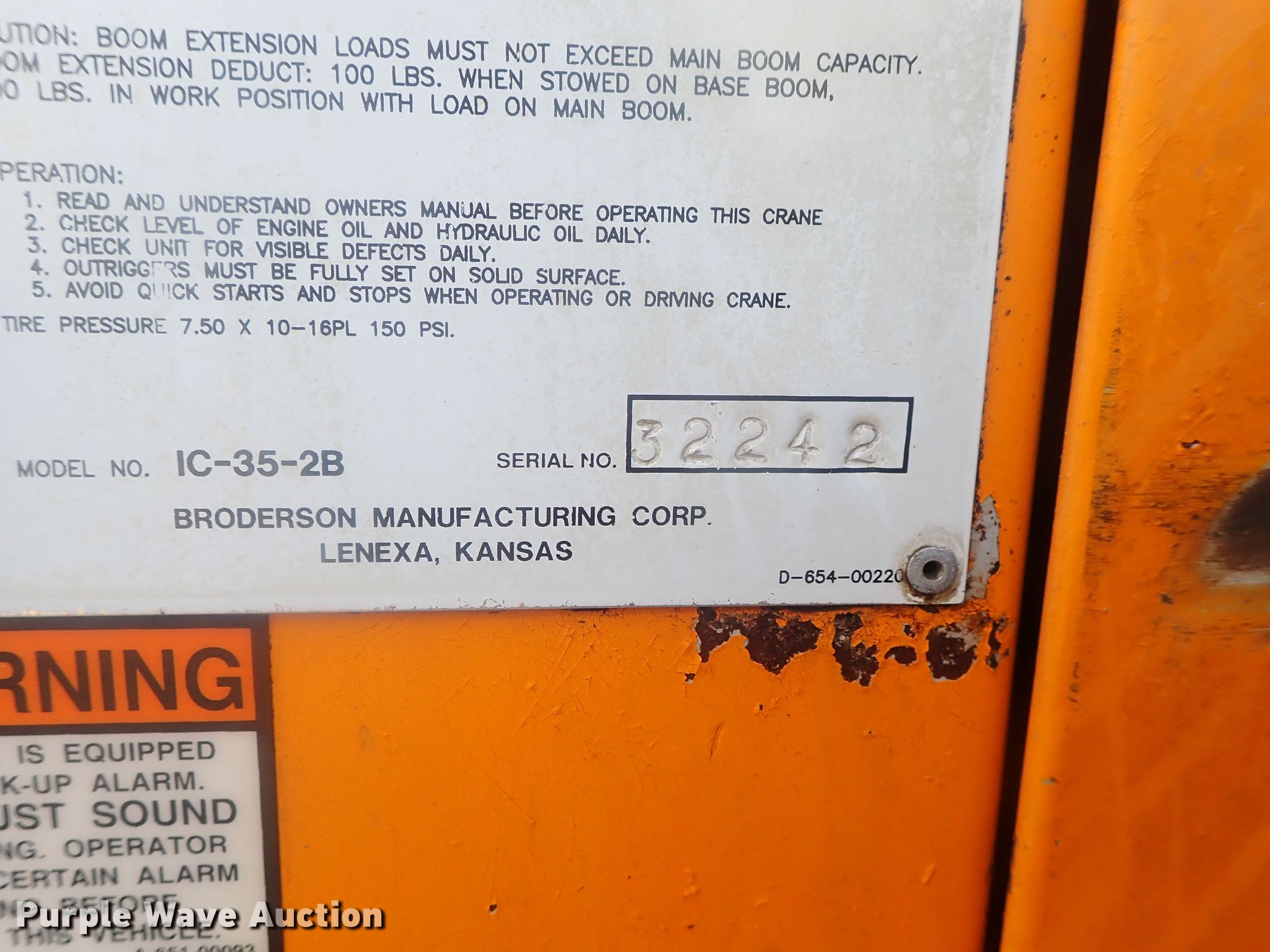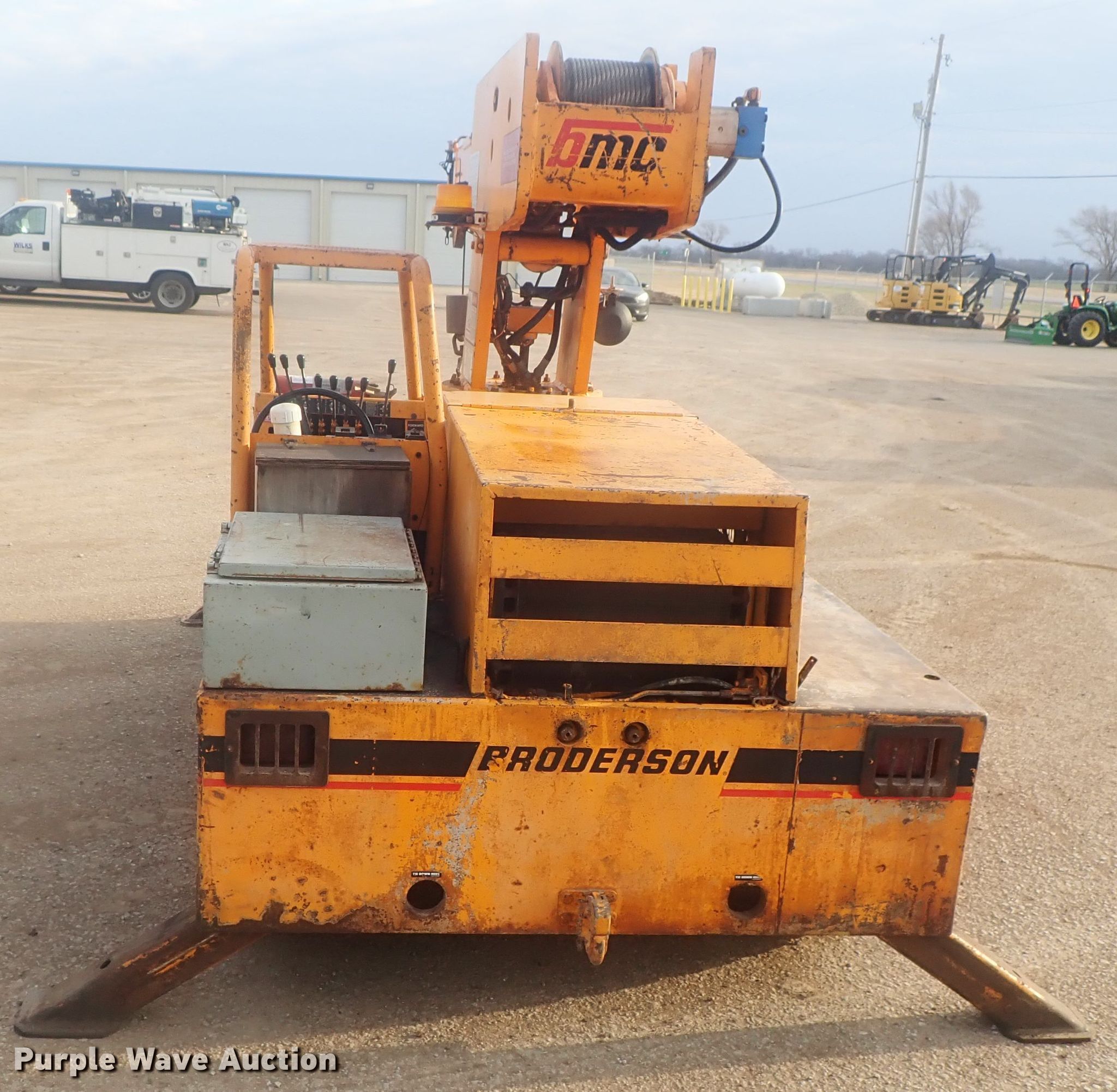 Purple Wave is selling a used Carry Deck Crane in Kansas. This item is a Broderson IC-35-2B crane with the following: 4,138 hours on meter, Serial: 32242