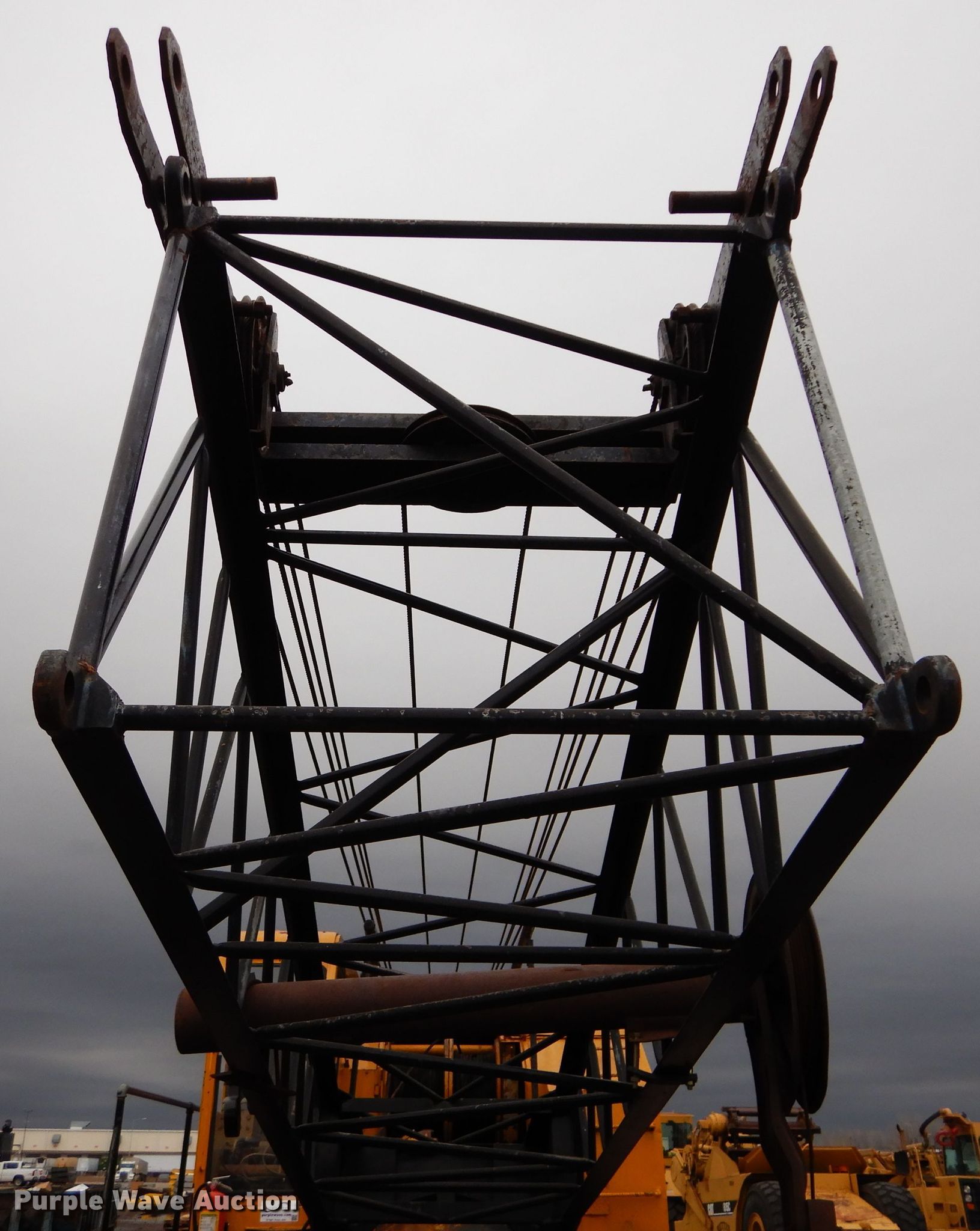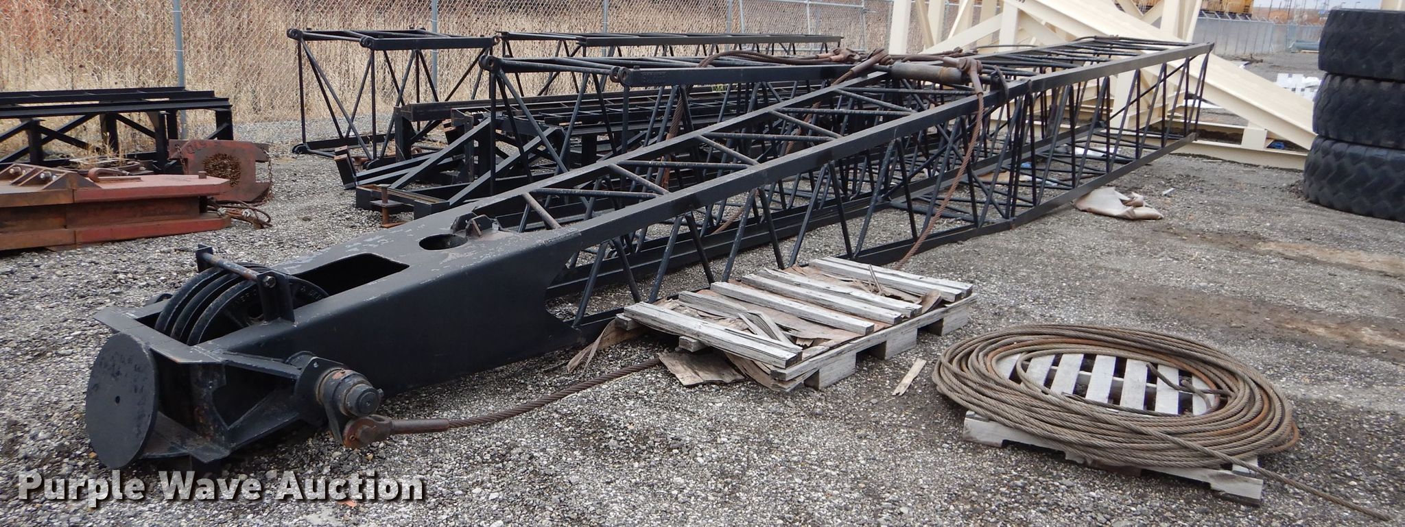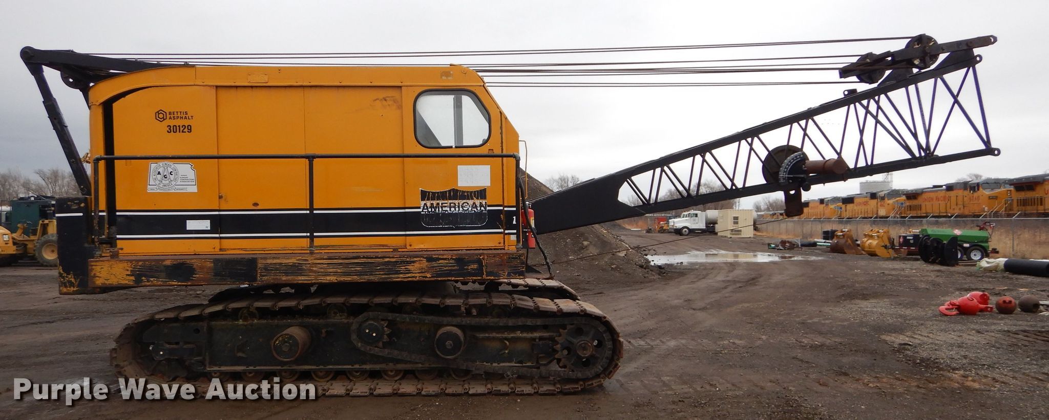 American 599C crane. 8,508 hours on meter, Serial: GS5064. Engine Detroit Diesel 461, Cylinders: 4, Fuel type: Diesel. Chassis Crawler Propulsion: Mechanical, Controls: Air actuated. Operators station Enclosed cab, Crane controls: Stick. Operational Boom Lattice, Boom length: 95', Sections: 4, Maximum lift capacity: 80,000 lbs, Boom controls, Winches: 2. Tracks Width: 35", Extendable tracks. Bettis Asphalt. 1800 NW Brickyard Rd. Topeka, KS 66601