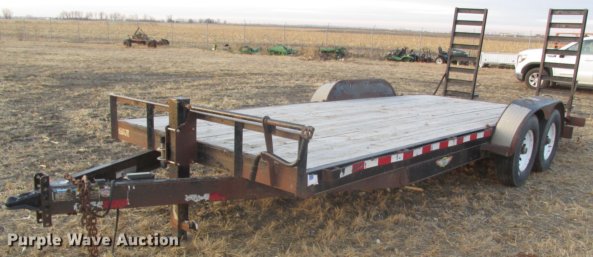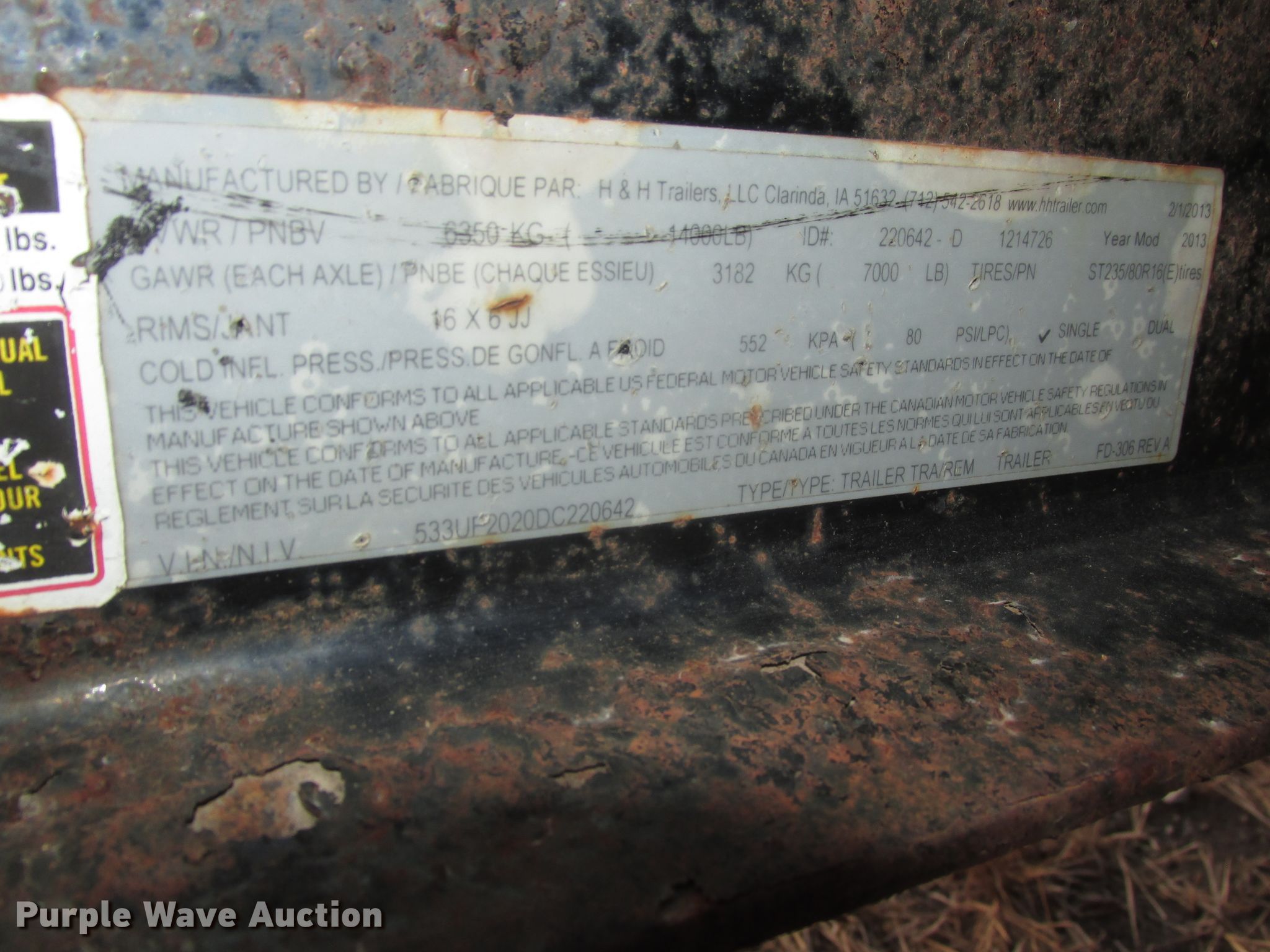 Purple Wave is selling a used Car or Utility Trailer in Iowa. This item is a 2013 H&H UF202 utility trailer with the following: 20'L x 83"W wood trailer, 5'L ramps, Single leg landing gear, Spring suspension, Electric brakes, Tandem axle, ST235/85R16 tires, GVWR 14,000 lbs, GAWR 7,000 lbs