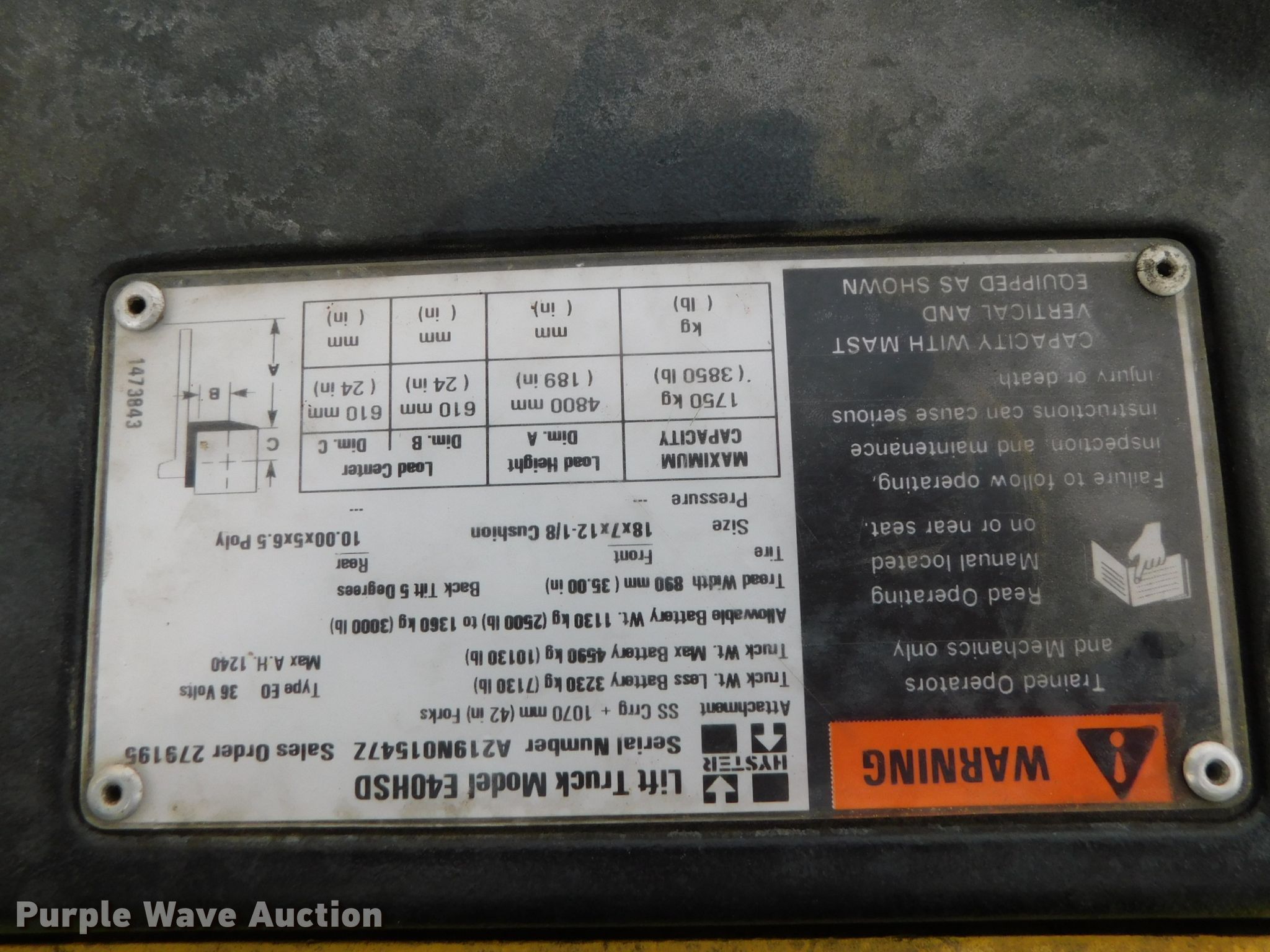 Purple Wave is selling a used Warehouse Forklift in Nebraska. This item is a 2002 Hyster E40HSD forklift with the following: 14,260 hours on meter, Serial: A219N01547Z, Unit #: EQN120746