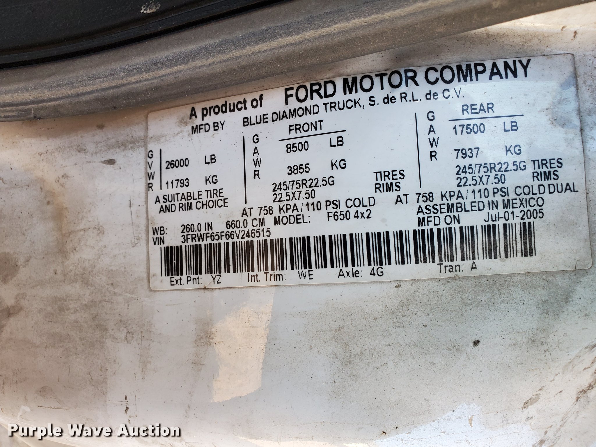 2006 Ford F650 Super Duty truck cab and chassis. 357,330 miles on odometer. Engine Cummins ISB, Displacement: 5.9L, Cylinders: 6, Fuel type: Diesel. Transmission Automatic. Chassis Axles: Single, Suspension: Spring, Brakes: Air, GVWR: 26,000 lbs FAWR: 8,500 lbs, RAWR: 17,500 lbs. Interior AC, Heat, Cruise control. Operational Fuel tank: Single. Tires Size: 11R22.5. Notes Windshield chipped or cracked, Glass broken, Engine issues Unit will not stay running, Unknown operating condition. South Dakota. Title distribution may be delayed up to 14 days from verification of funds. 3FRWF65F66V246515. 47786 85th St. Sioux Falls, SD 57108
