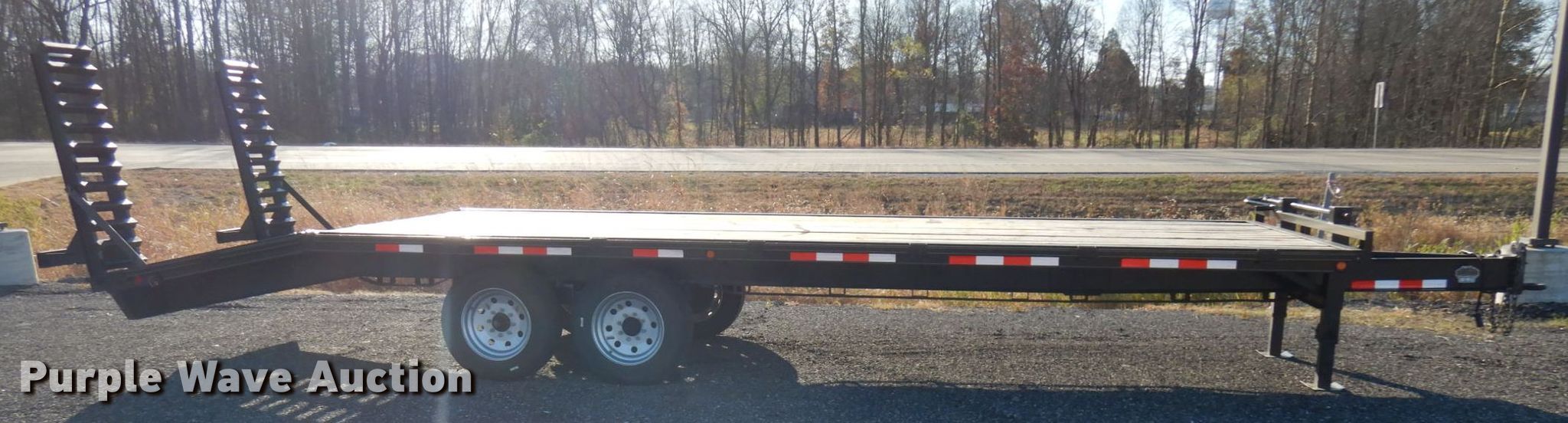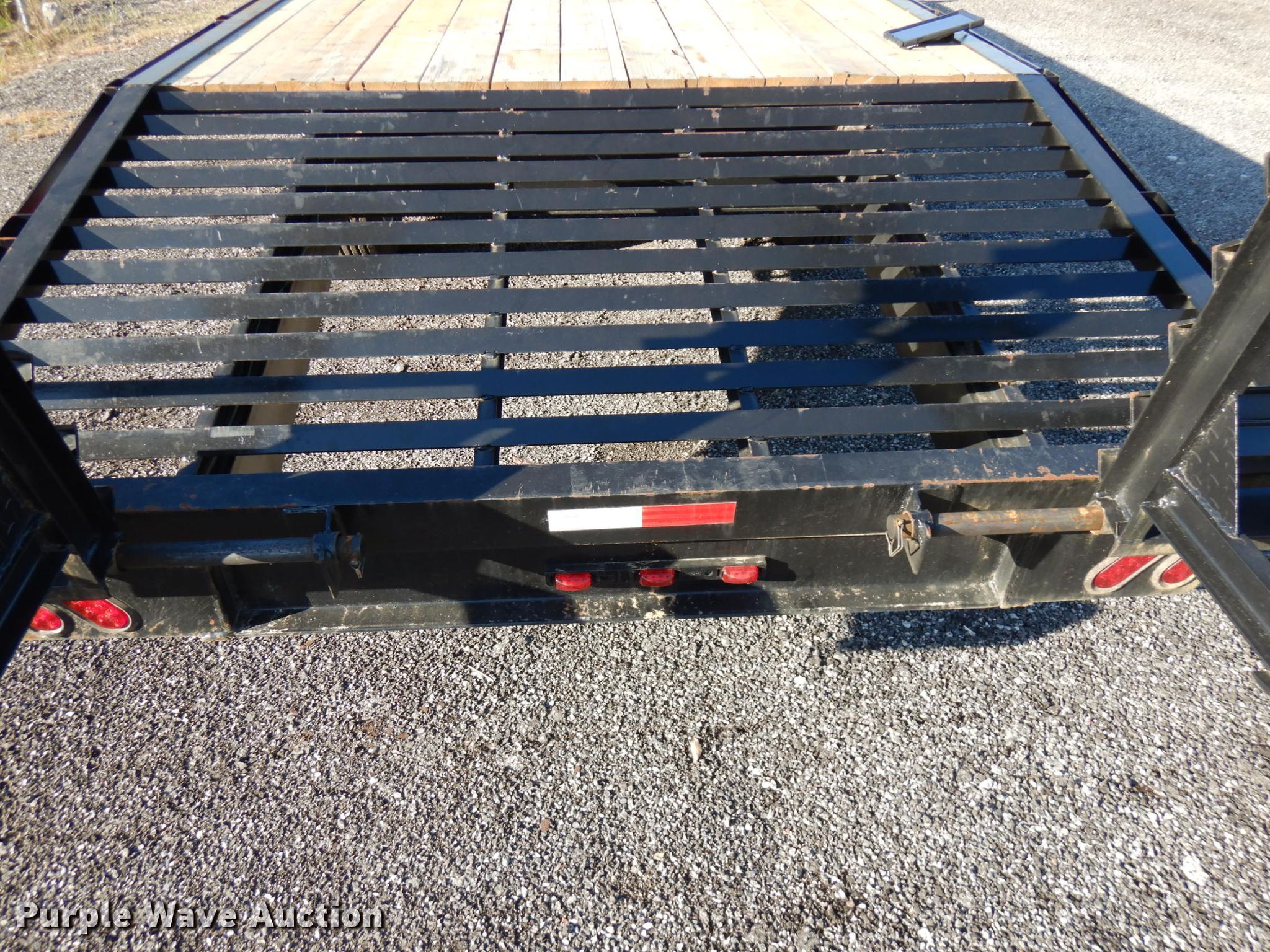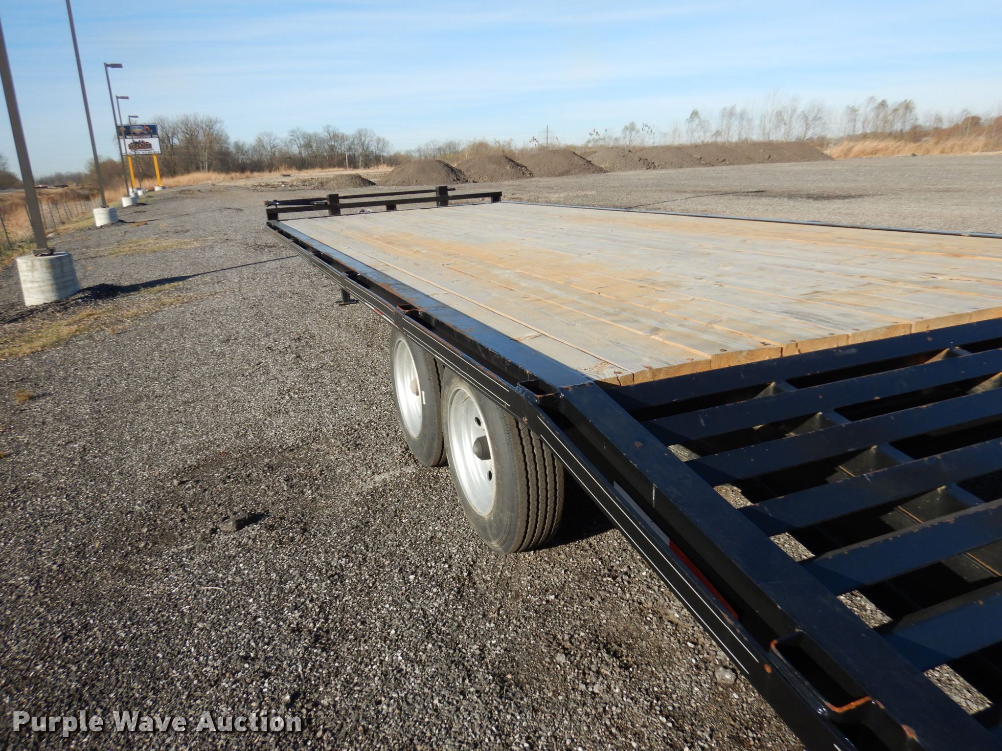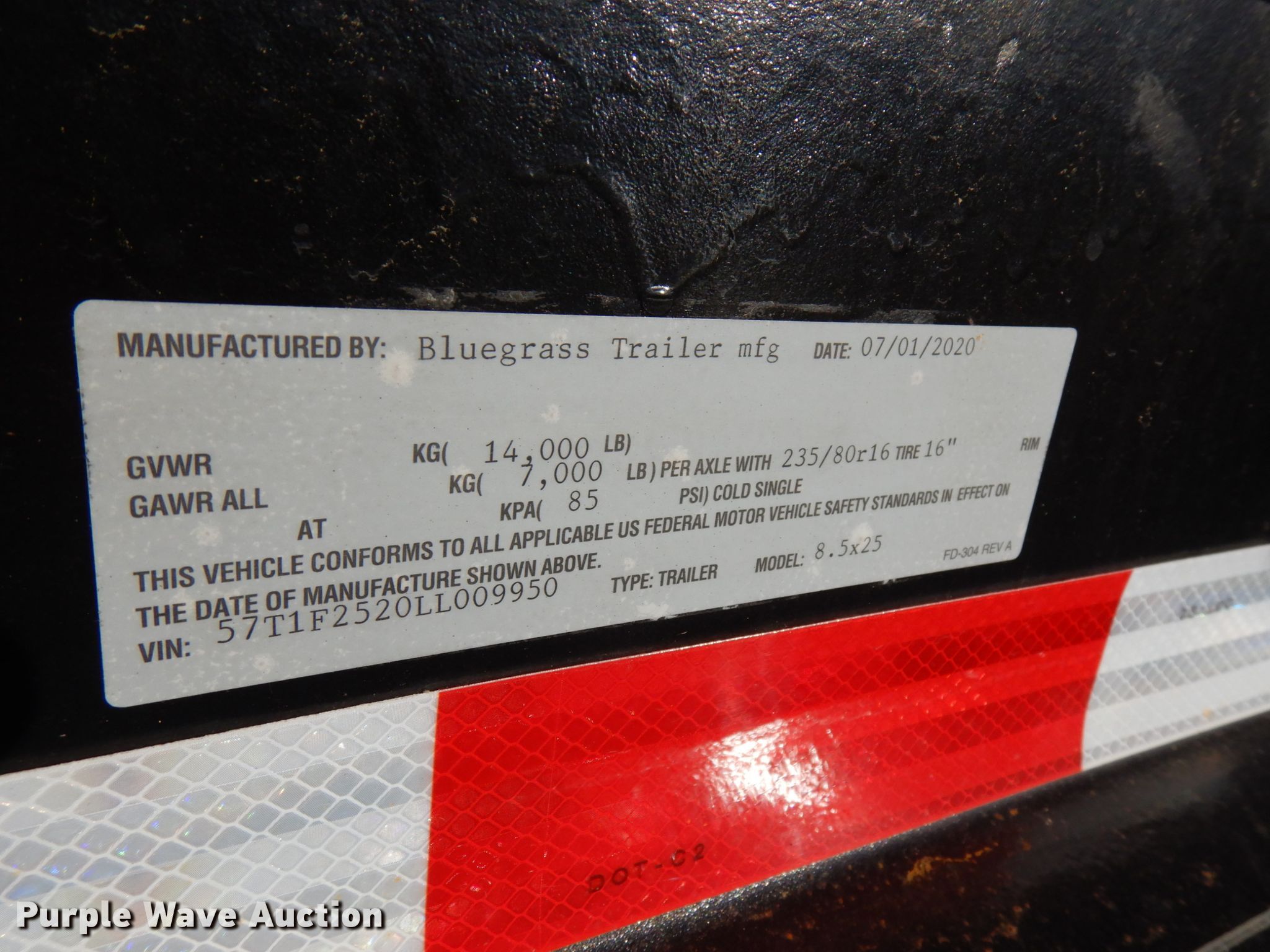 Purple Wave is selling a used Equip. Trailer in Indiana. This item is a 2020 Bluegrass equipment trailer with the following: 30'L overall, 20'L x 101.5"W wood deck, 5'L ramps, Dual leg landing gear, Spring suspension, Electric brakes, Tandem axle, Aluminum wheels, 215/75R17.5 tires, GVWR 14,000 lbs