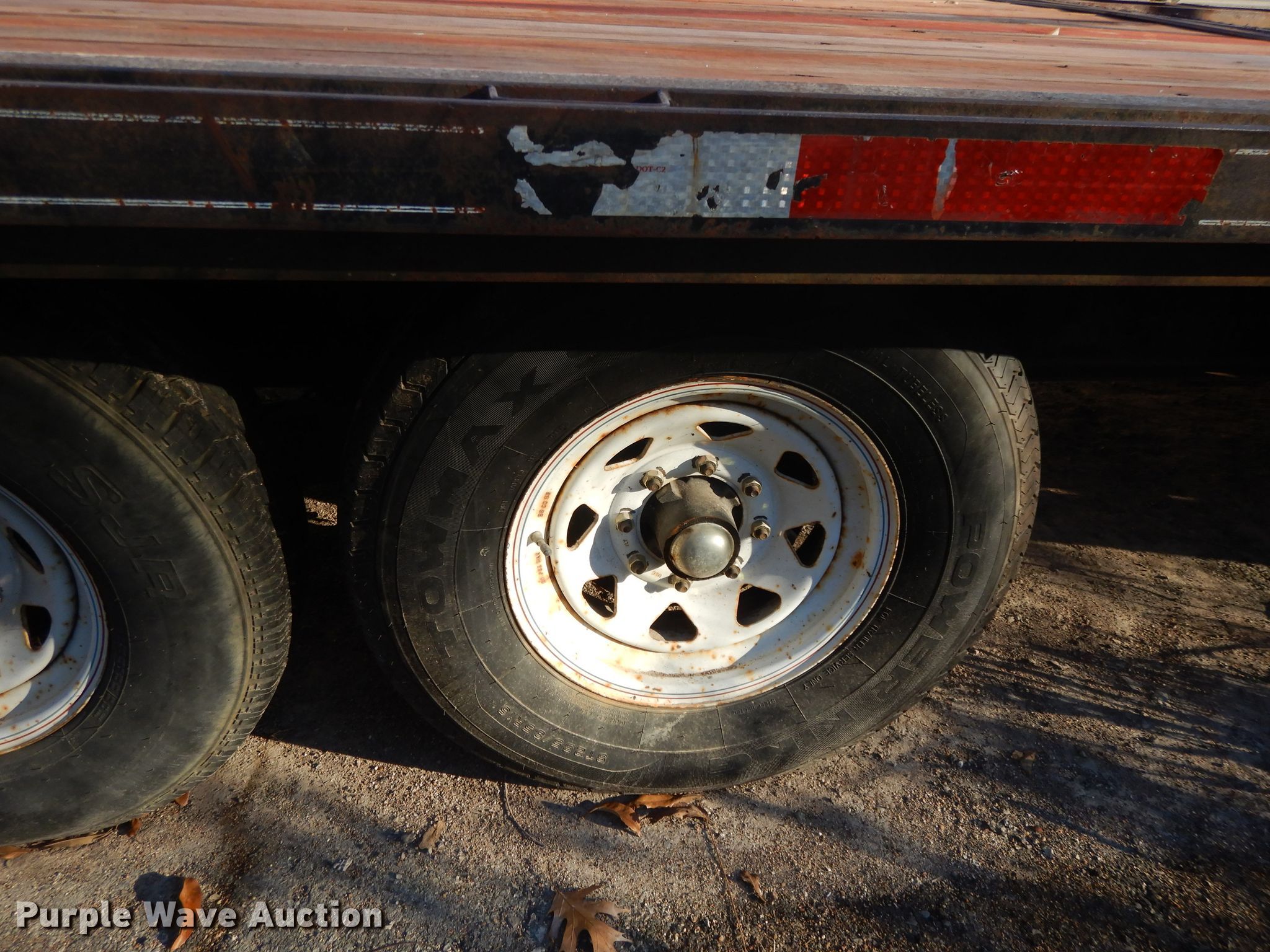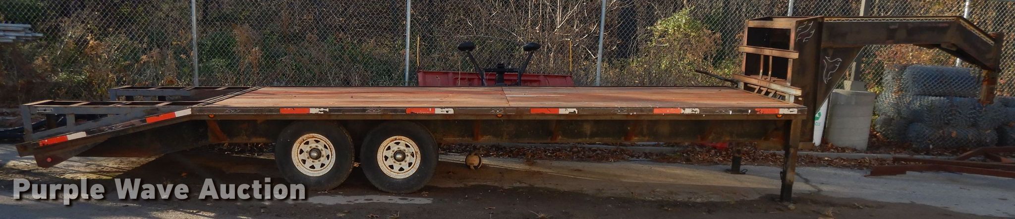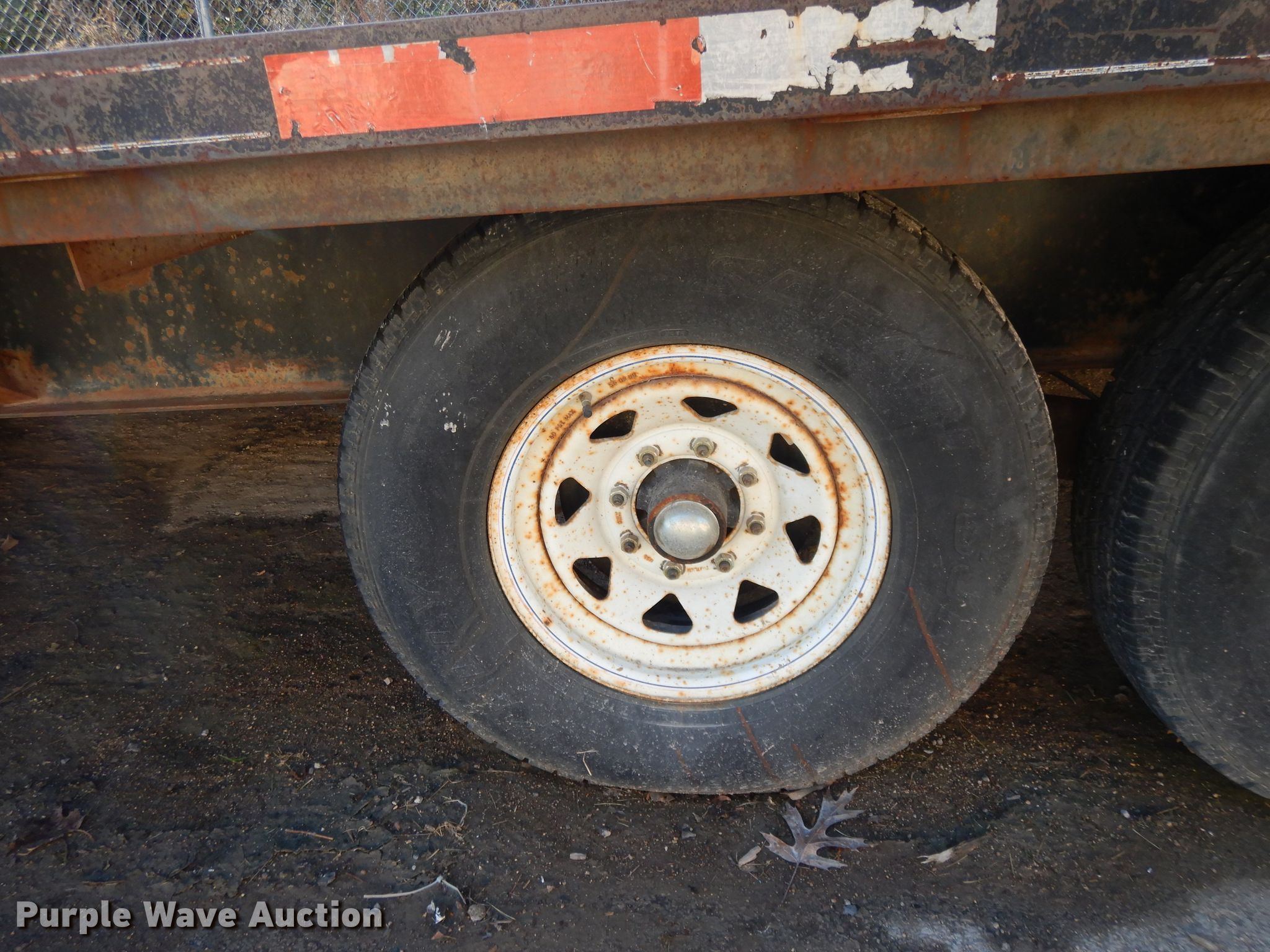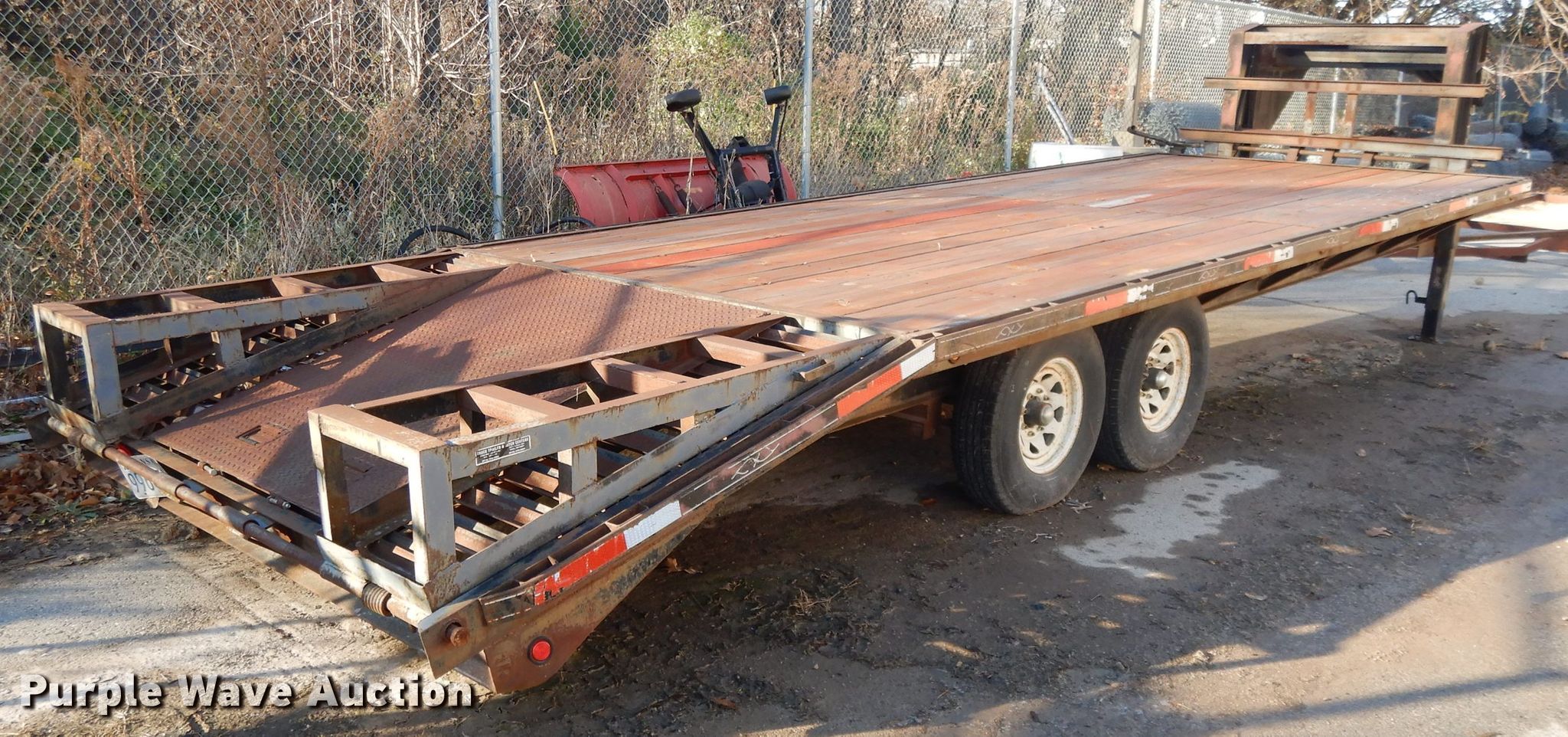 Purple Wave is selling a used Flat or Drop Deck Trailer in Kansas. This item is a 2000 Buck Dandy equipment trailer with the following: 32'L x 101"W overall, 20'L x 97"W deck, 5' tail length, 5'L ramps, Wood deck, Dual leg landing gear, Spring suspension, Electric brakes, Tandem axle, Steel wheels, 235/85R16 tires, GVWR 14,000 lbs, GAWR 7,000 lbs