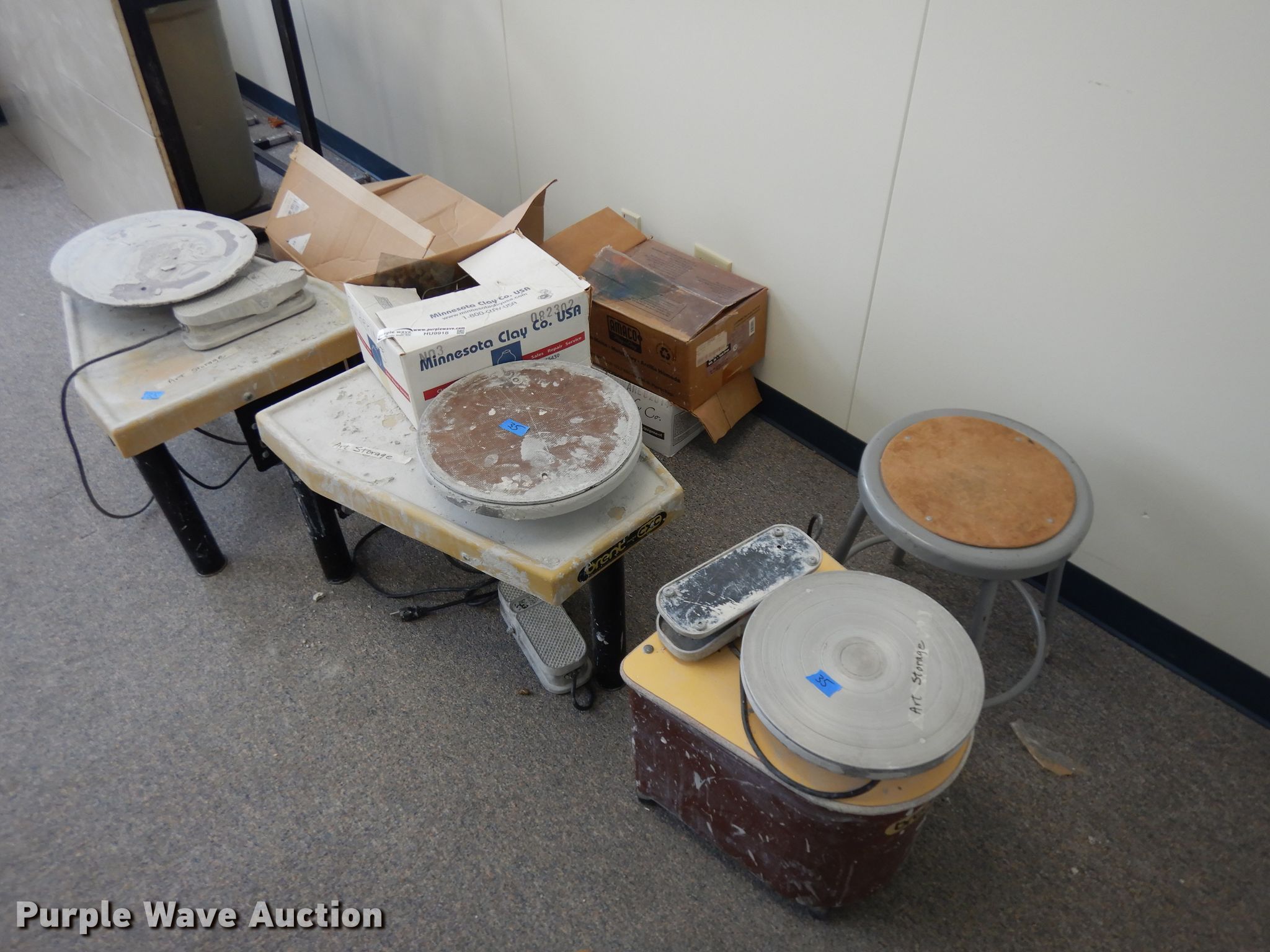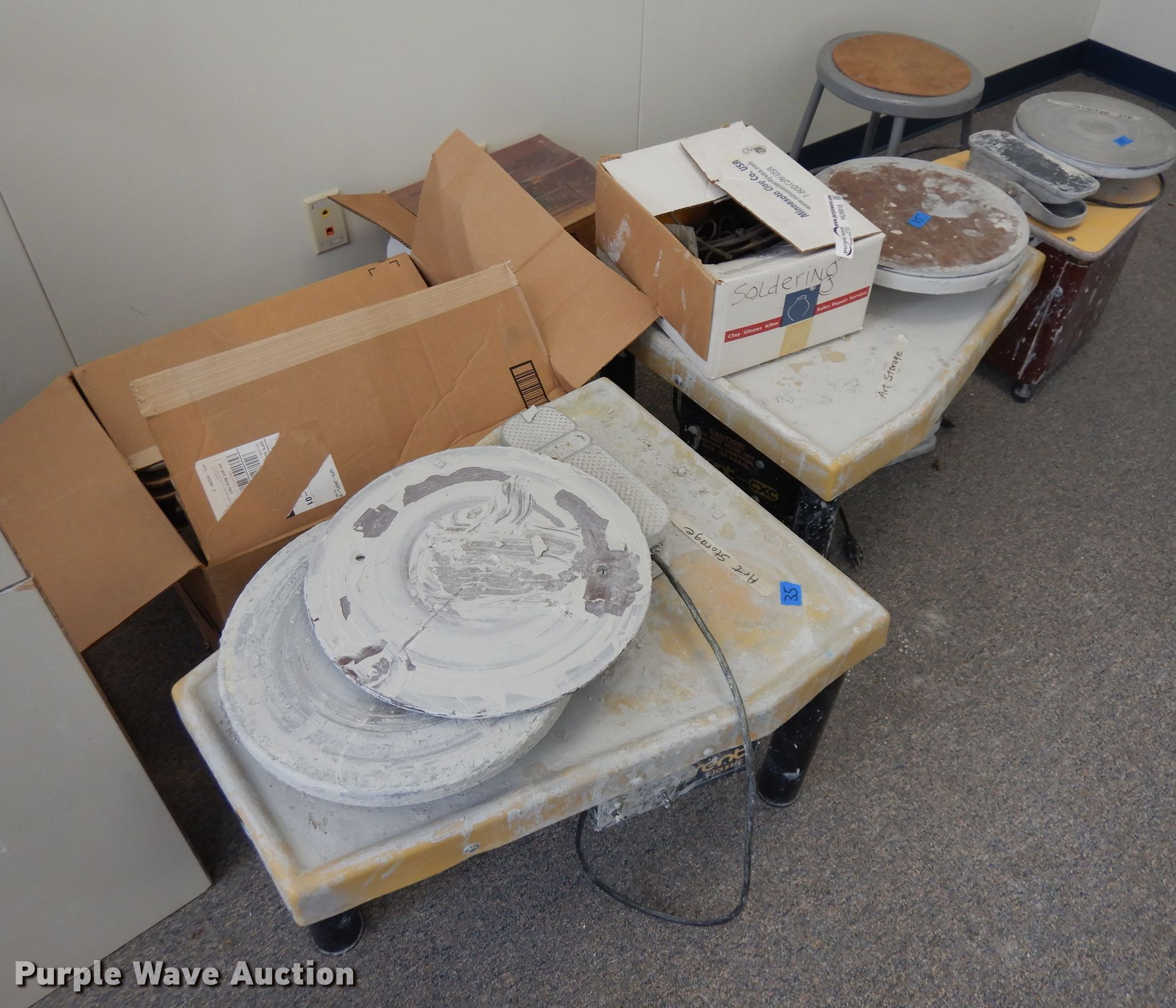 Purple Wave is selling a used Office Supplies and Equip. in Iowa. This item is a (3) pottery wheels with the following: 110V, Variable speed, Art supplies