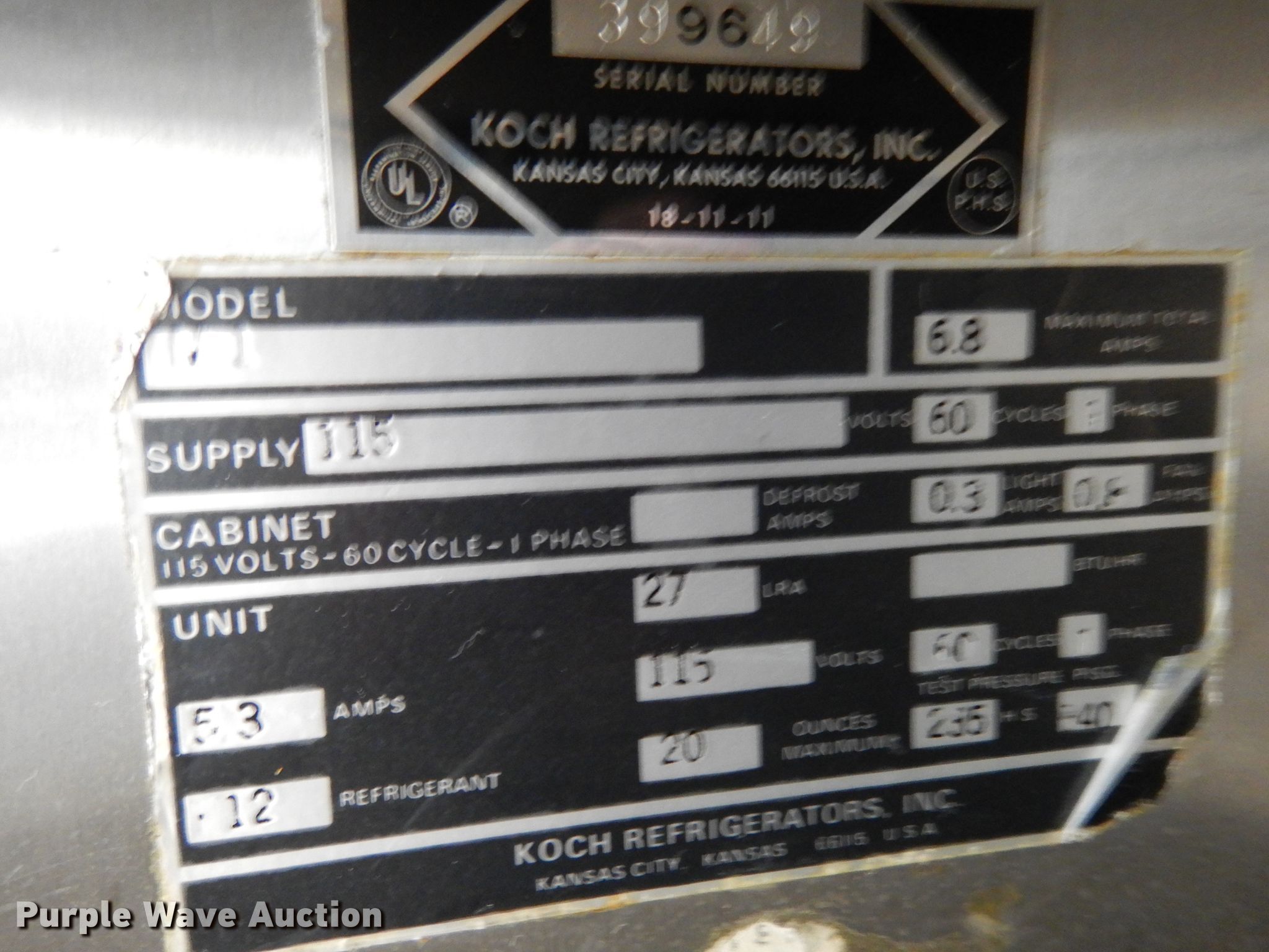 Purple Wave is selling a used Appliances in Iowa. This item is a Koch M1 stainless steel refrigerator with the following: 115V, Single phase, 5.3 amps, Serial 399649