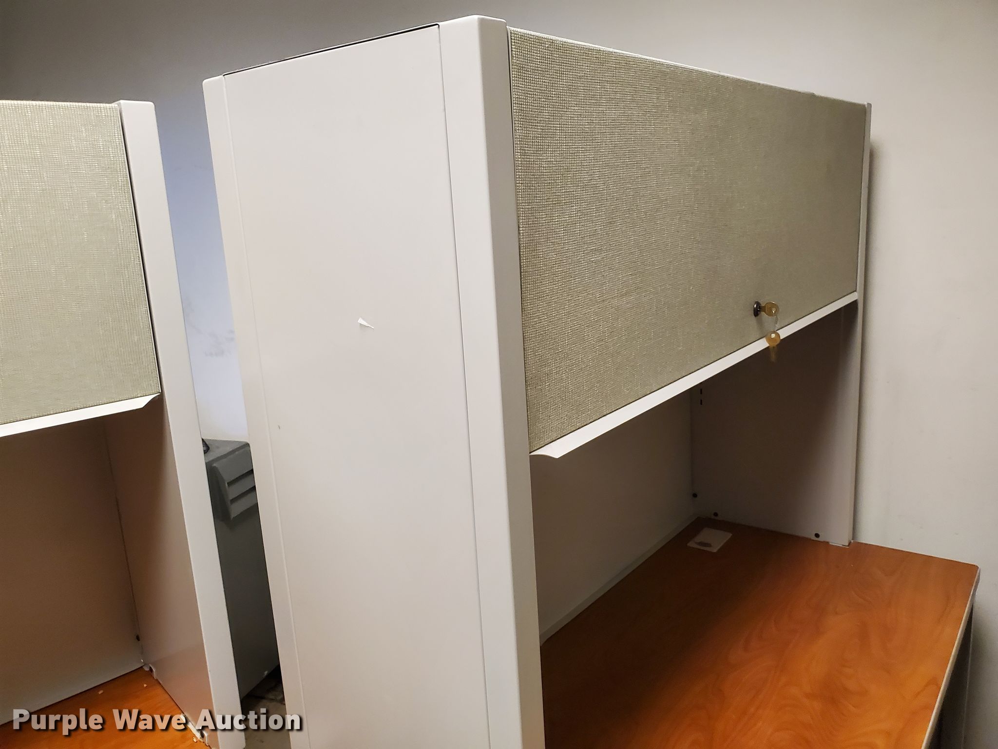 Purple Wave is selling a used Furniture in Colorado. This item is a (2) office desks with the following: Locking overhead cubby