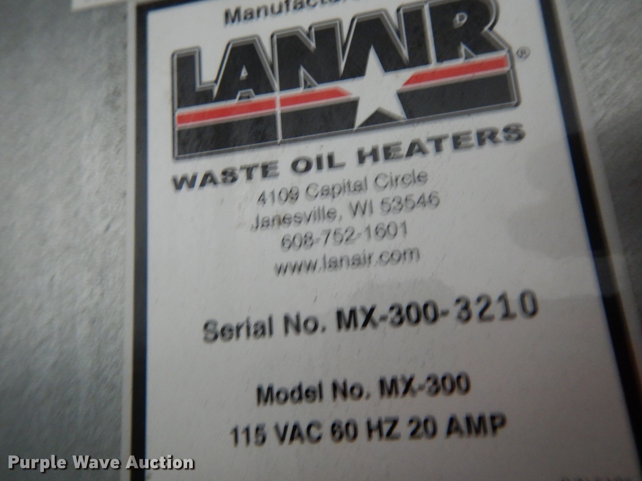 Lanair MX300 waste oil heater. 115V, 300,000 BTU, Tank Model MH25247, Serial R-452664, Serial MX-300-3210. 135 SE Finish Line Dr. Wakarusa, KS 66546