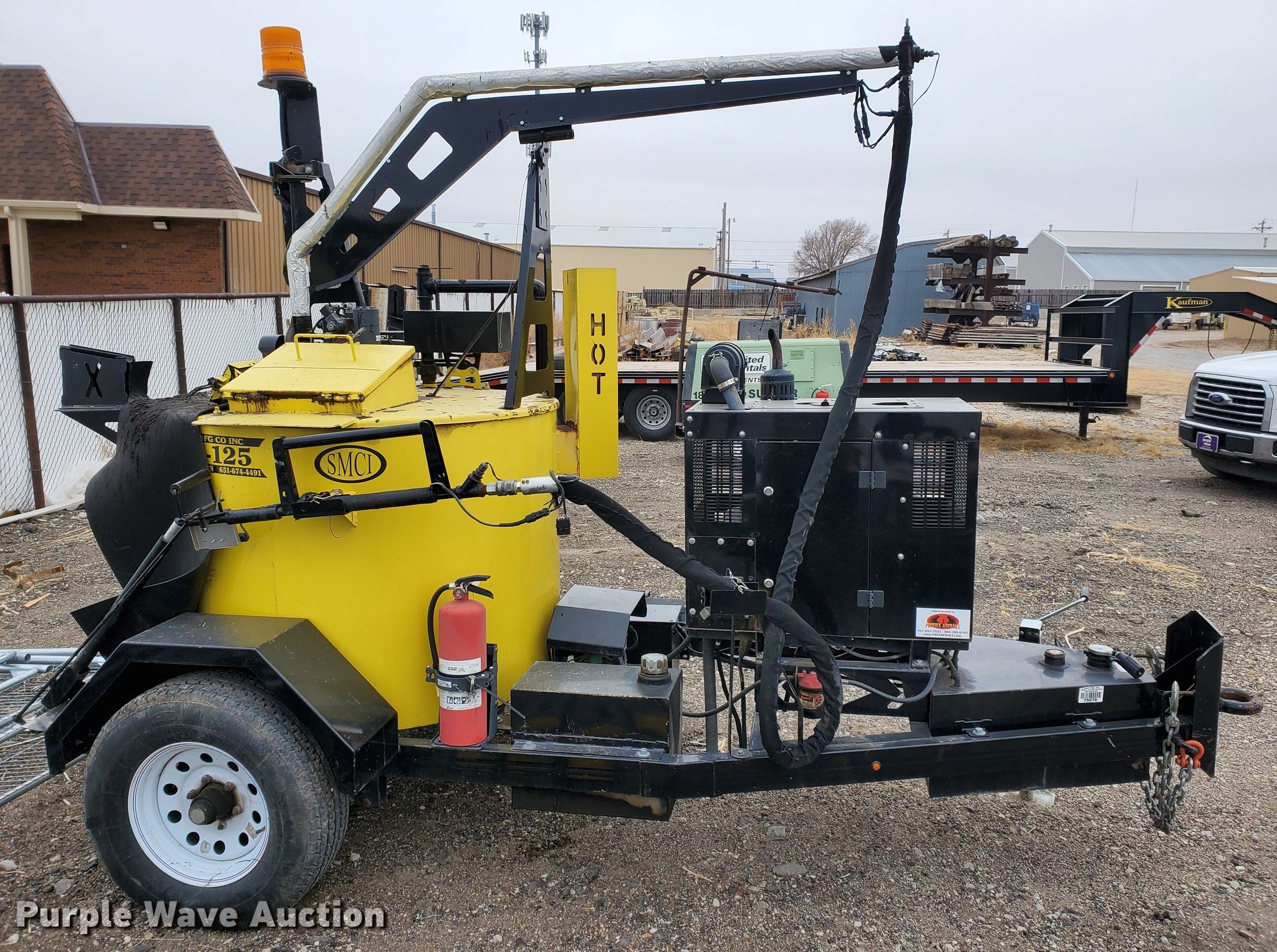 Purple Wave is selling a used Pot Hole Patcher in Kansas. This item is a 2013 Stepp OJK-125 melter applicator with the following: Engine hours: 365, Controller hours: 363, Kubota 0.599L two cylinder diesel engine, Diesel fired burner, Agitator, 125 gallon capacity, 225/75R15 tires