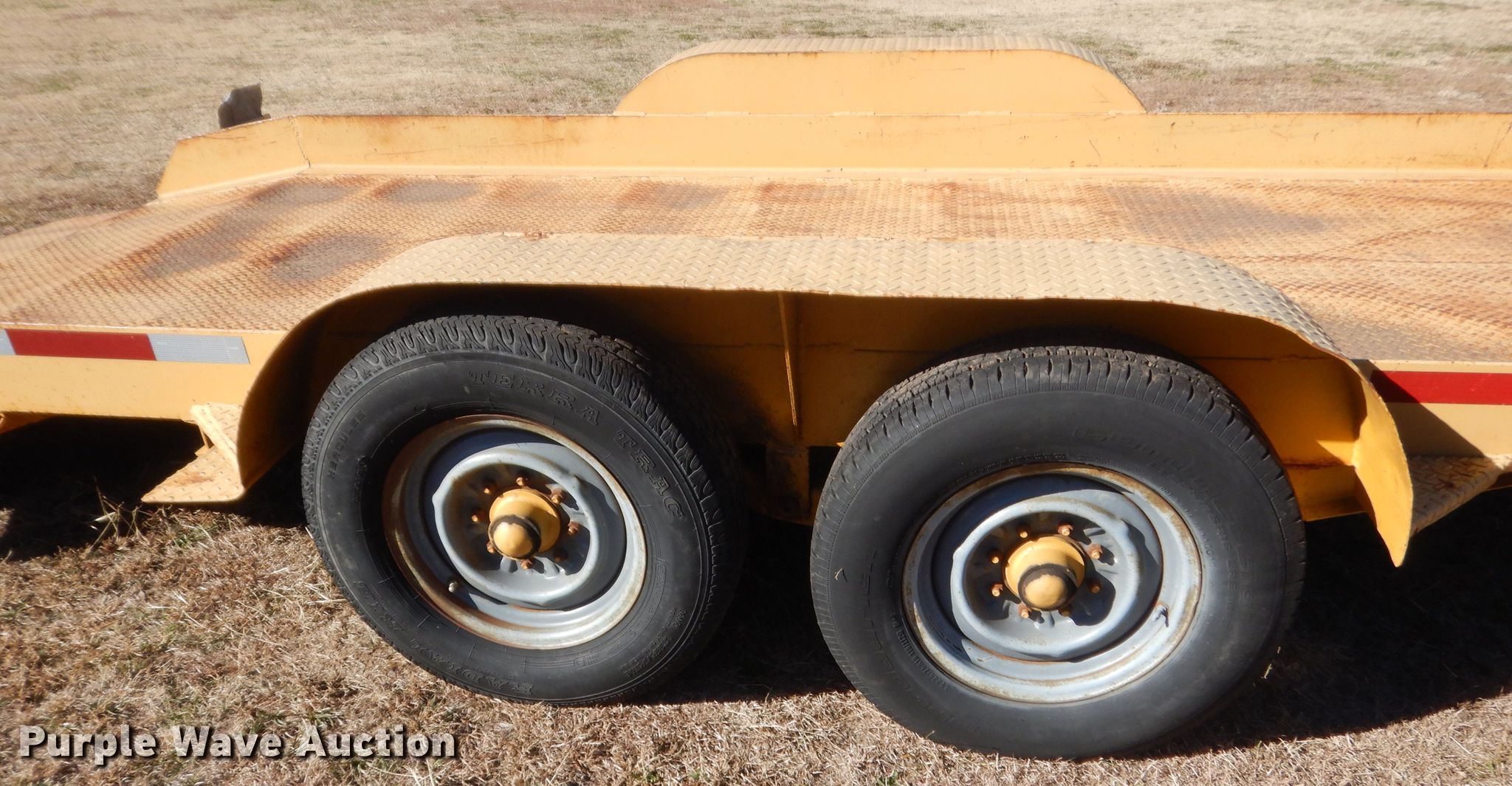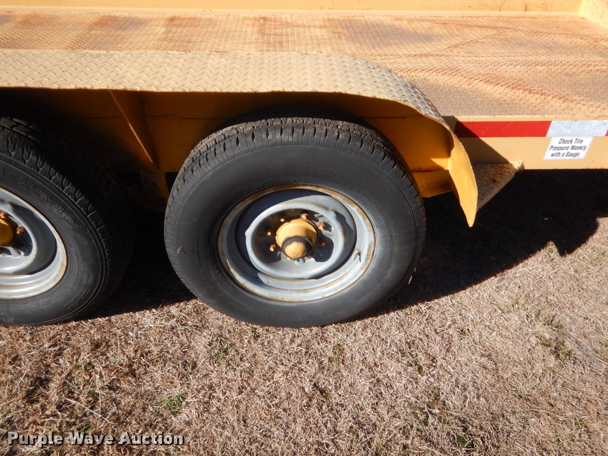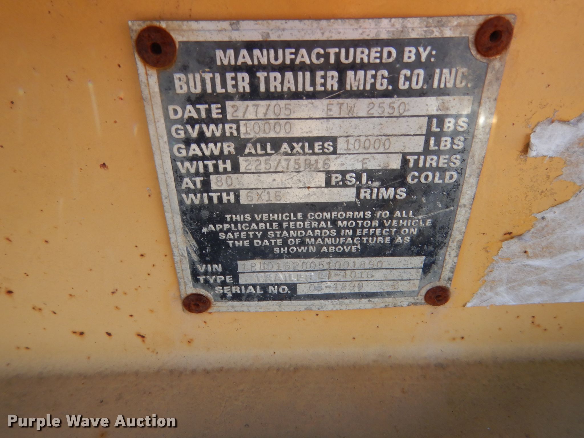 Purple Wave is selling a used Equip. Trailer in Oklahoma. This item is a 2005 Butler ETW2550 tilt deck equipment trailer with the following: 22'L x 95"W overall, 16'L x 75"W steel deck, Single leg landing gear, Spring suspension, Tandem axle, 225/75R16 tires, GVWR 10,000 lbs