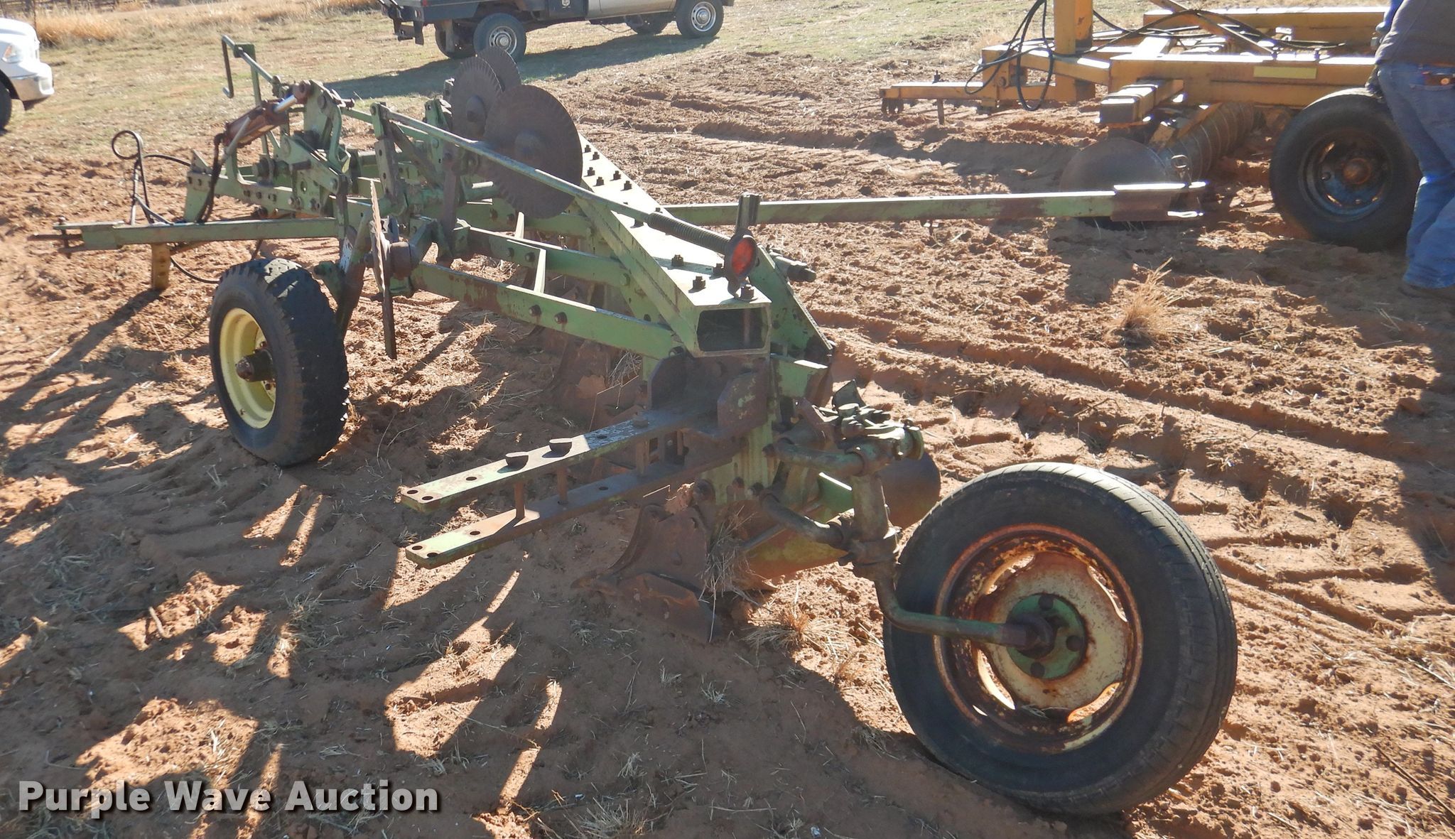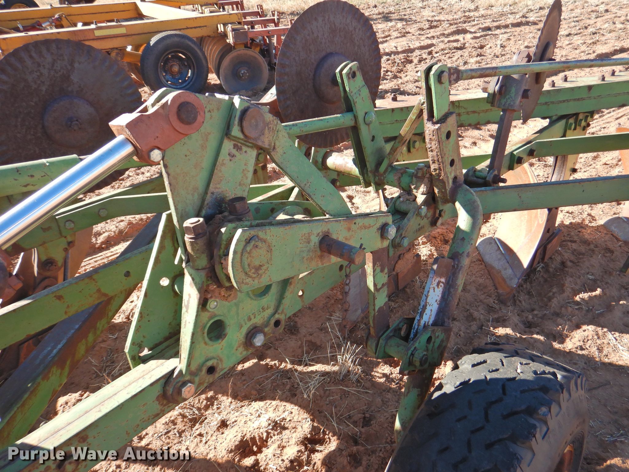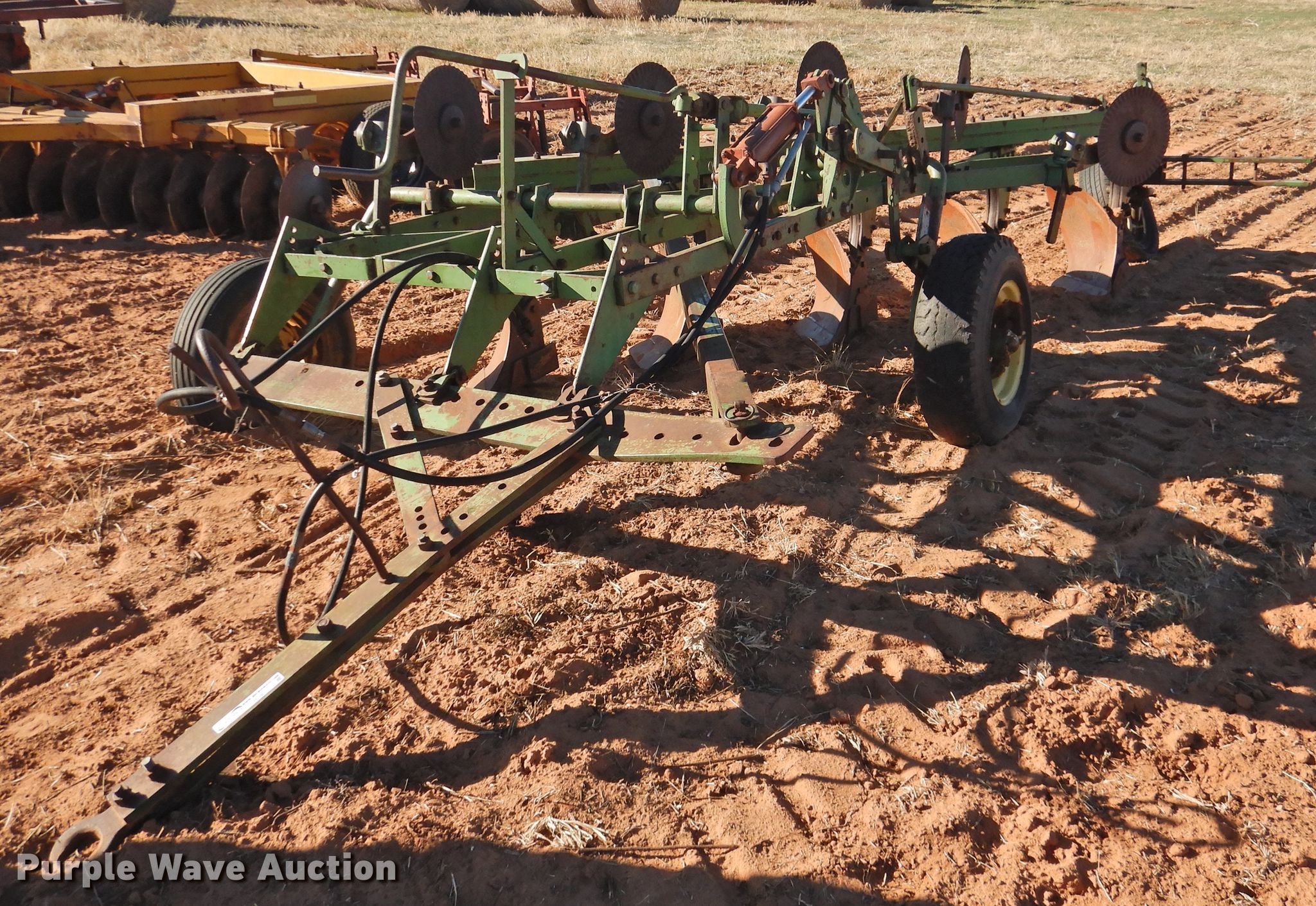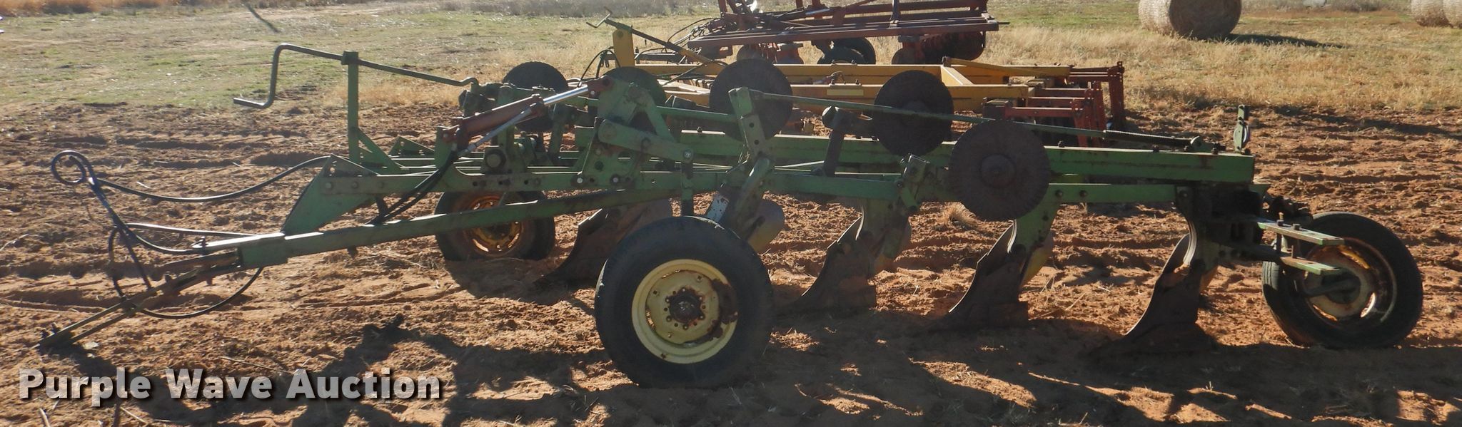 Purple Wave is selling a used Plow in Oklahoma. This item is a John Deere five bottom plow with the following: 10'6"W, (4) 15" coulters, Manual leveler, Hydraulic lift, 17.00-15LT tires