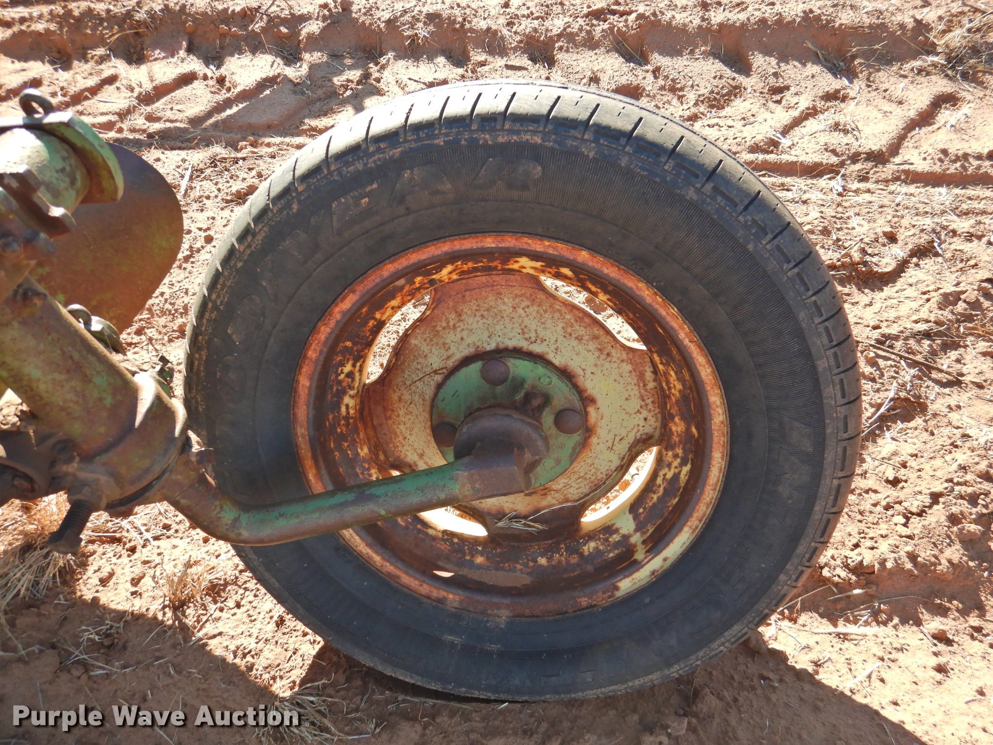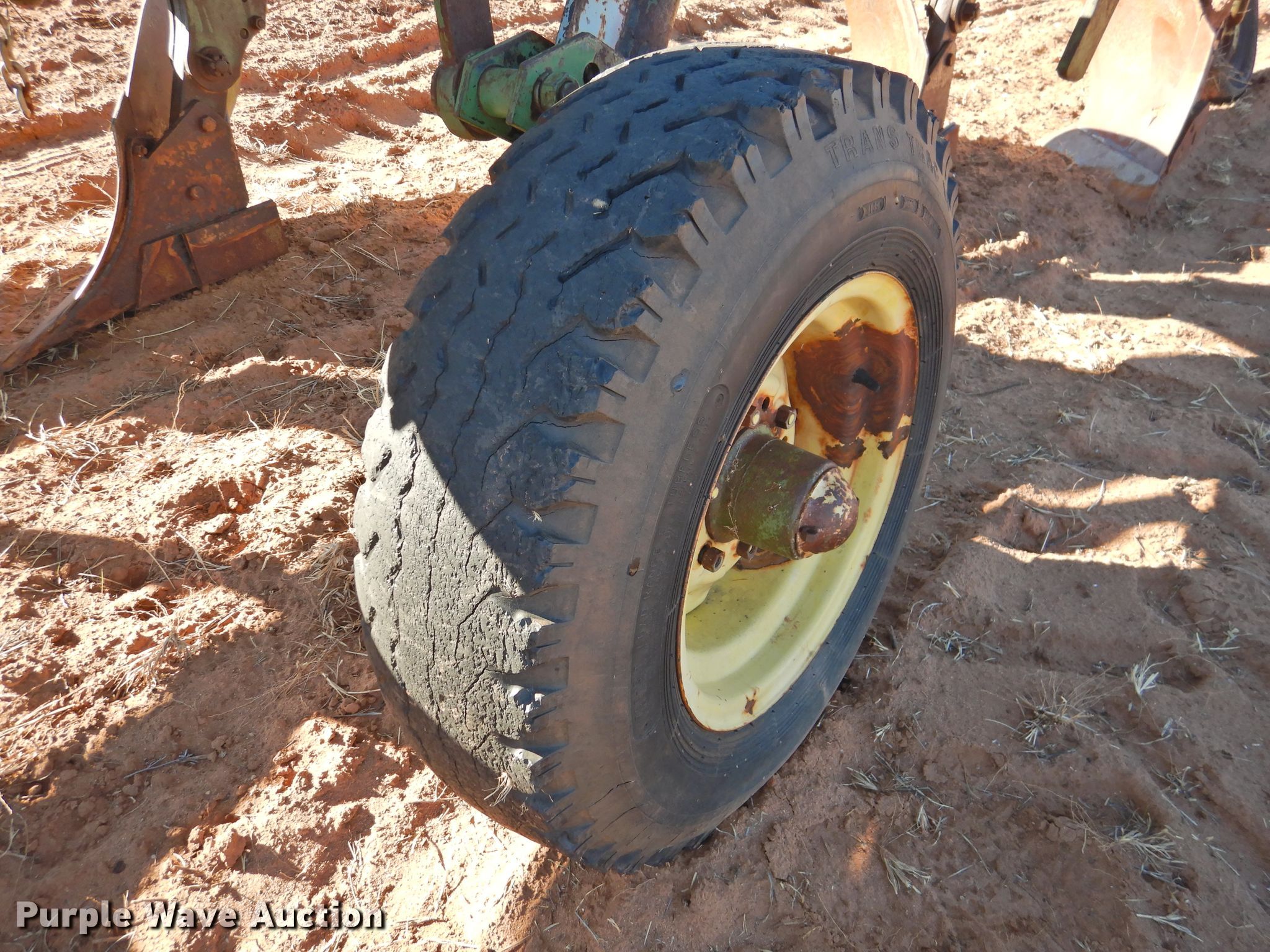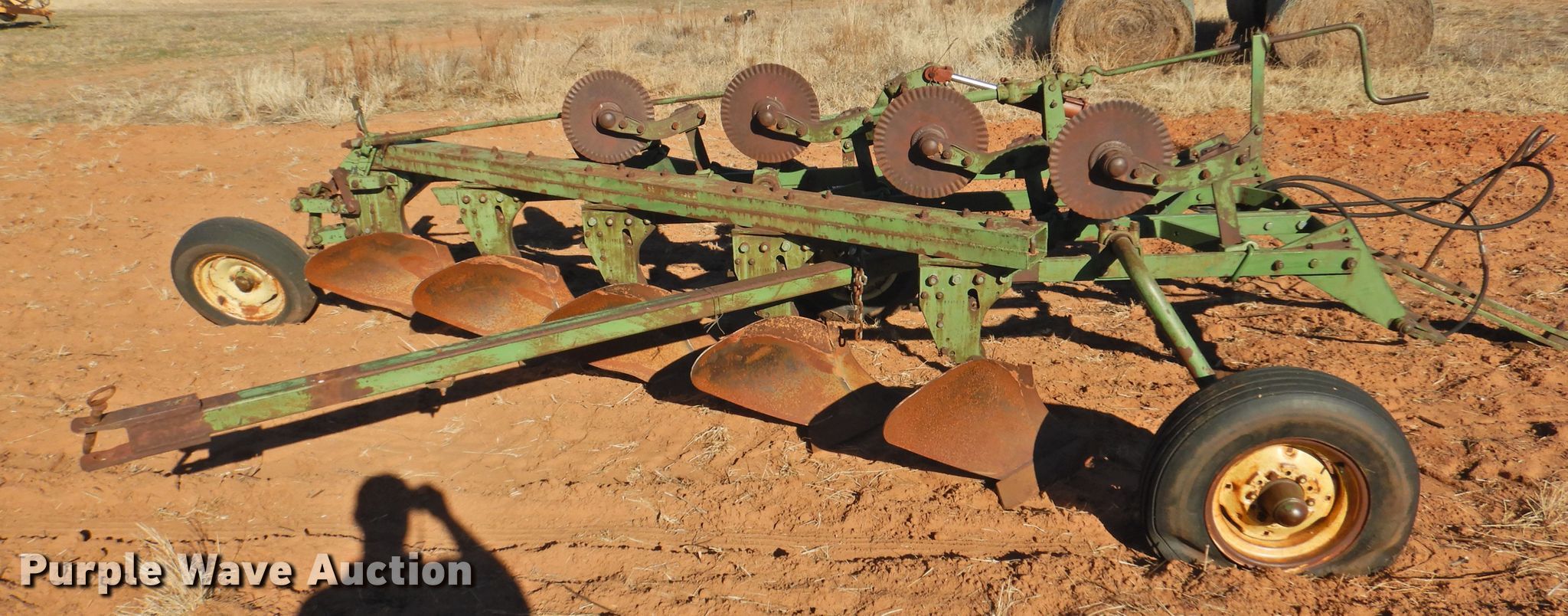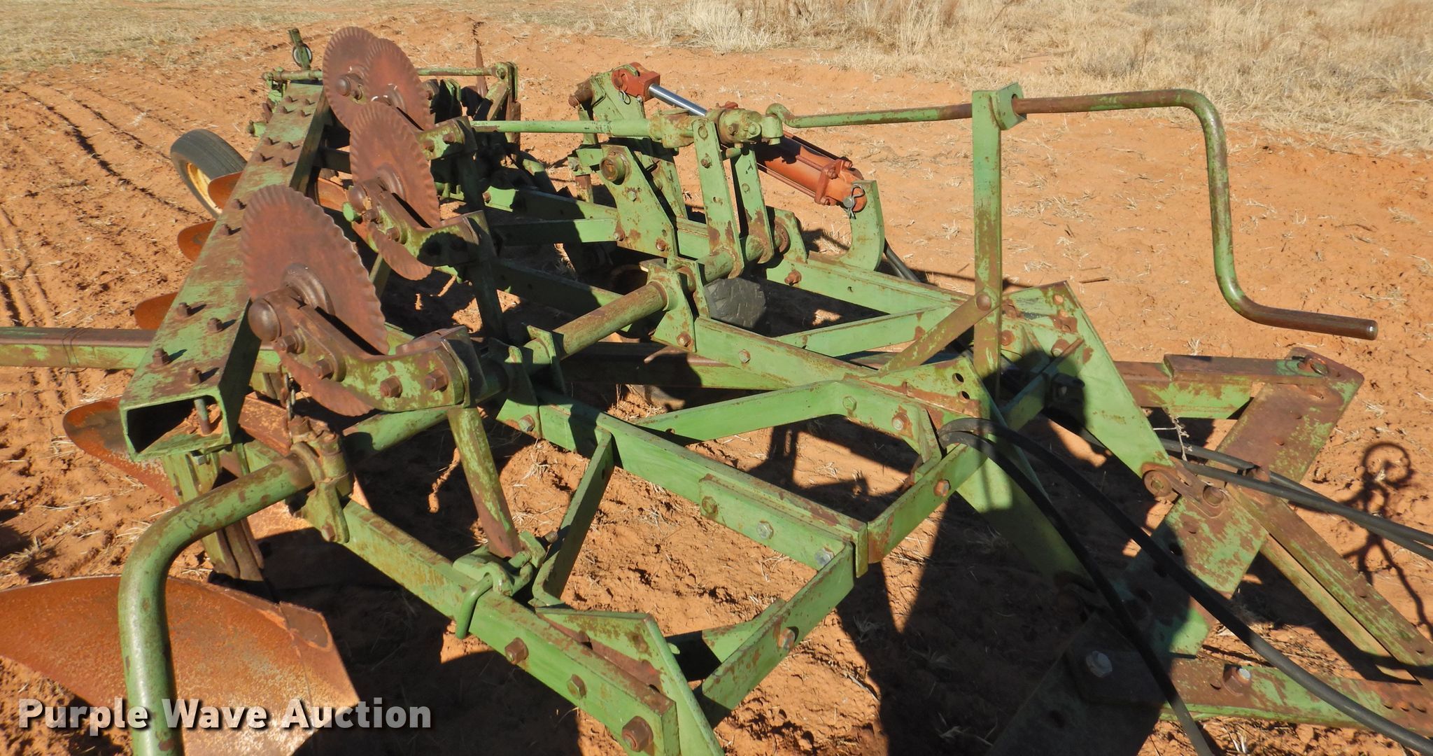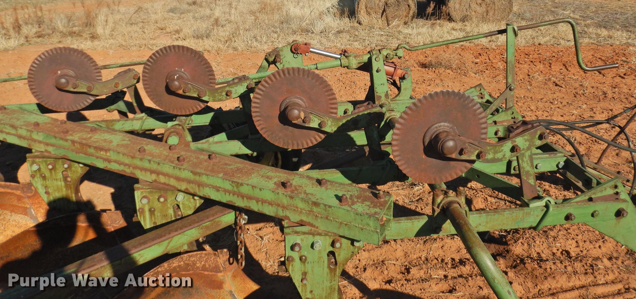 Purple Wave is selling a used Plow in Oklahoma. This item is a John Deere five bottom plow with the following: 10'6"W, (4) 15" coulters, Manual leveler, Hydraulic lift, 17.00-15LT tires