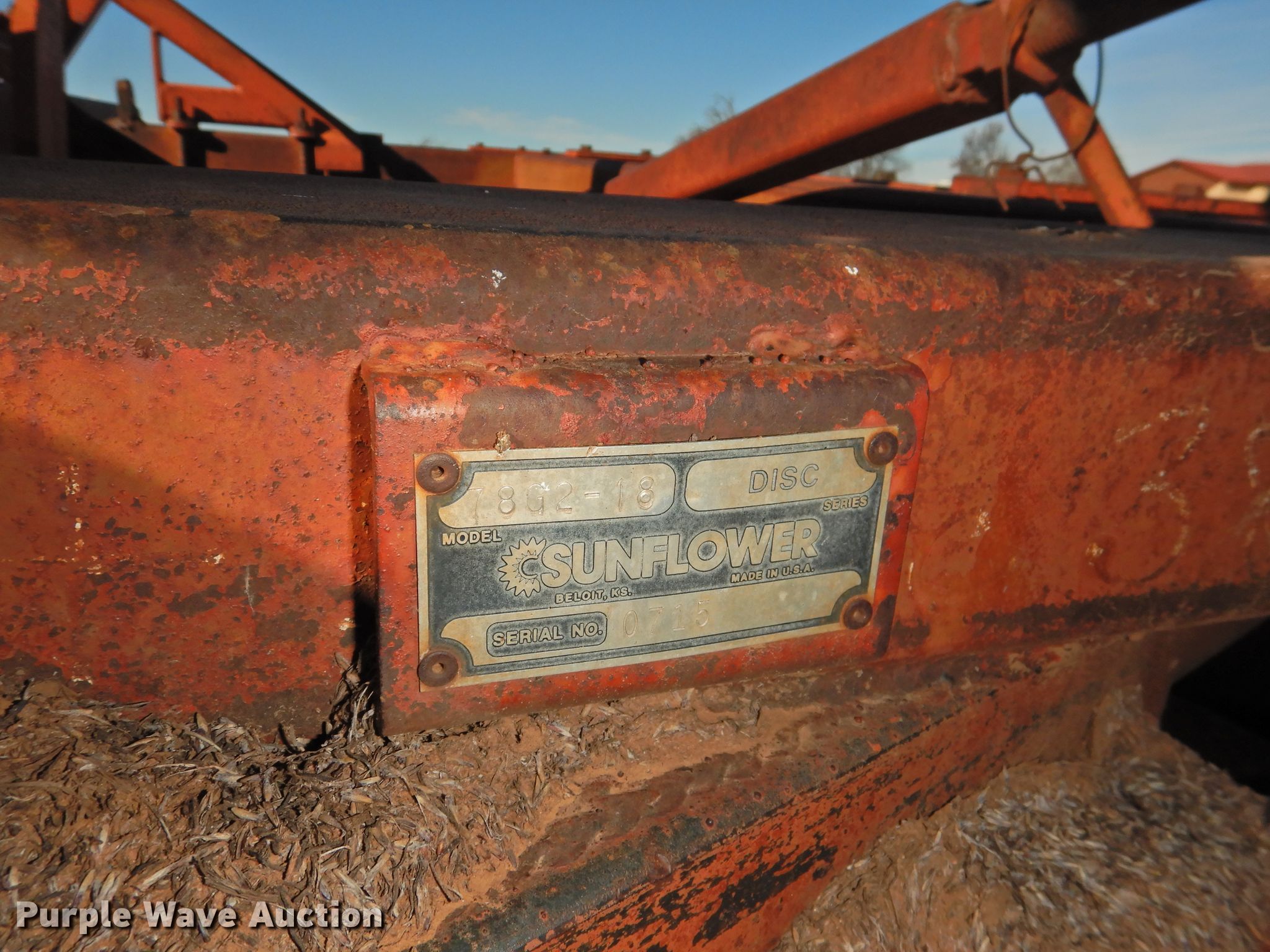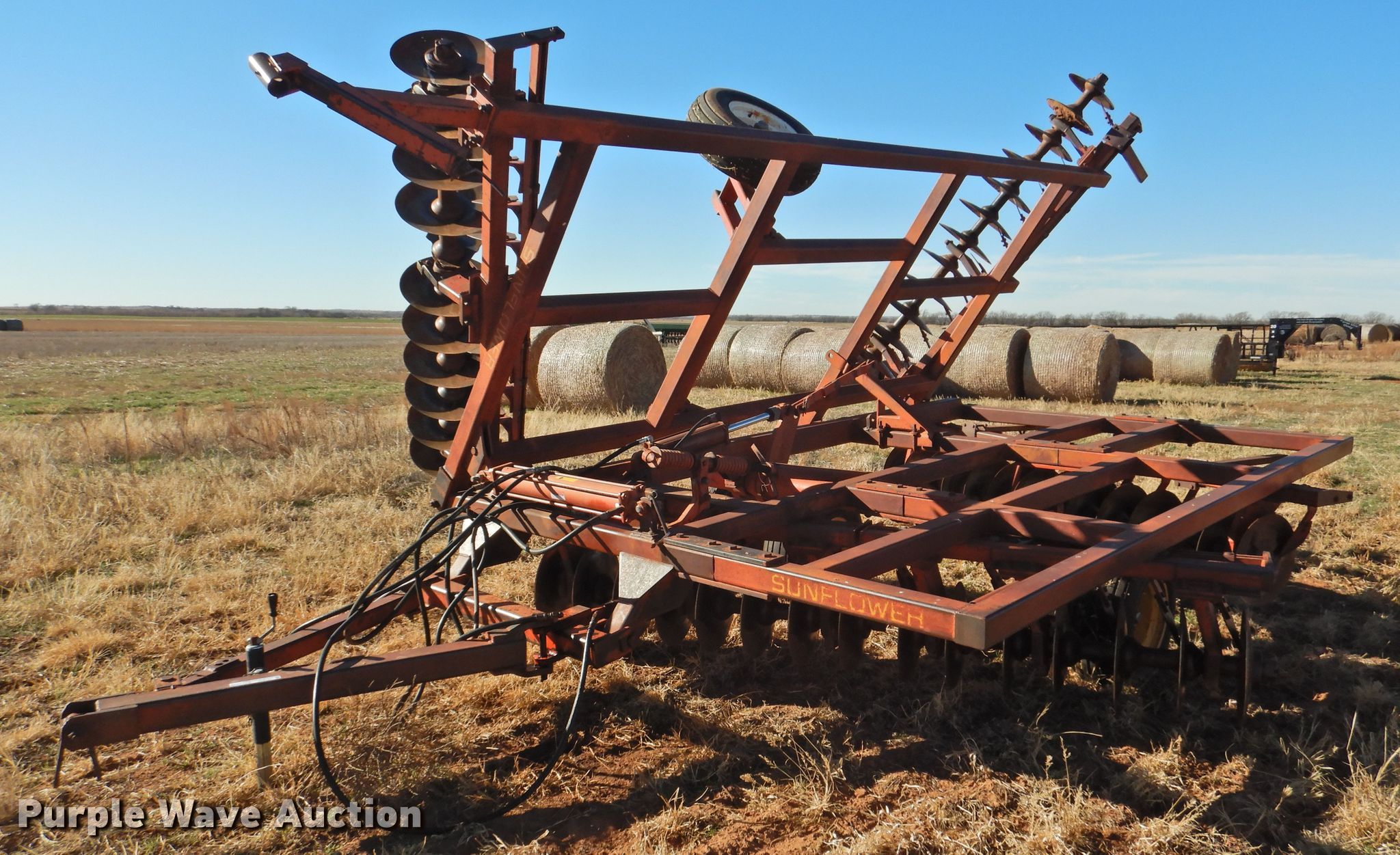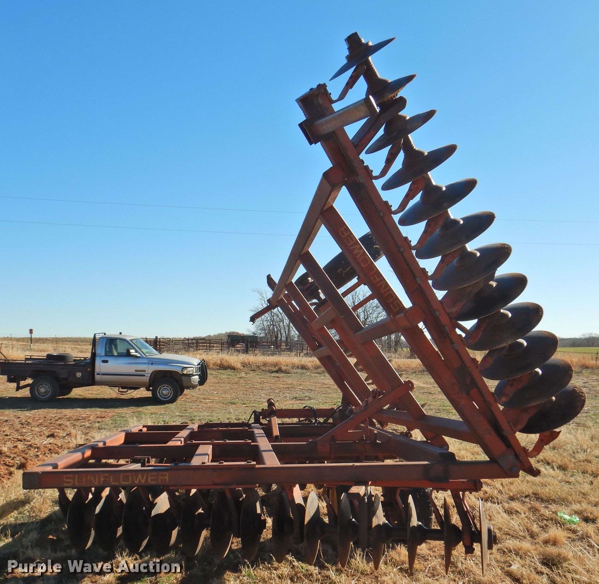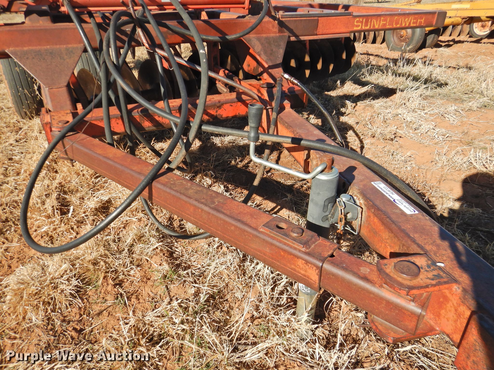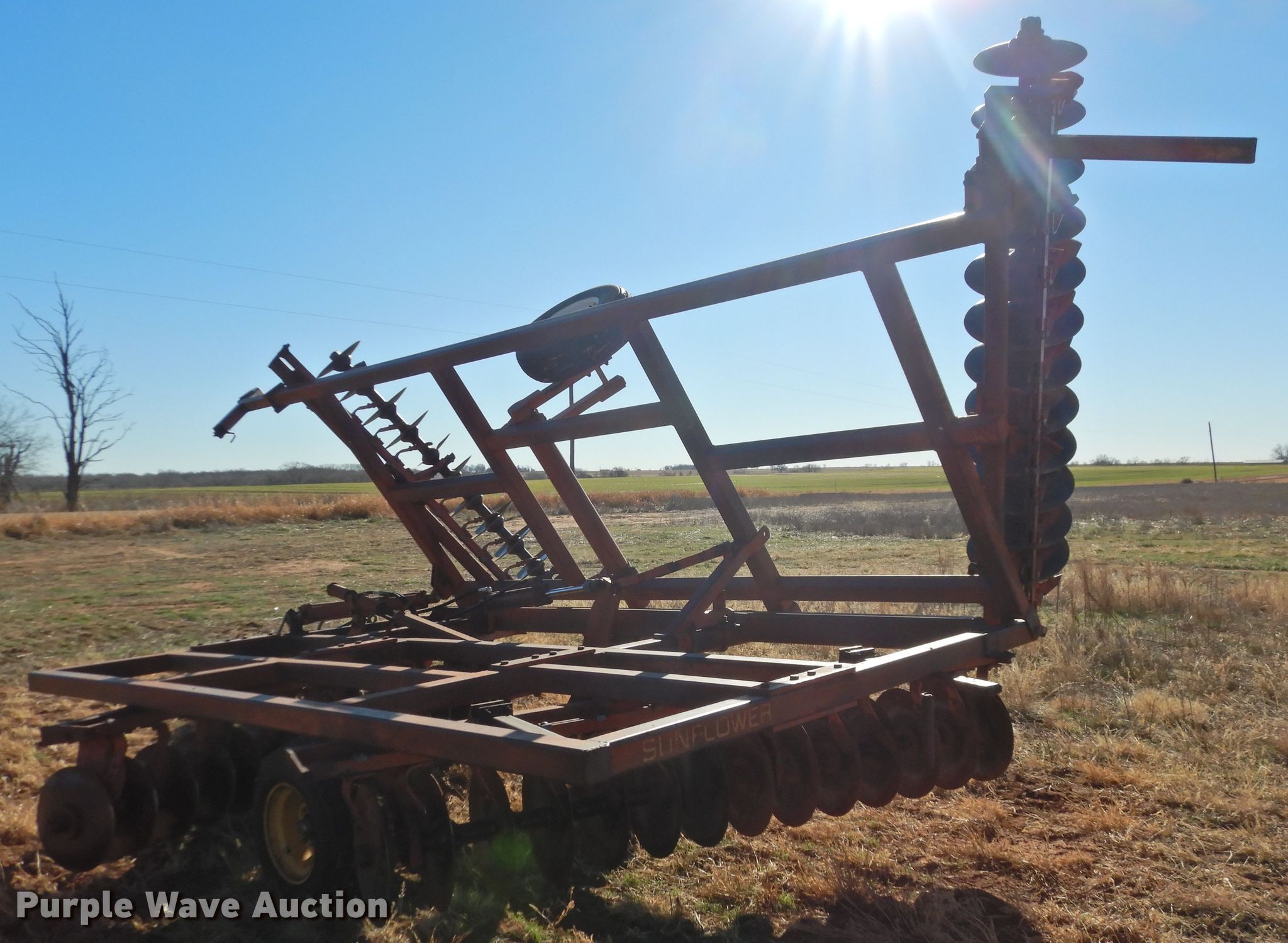 Purple Wave is selling a used Disk in Oklahoma. This item is a Sunflower 78G2-18 off-set disk with the following: 18'W, 19" diameter disks, Disk scrapers, Manual leveler, Hydraulic lift and fold, 11L-15 tires, One hub, wheel, and tire missing, Serial 0715