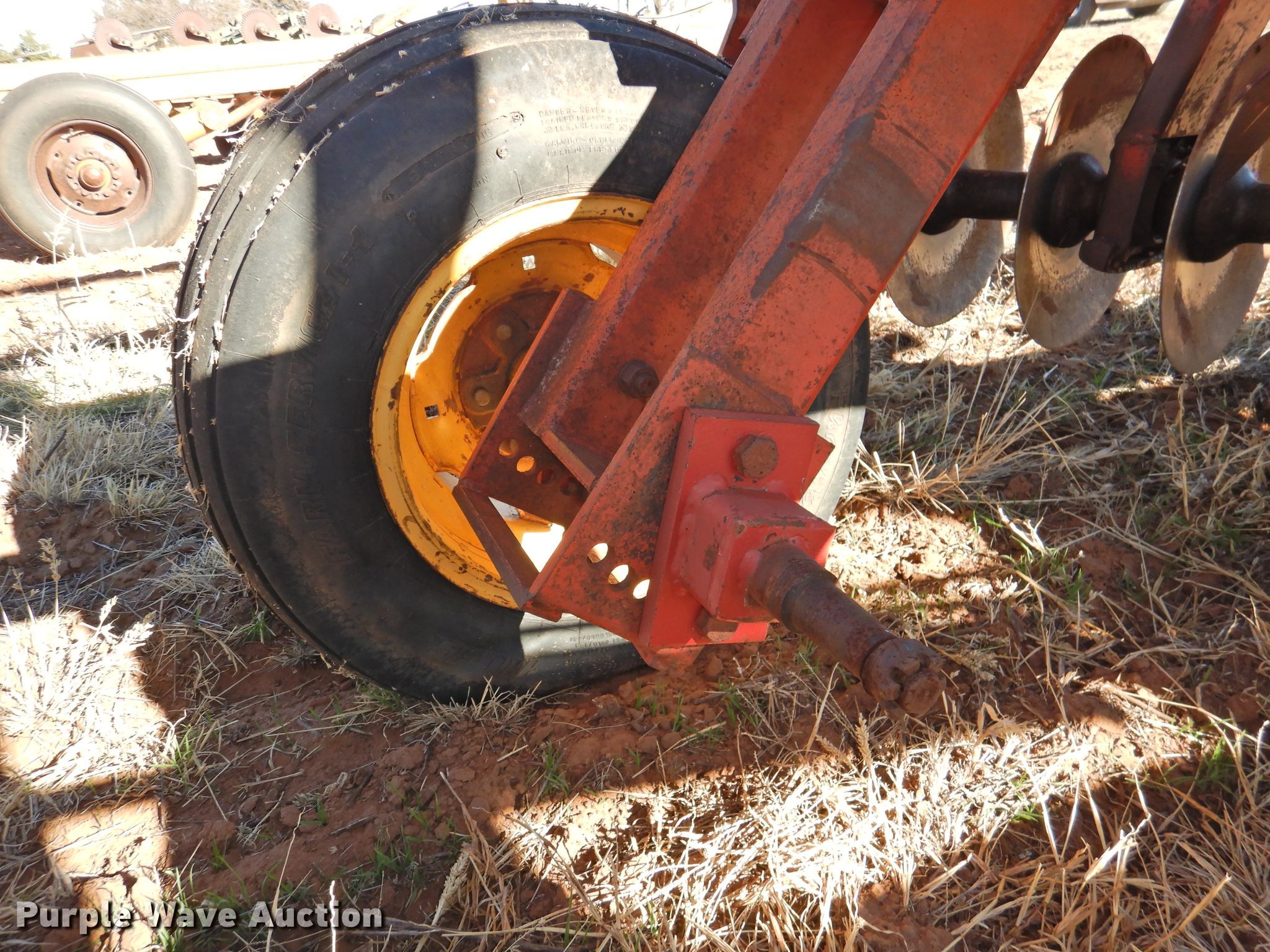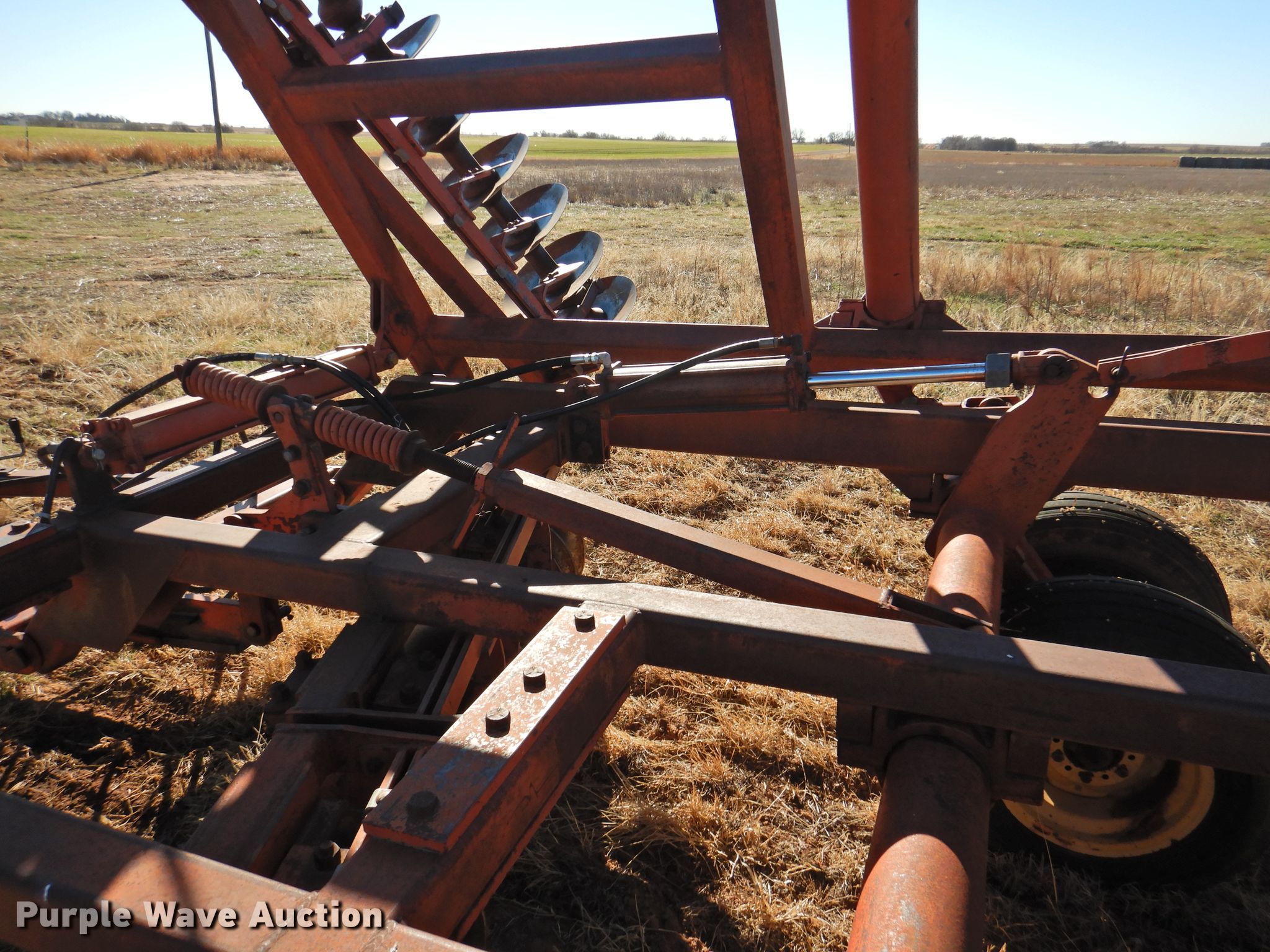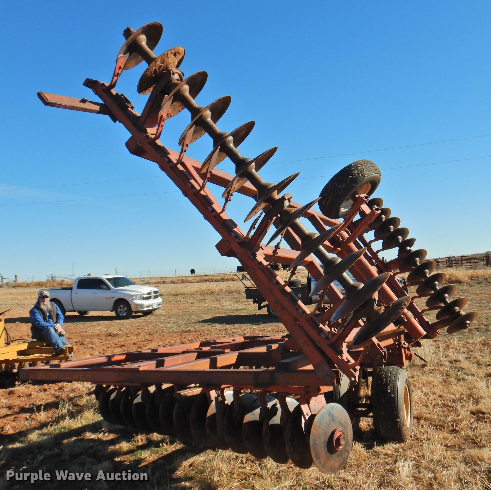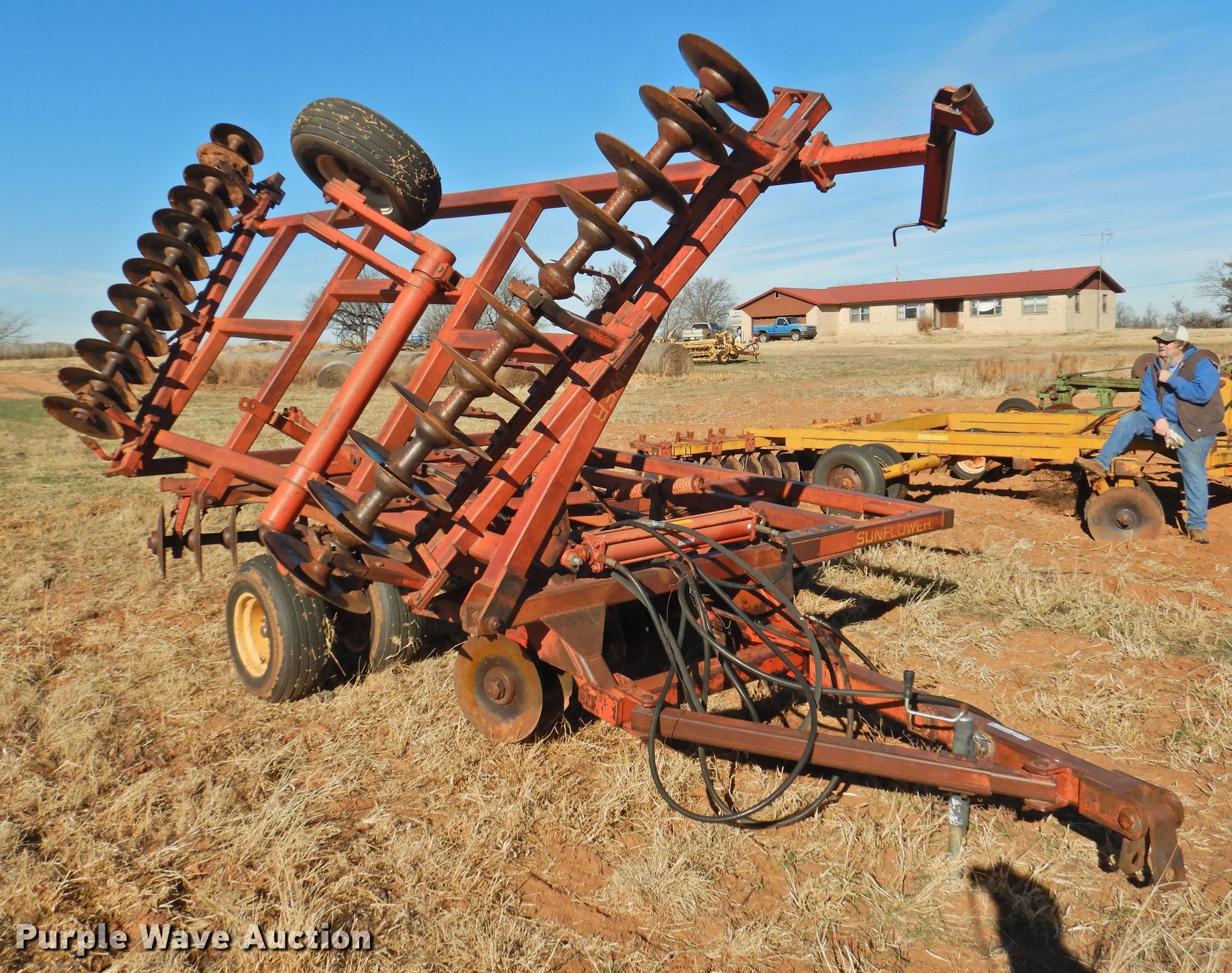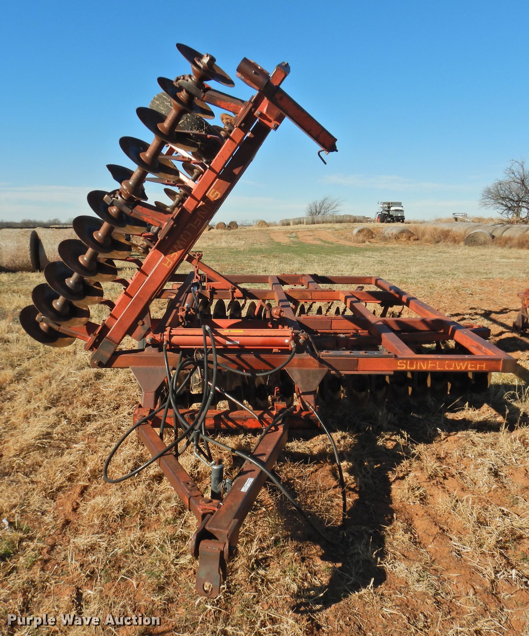 Purple Wave is selling a used Disk in Oklahoma. This item is a Sunflower 78G2-18 off-set disk with the following: 18'W, 19" diameter disks, Disk scrapers, Manual leveler, Hydraulic lift and fold, 11L-15 tires, One hub, wheel, and tire missing, Serial 0715