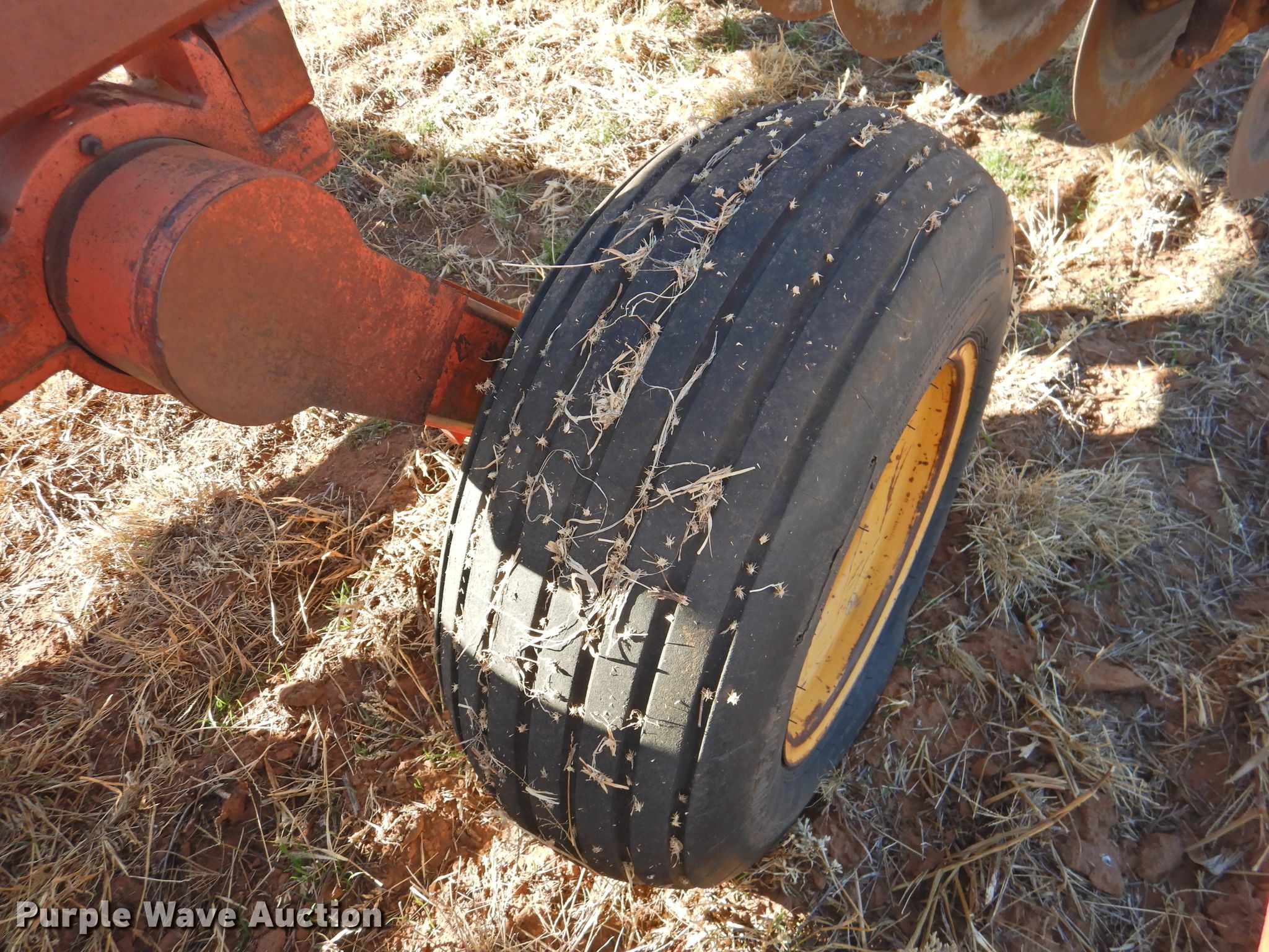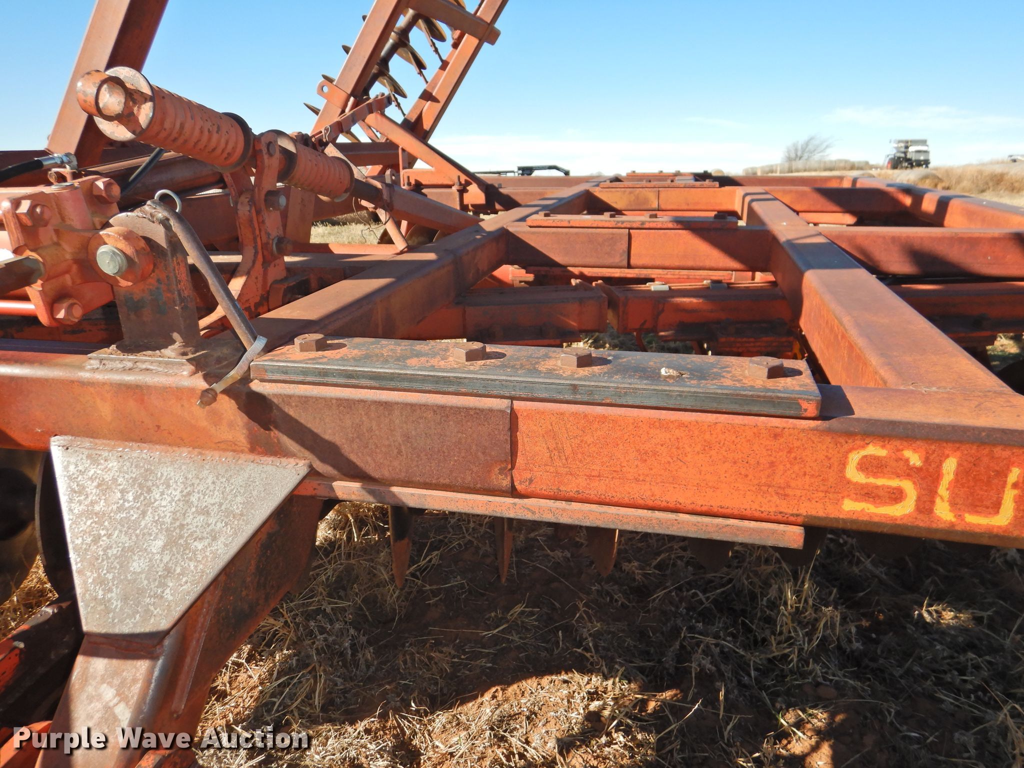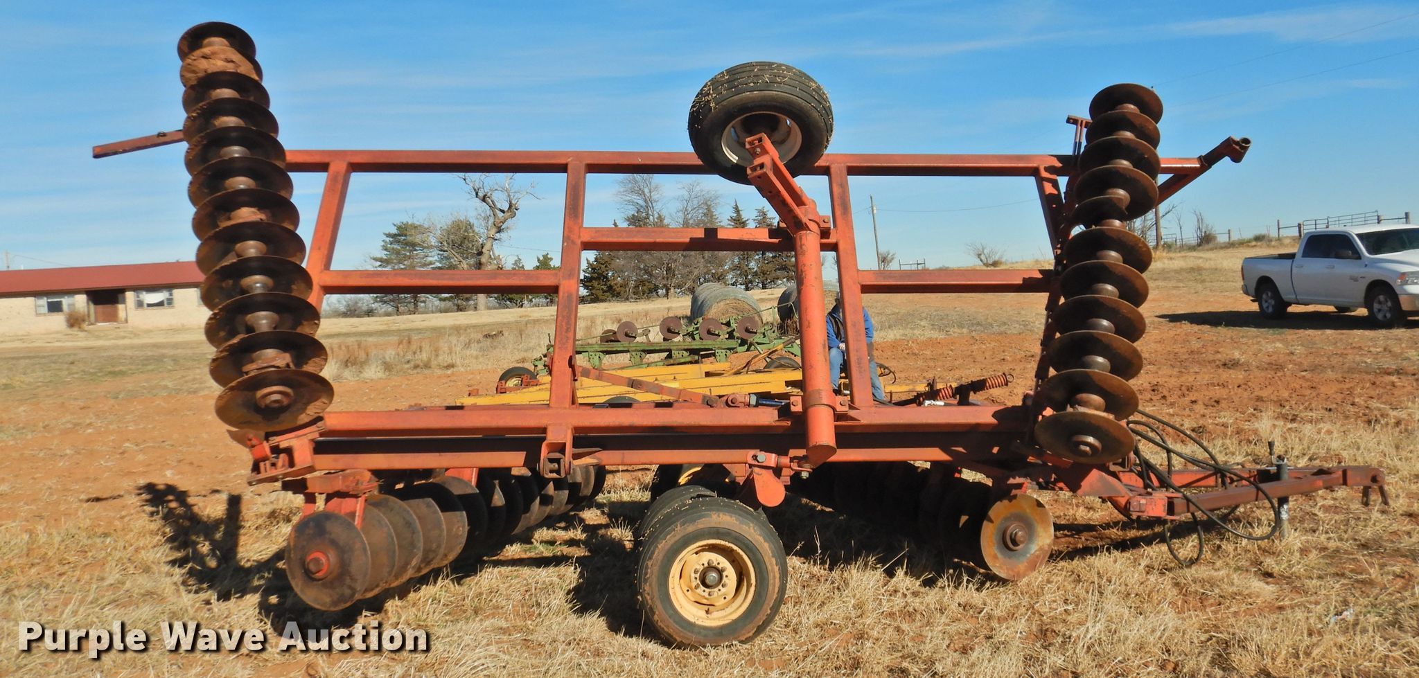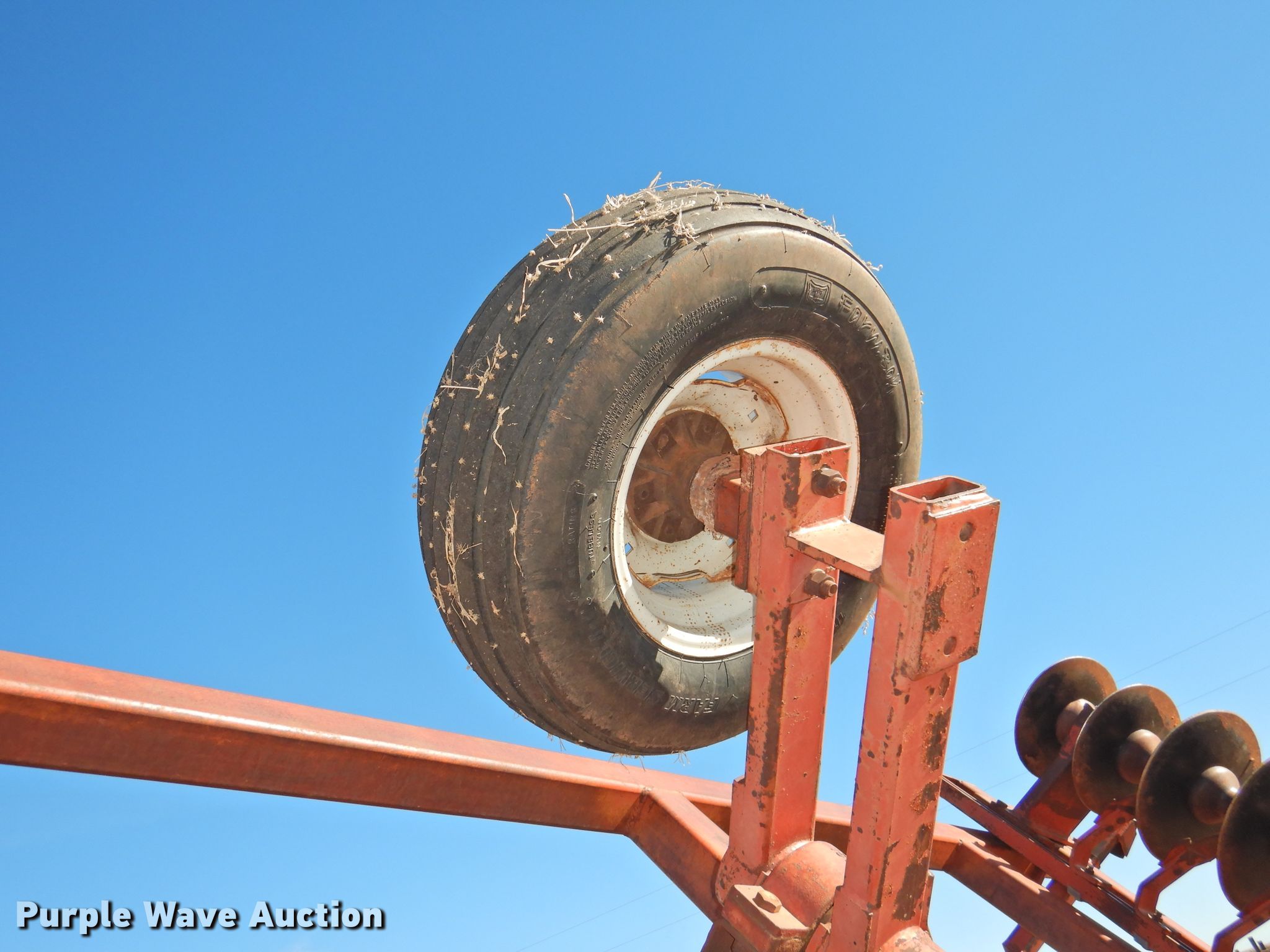 Purple Wave is selling a used Disk in Oklahoma. This item is a Sunflower 78G2-18 off-set disk with the following: 18'W, 19" diameter disks, Disk scrapers, Manual leveler, Hydraulic lift and fold, 11L-15 tires, One hub, wheel, and tire missing, Serial 0715