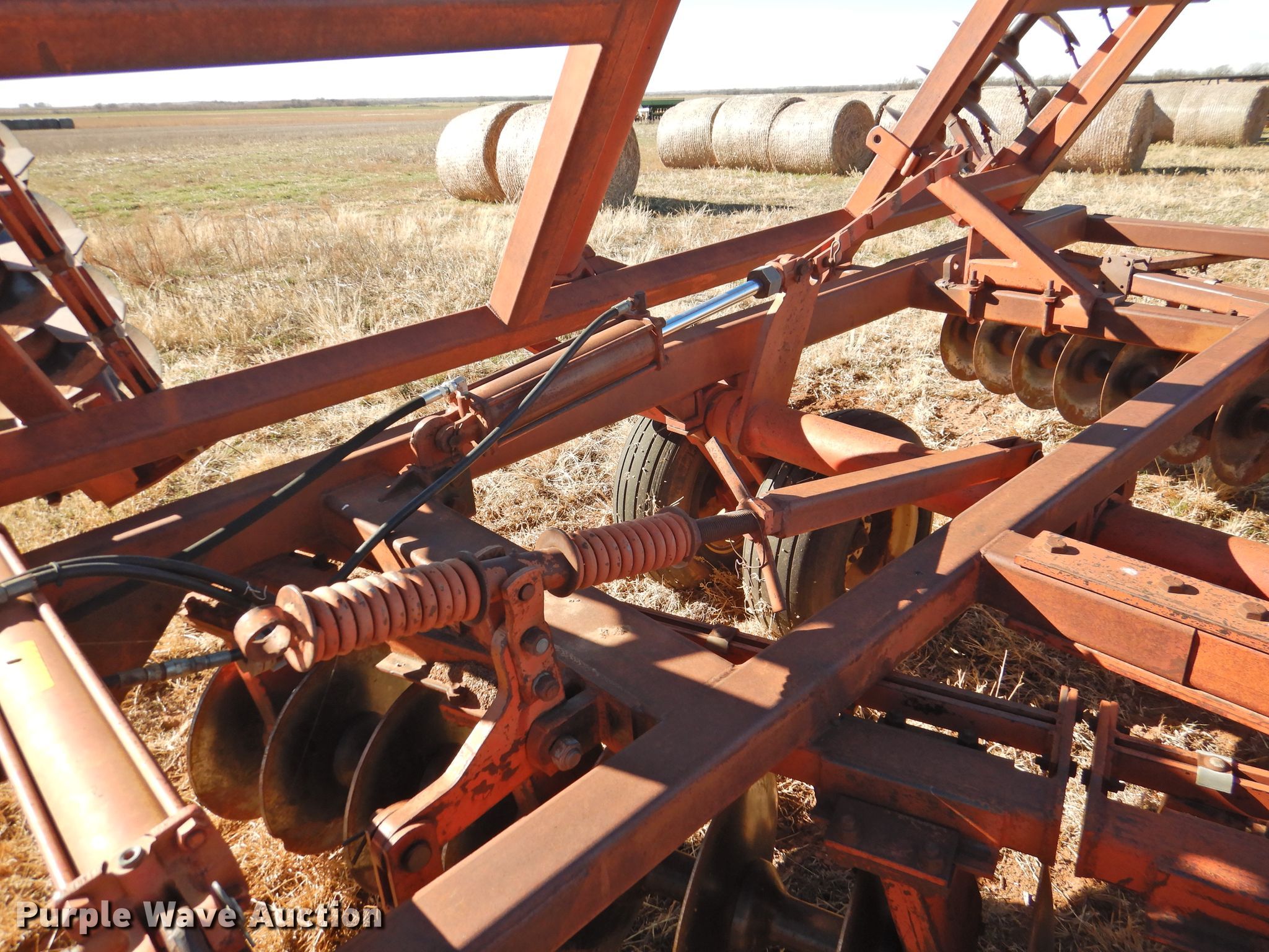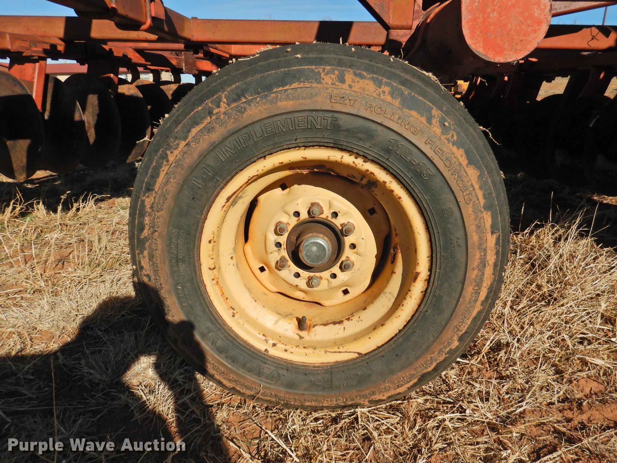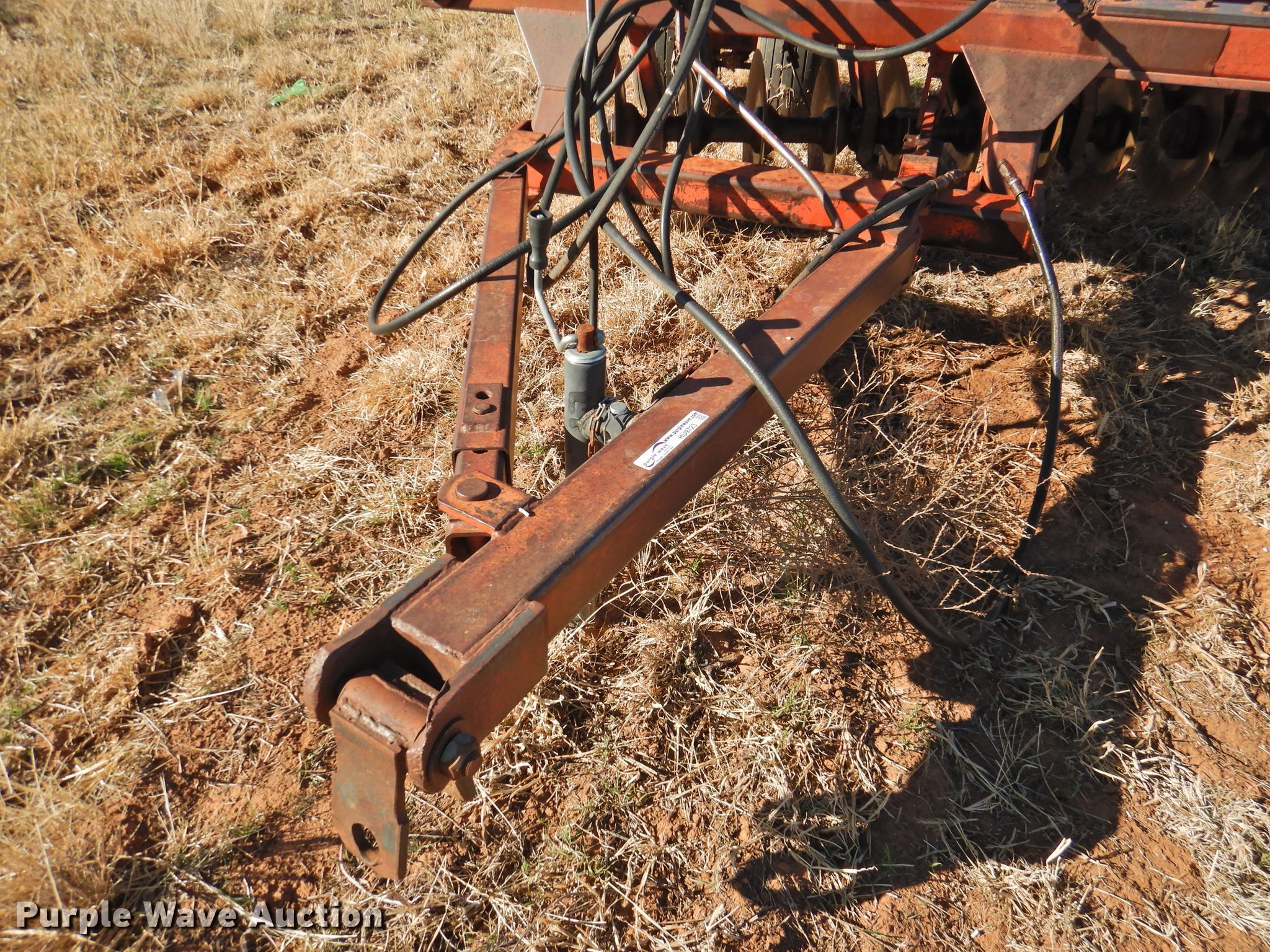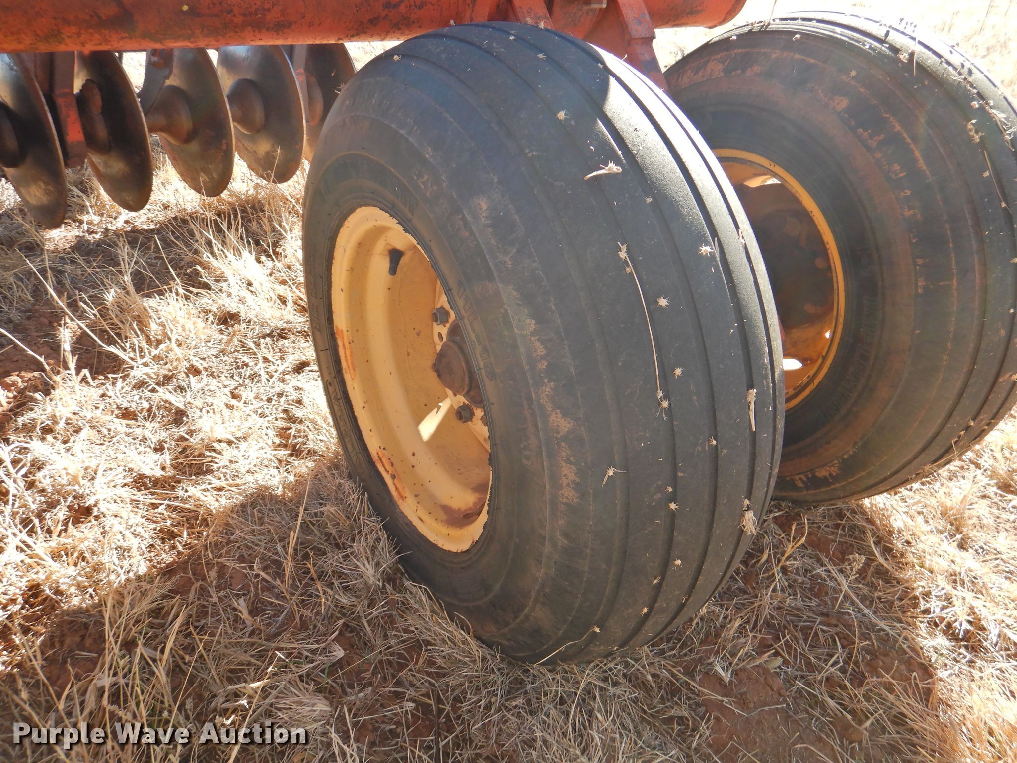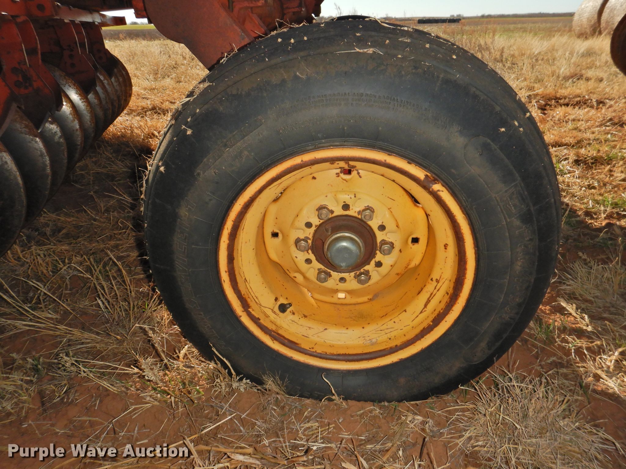Purple Wave is selling a used Disk in Oklahoma. This item is a Sunflower 78G2-18 off-set disk with the following: 18'W, 19" diameter disks, Disk scrapers, Manual leveler, Hydraulic lift and fold, 11L-15 tires, One hub, wheel, and tire missing, Serial 0715