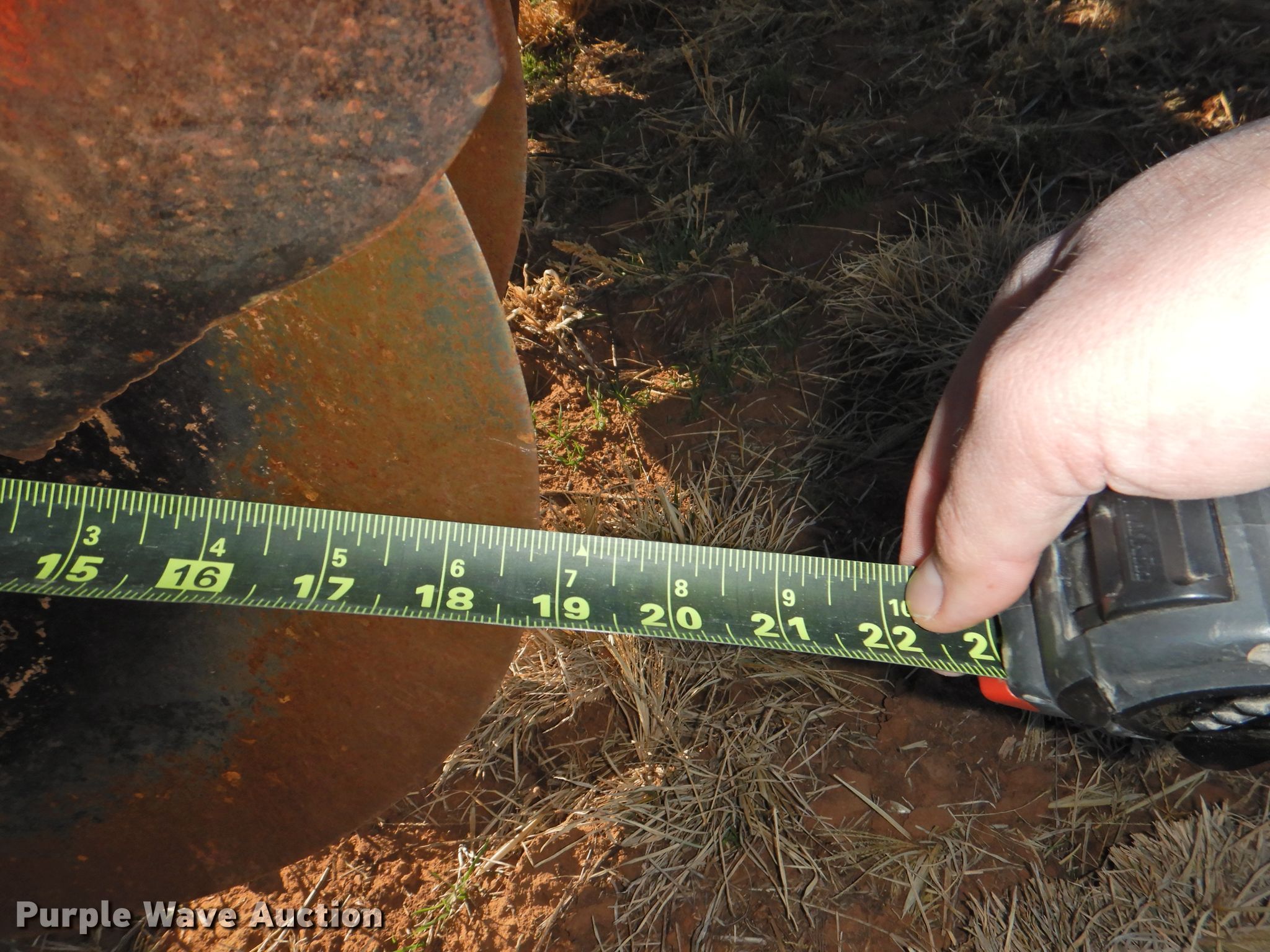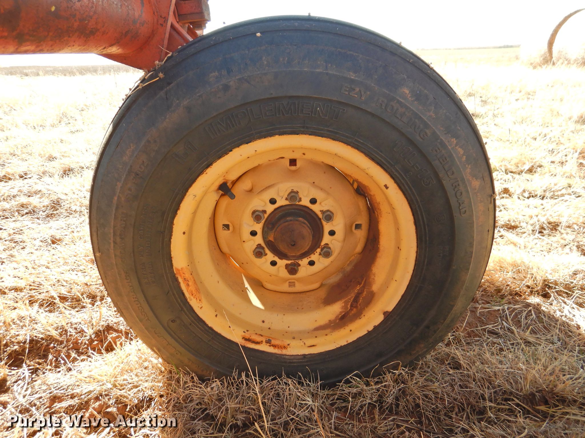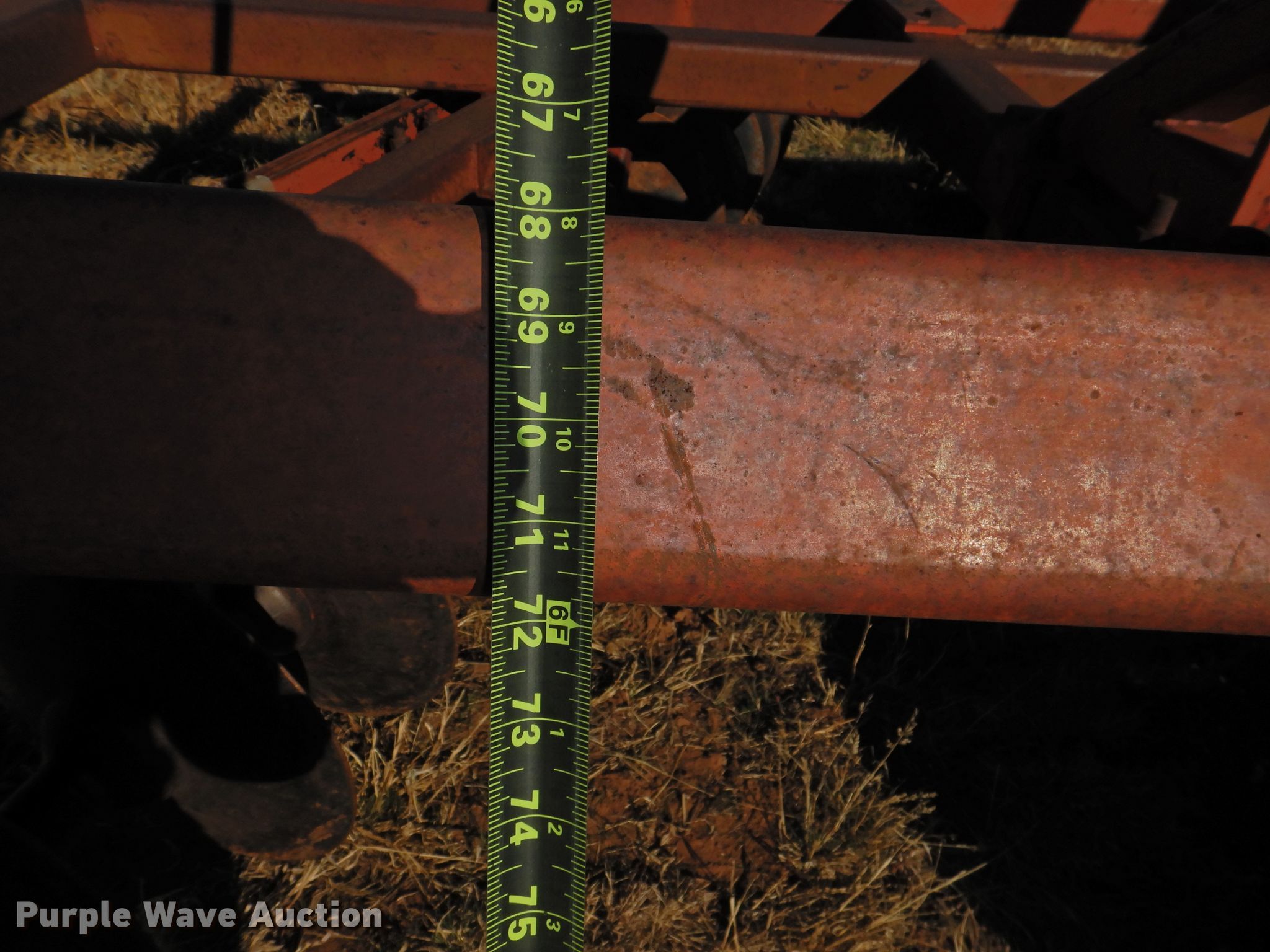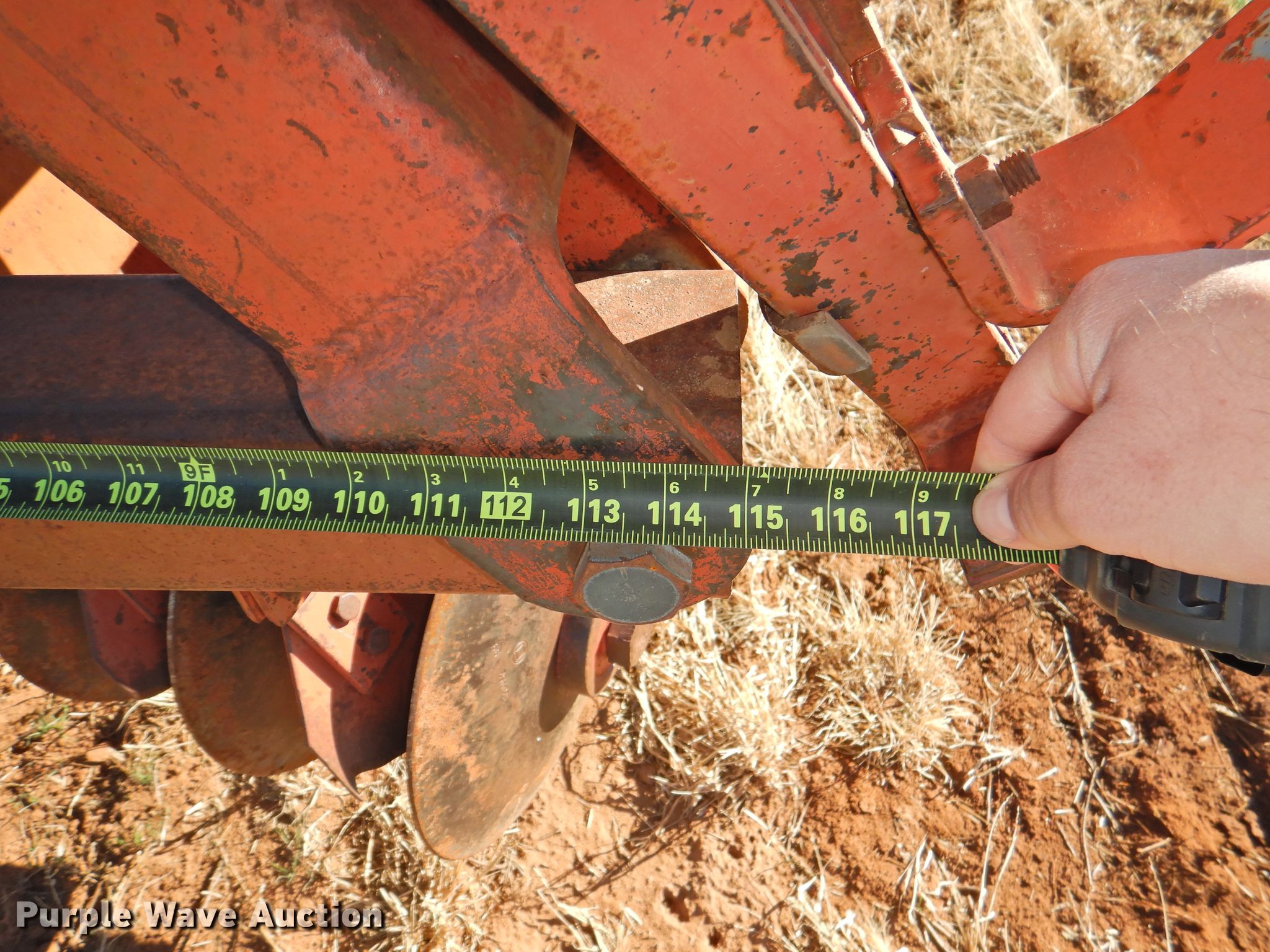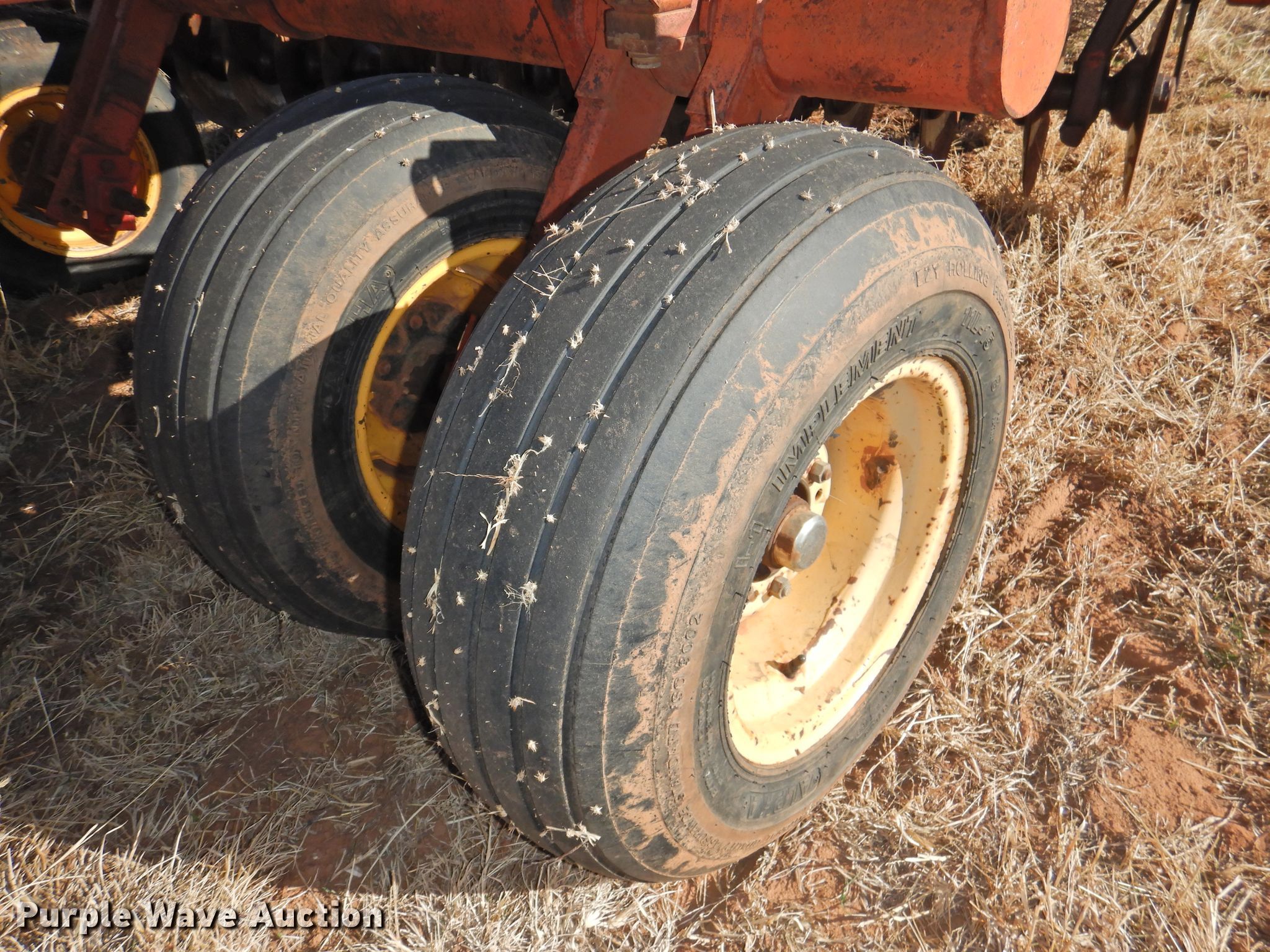 Purple Wave is selling a used Disk in Oklahoma. This item is a Sunflower 78G2-18 off-set disk with the following: 18'W, 19" diameter disks, Disk scrapers, Manual leveler, Hydraulic lift and fold, 11L-15 tires, One hub, wheel, and tire missing, Serial 0715
