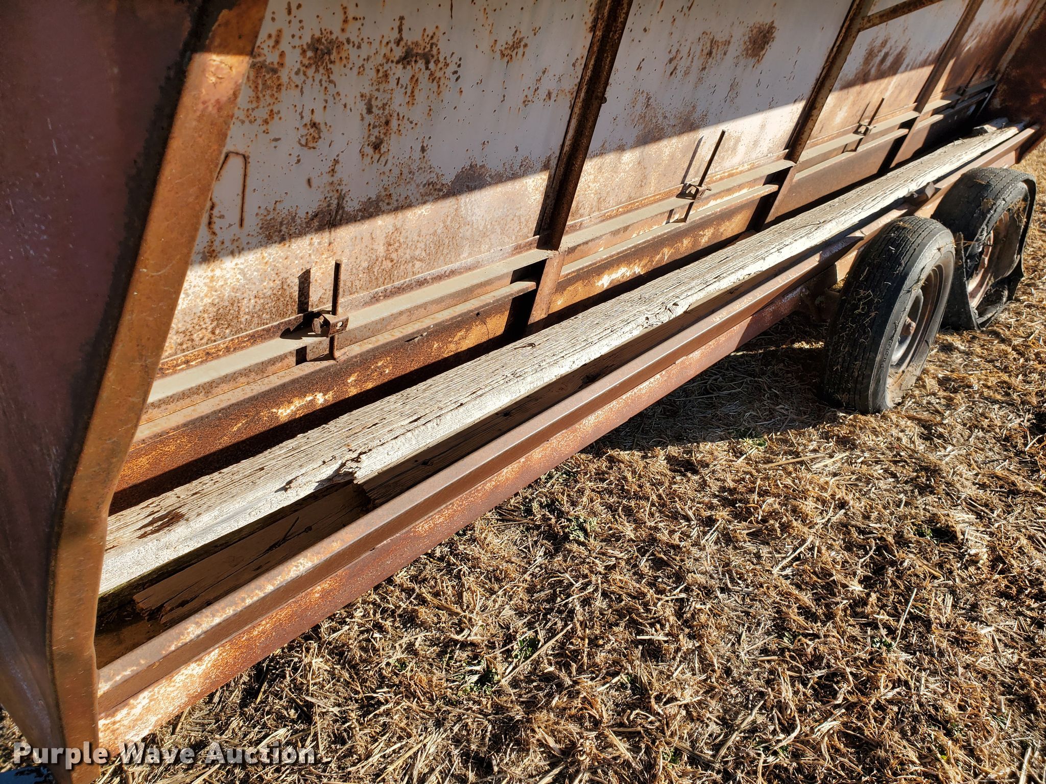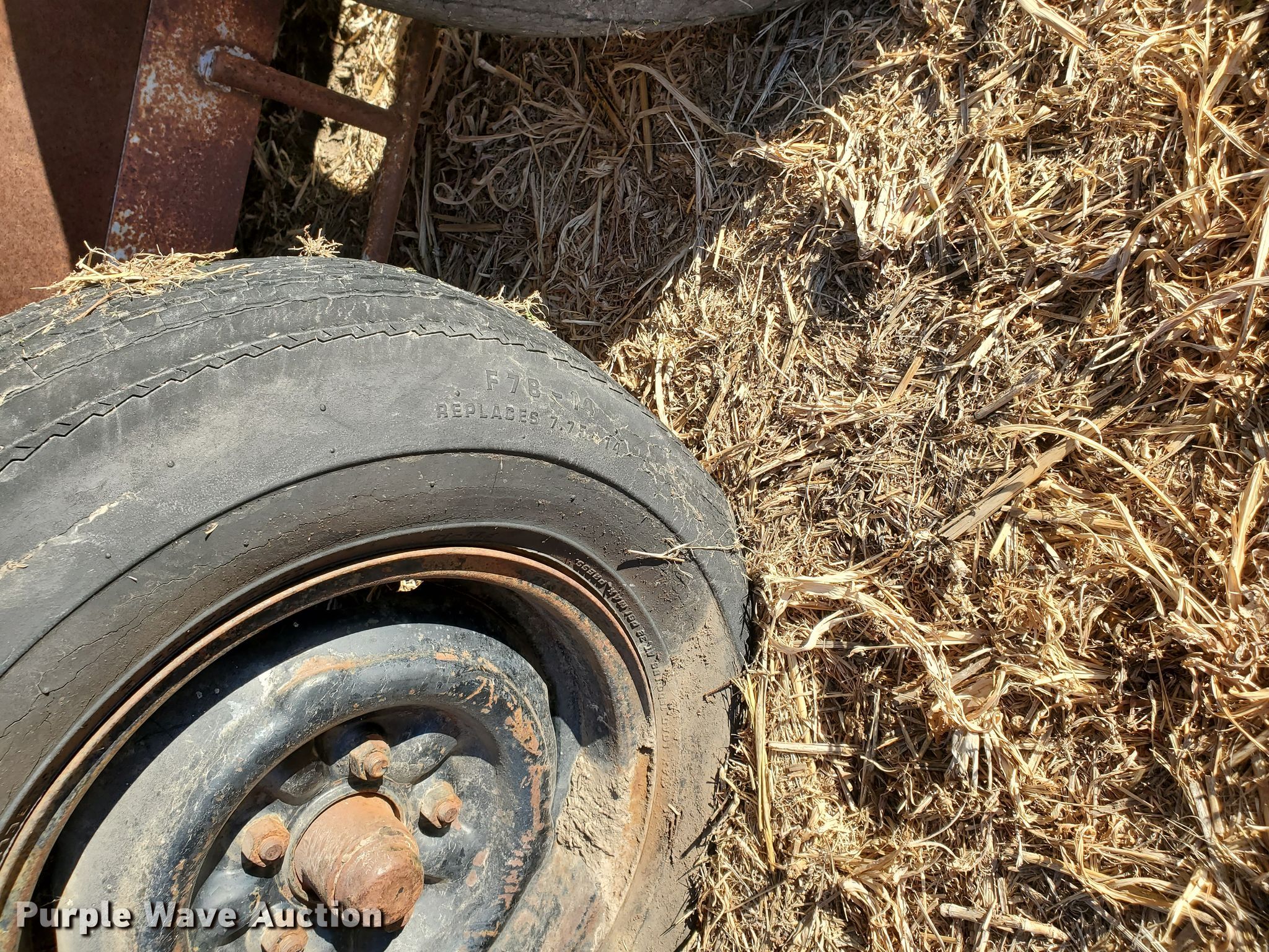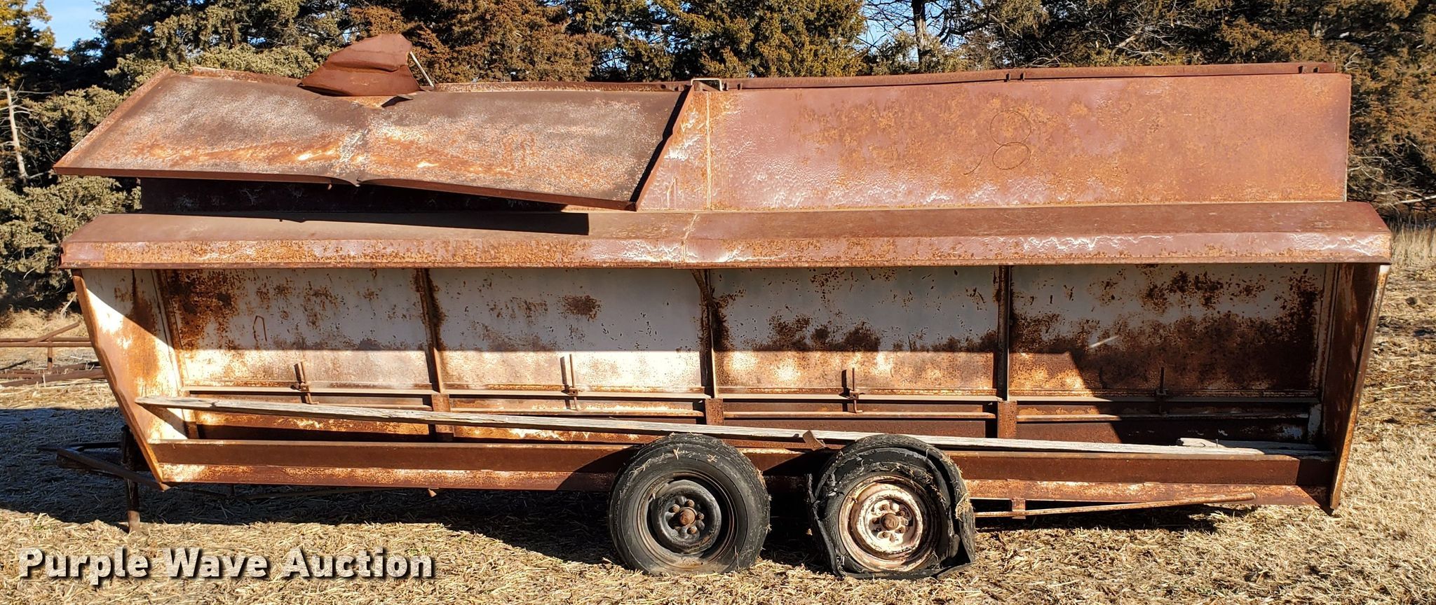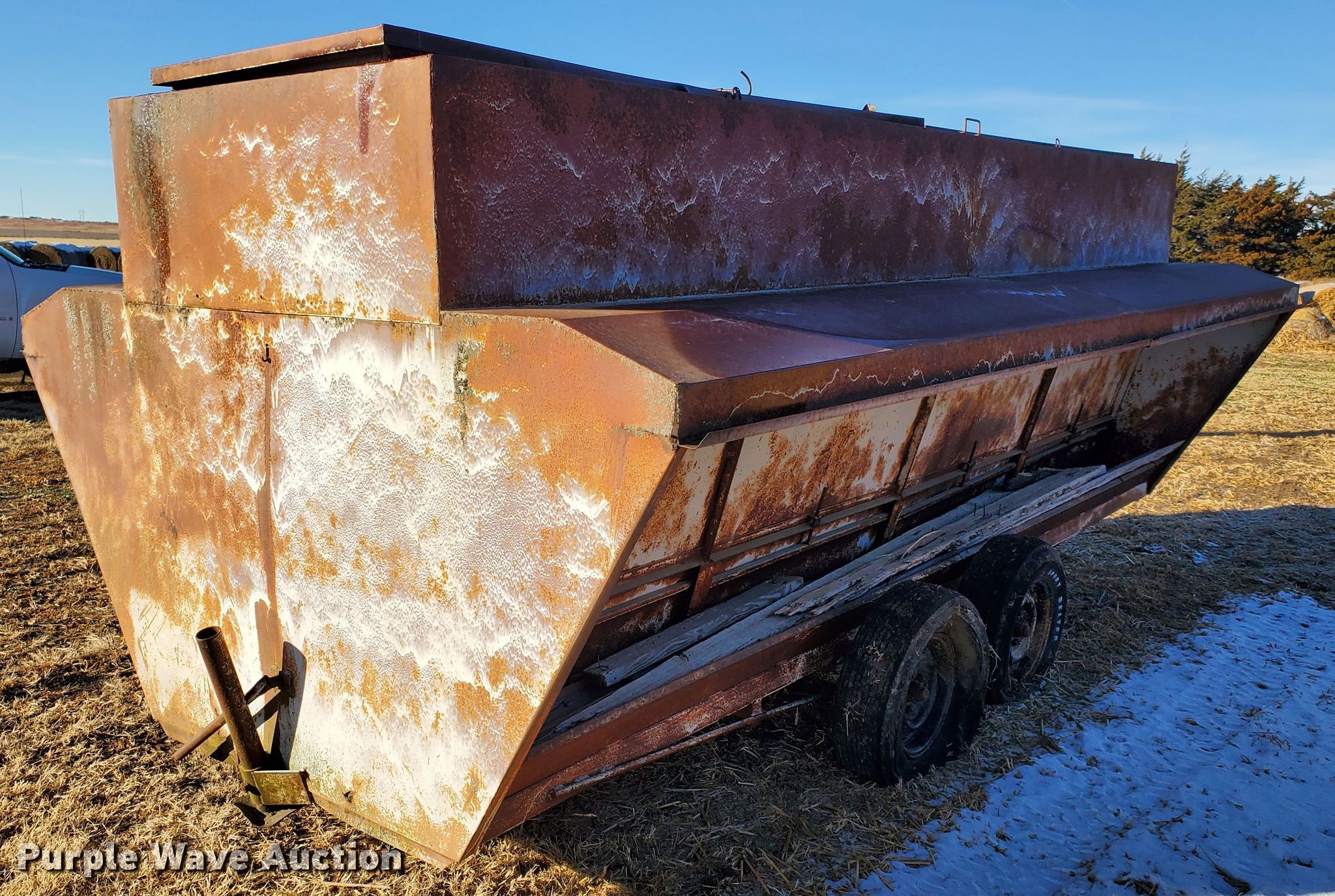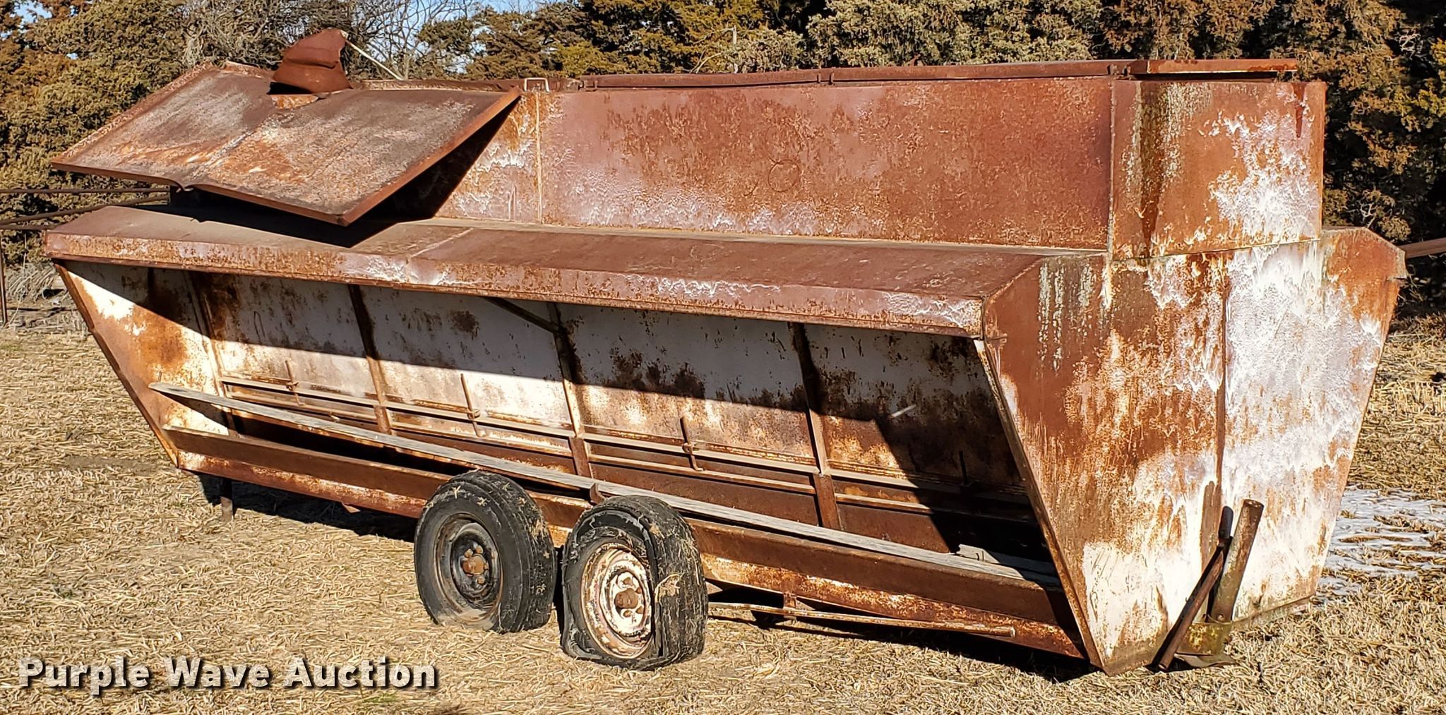Palmer creep feeder. 16'L x 92"W hopper, F78-14 tires, Tires need to be replaced, Top door damage. Fort Hays State University Farms. 601 Park St. Hays, KS 67601