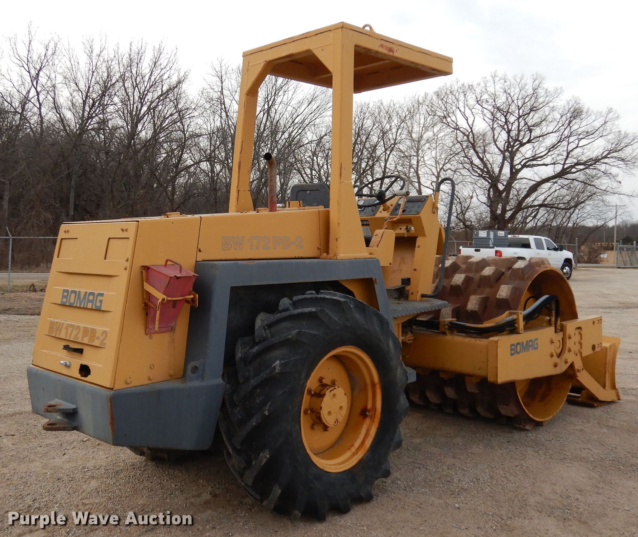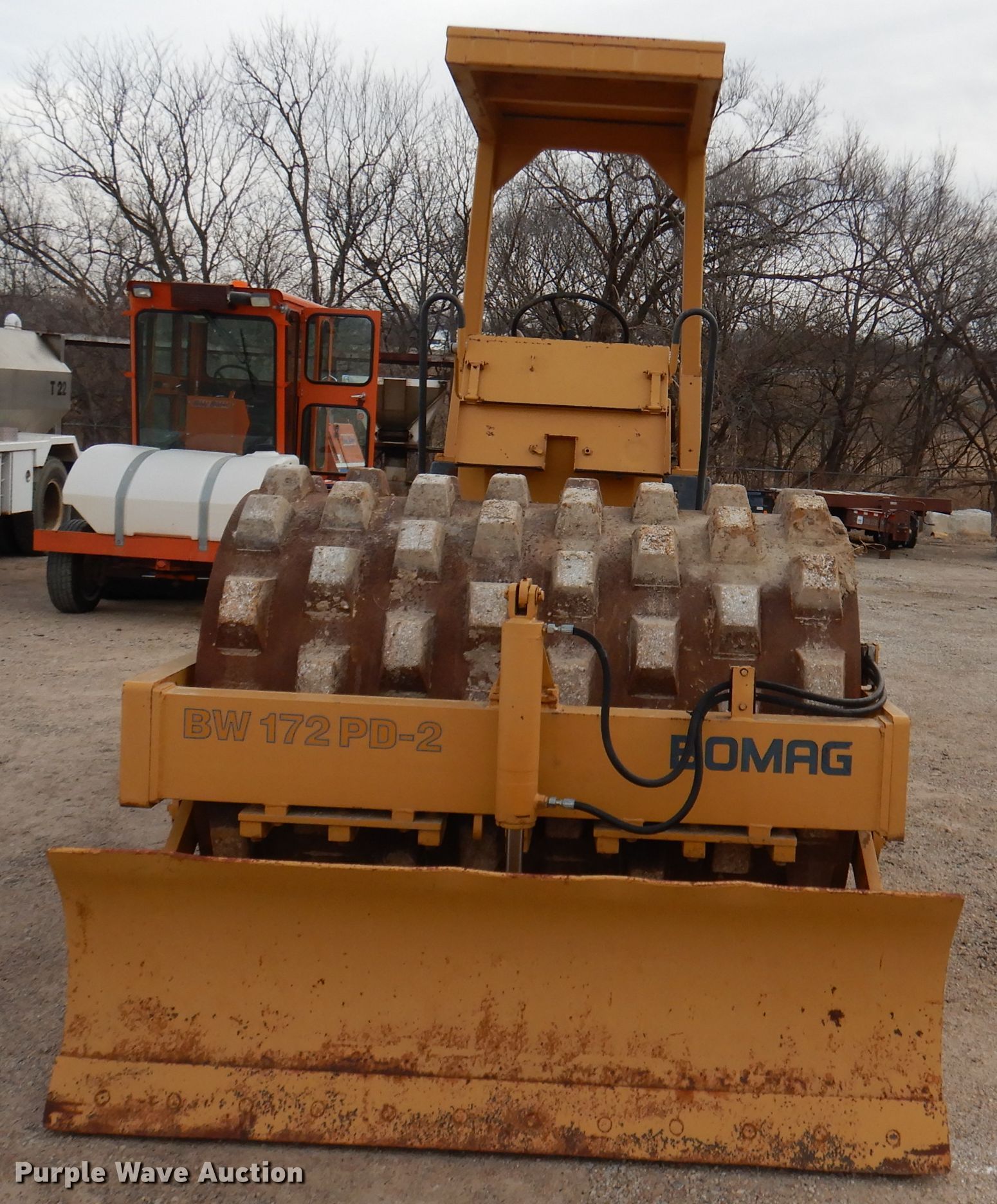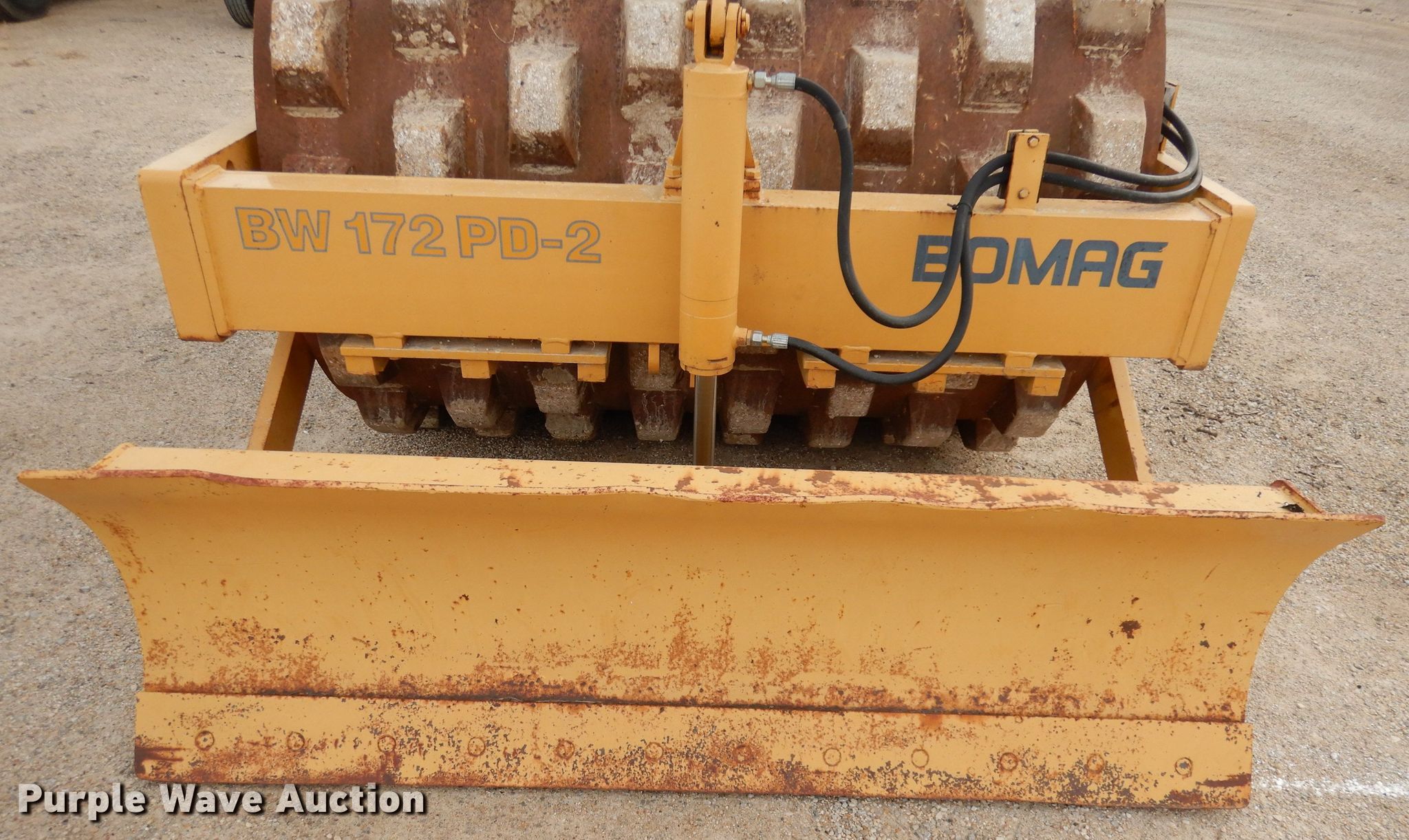 Bomag BW172PD2 single drum roller. 1,506 hours on meter, Serial: 101520500209. Engine Deutz, Cylinders: 4, Fuel type: Diesel. Transmission Hydrostatic. Operators station OROPS, Vandal cover. Operational Drum: Padfoot, Front drum Width: 66", Diameter: 44", Drum scrapers: Front, Front blade width: 72". Tires Rear: 14.9-24, Brand: Goodyear. Tecumseh, KS 66542