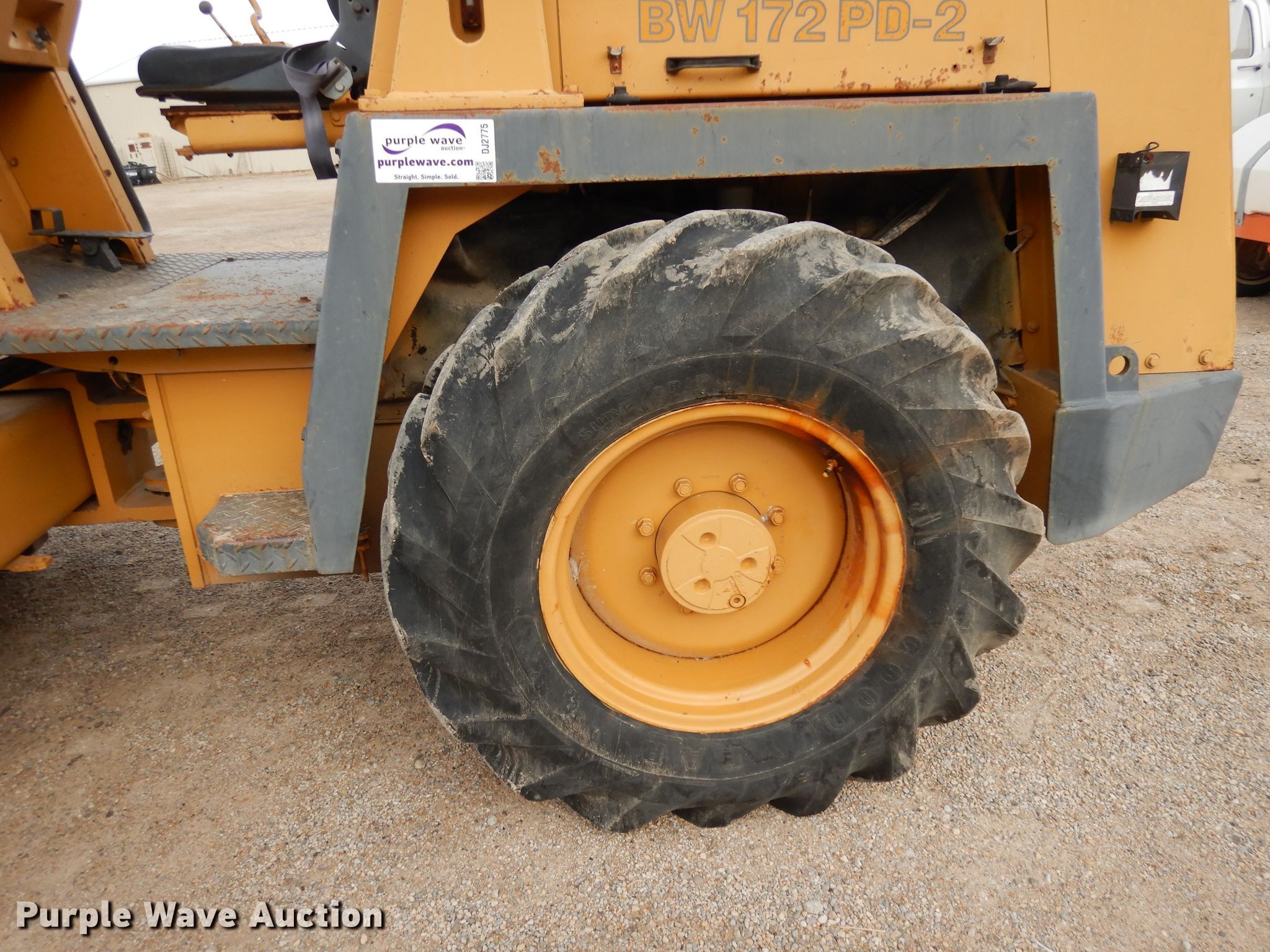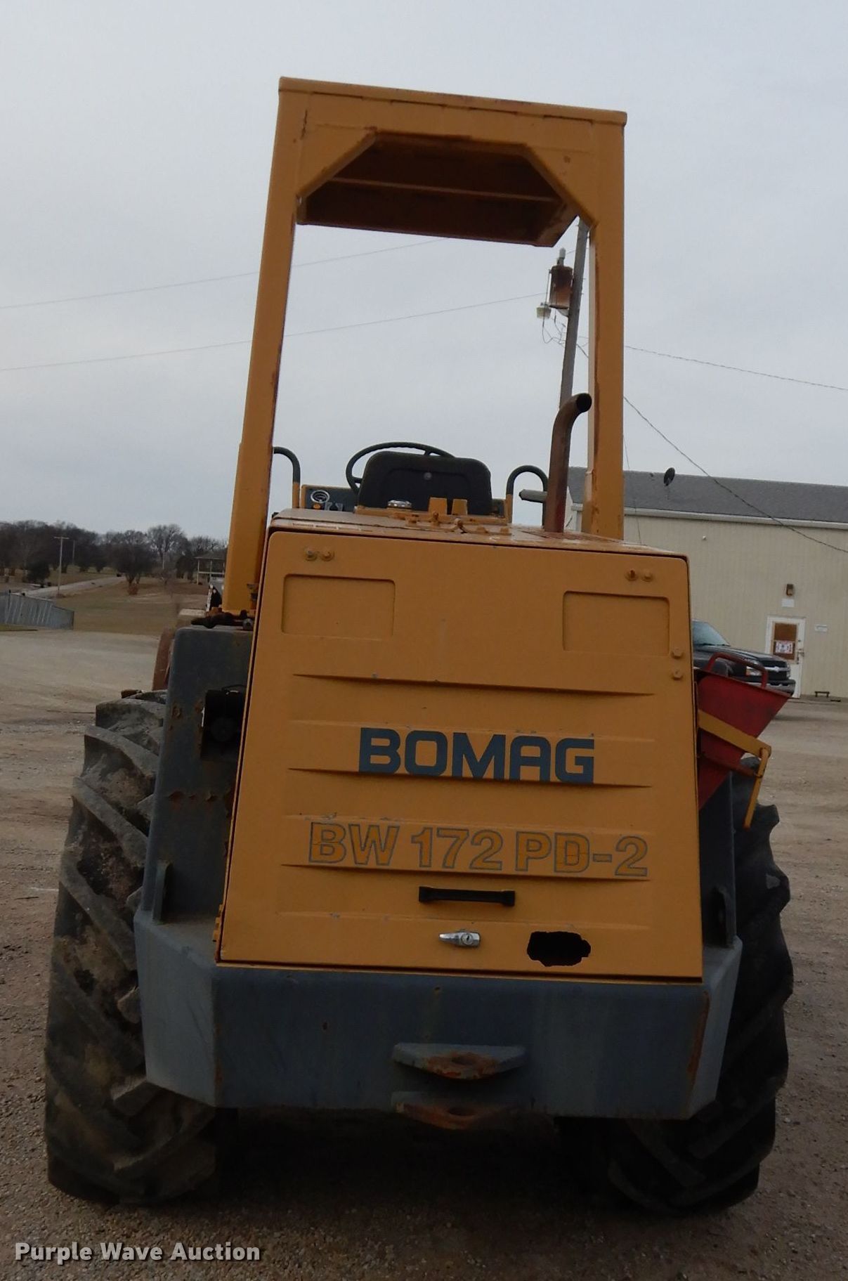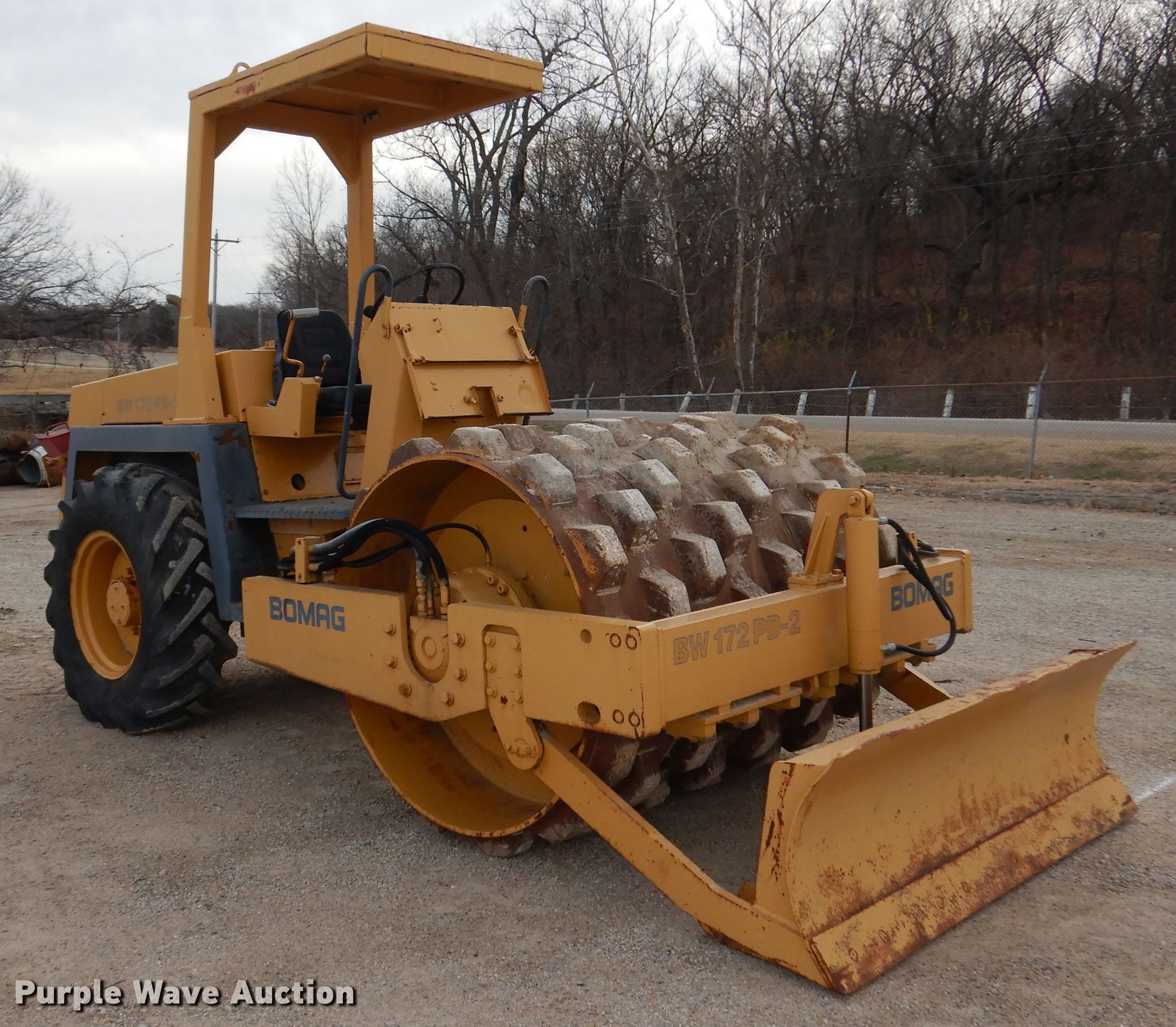 Bomag BW172PD2 single drum roller. 1,506 hours on meter, Serial: 101520500209. Engine Deutz, Cylinders: 4, Fuel type: Diesel. Transmission Hydrostatic. Operators station OROPS, Vandal cover. Operational Drum: Padfoot, Front drum Width: 66", Diameter: 44", Drum scrapers: Front, Front blade width: 72". Tires Rear: 14.9-24, Brand: Goodyear. Tecumseh, KS 66542