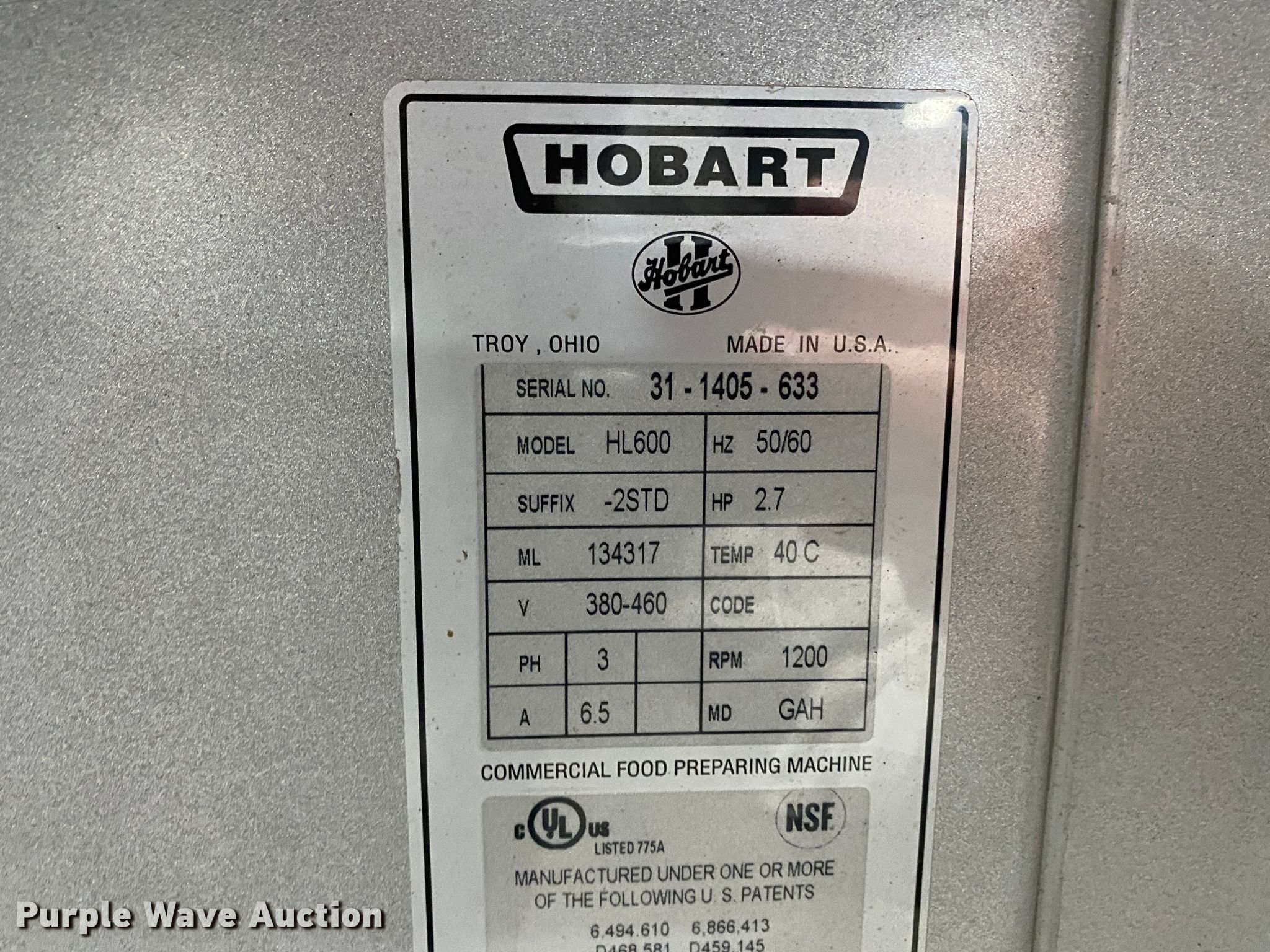 Purple Wave is selling a used Restaurant Equip. in Missouri. This item is a Hobart HL600 mixer with the following: Four speed, Three phase, 2.7 HP, 50/60 Hz, 6.5 amps, Serial 31-1405-633