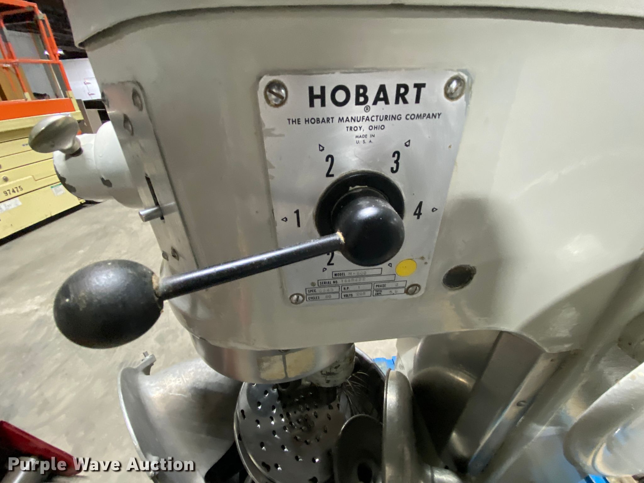 Purple Wave is selling a used Restaurant Equip. in Missouri. This item is a Hobart H600 mixer with the following: Four speed, 208V, Three phase, 1 HP, 5.9 amps, Serial 1448422
