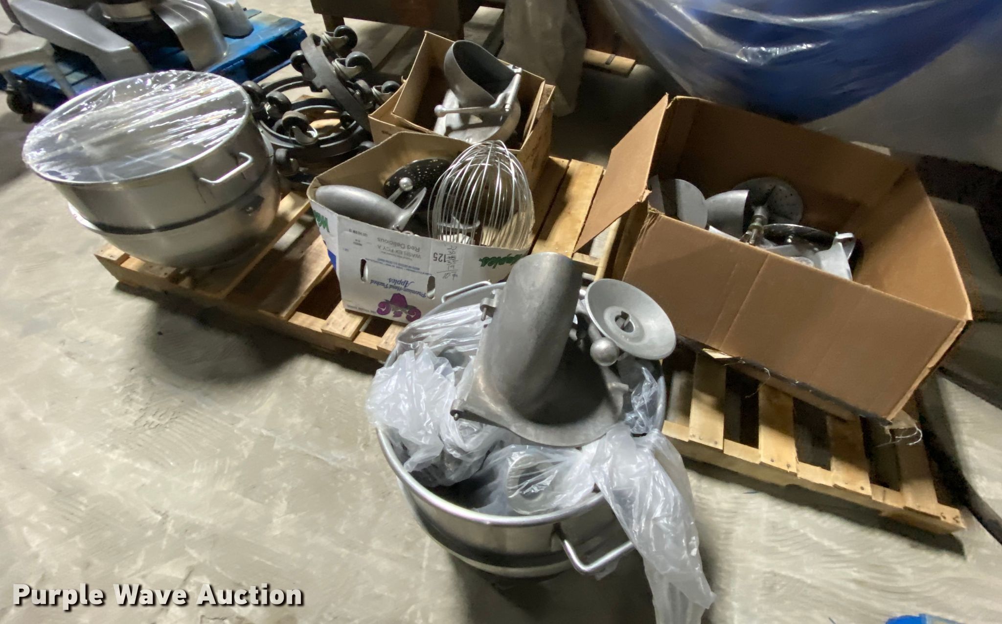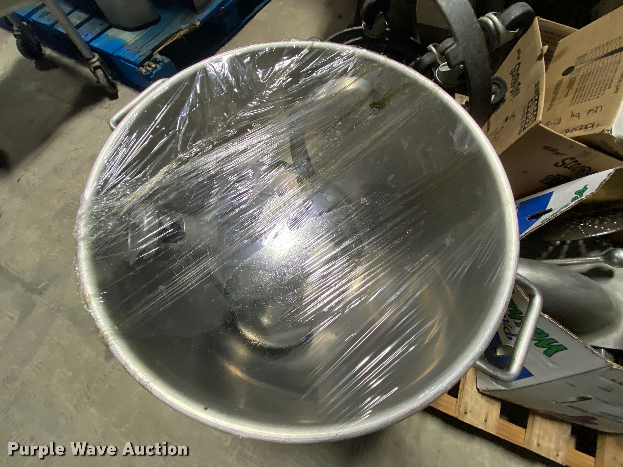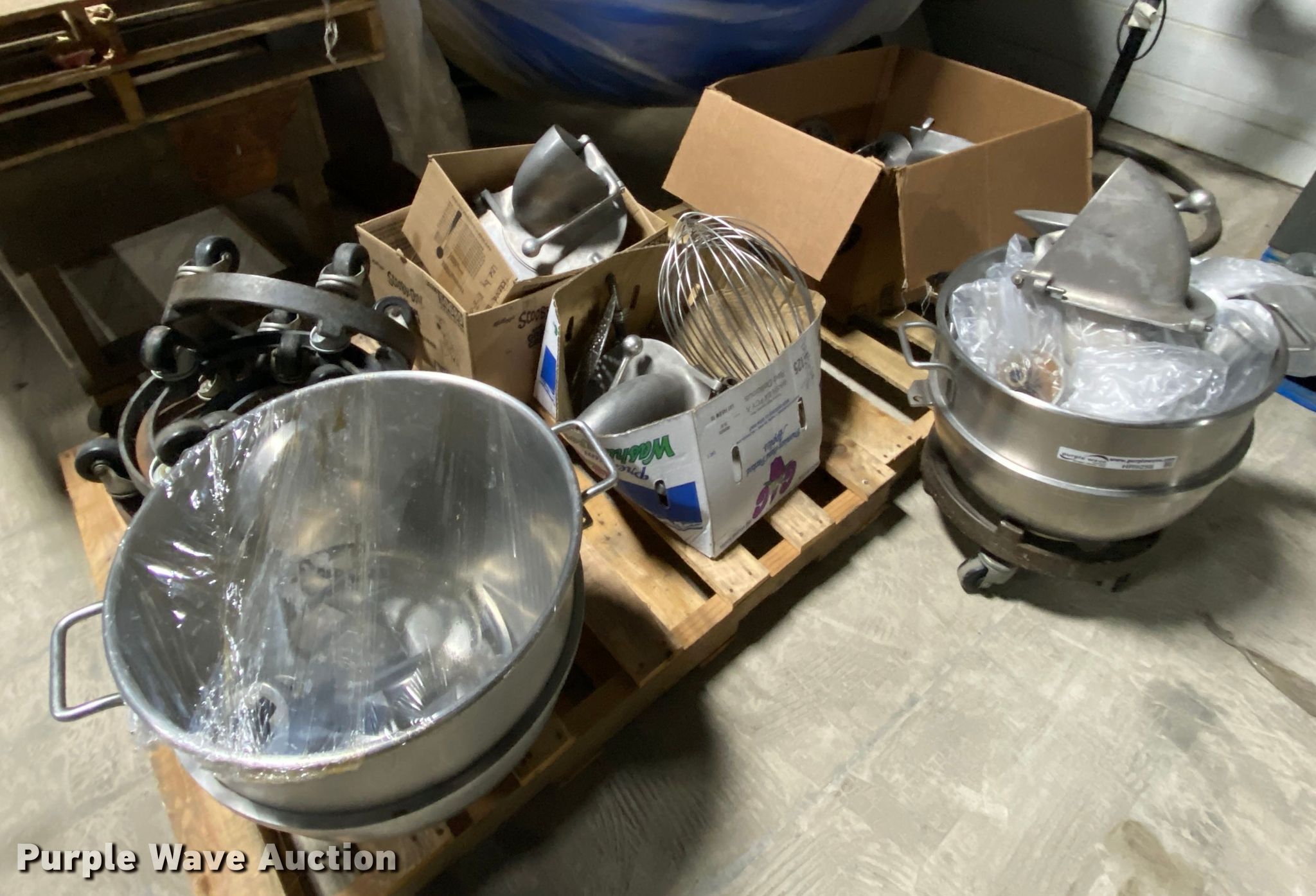 Purple Wave is selling a used Restaurant Equip. in Missouri. This item is a Restaurant equipment with the following: Mixer bowls, Bowl carts, Whisks