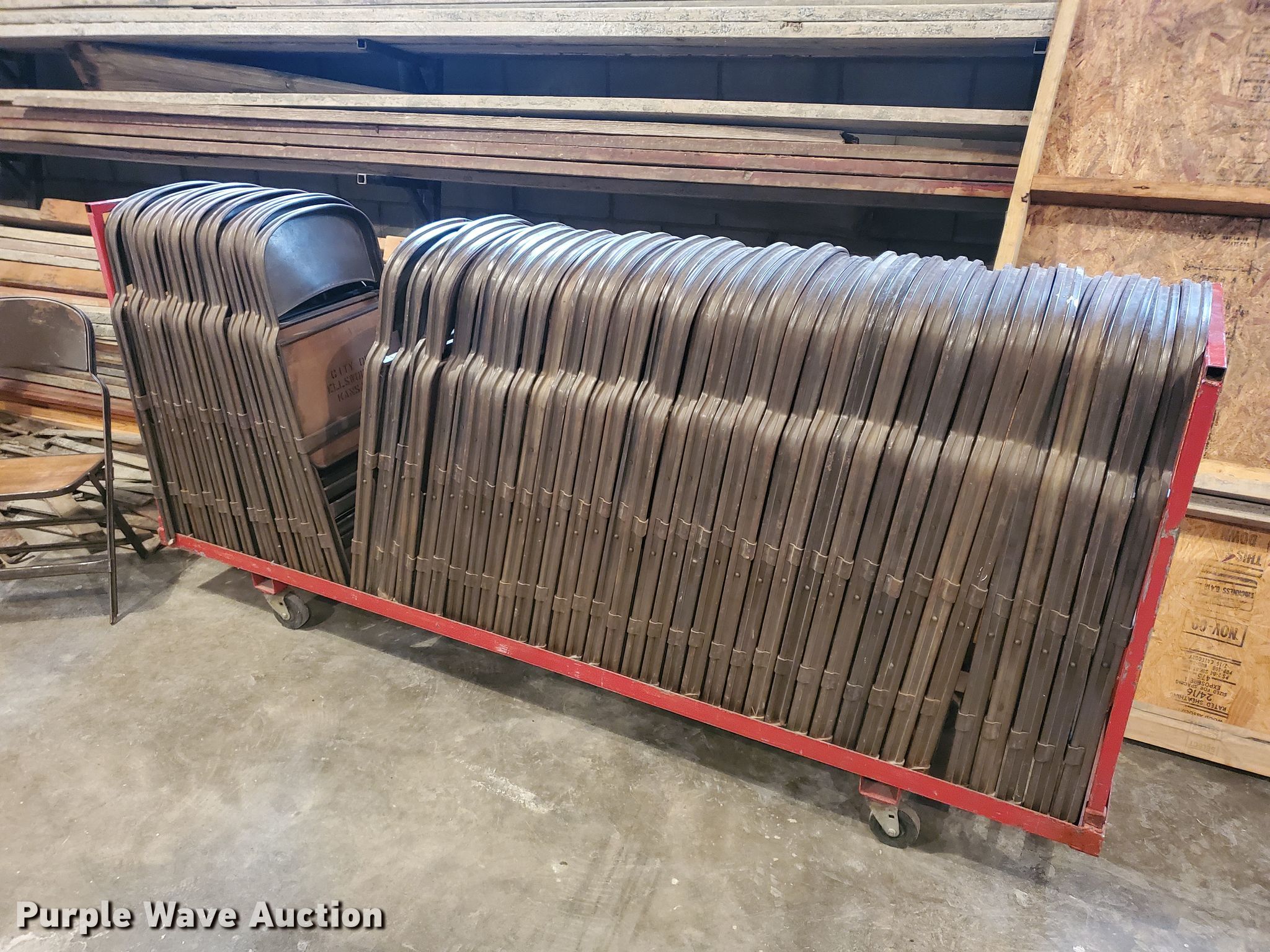 Purple Wave is selling a used Furniture in Kansas. This item is a (265) folding chairs with the following: (5) storage racks included