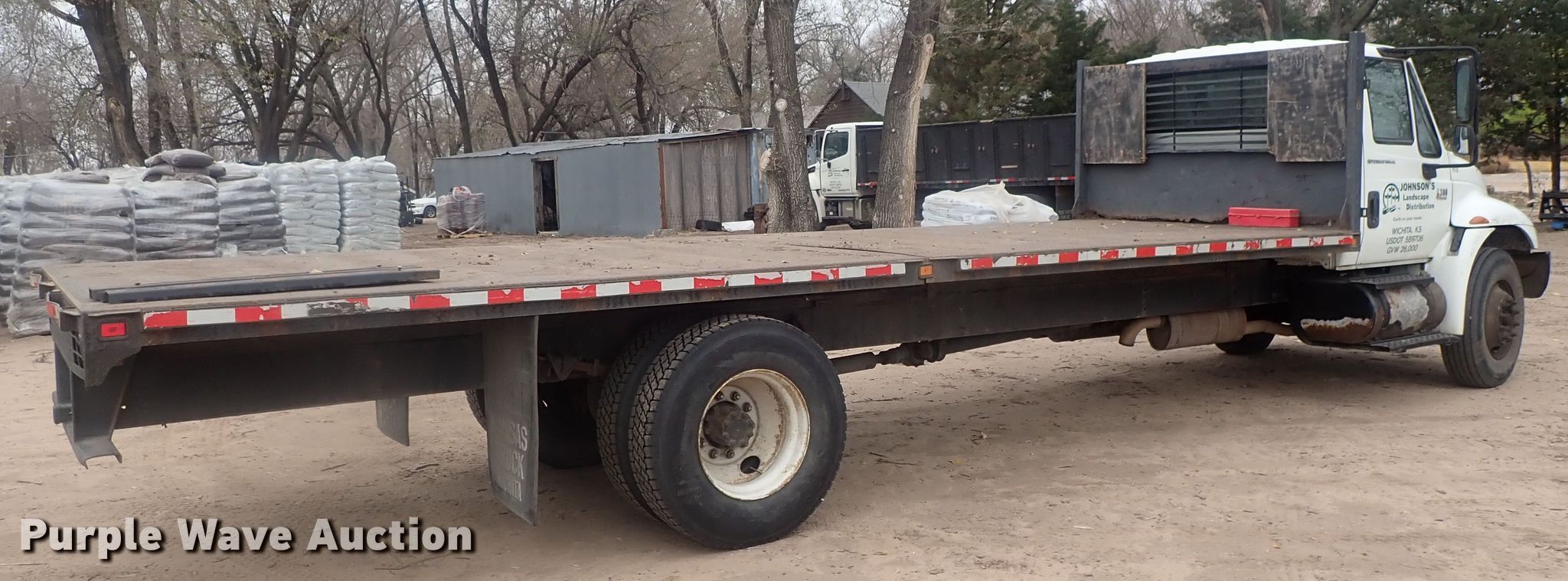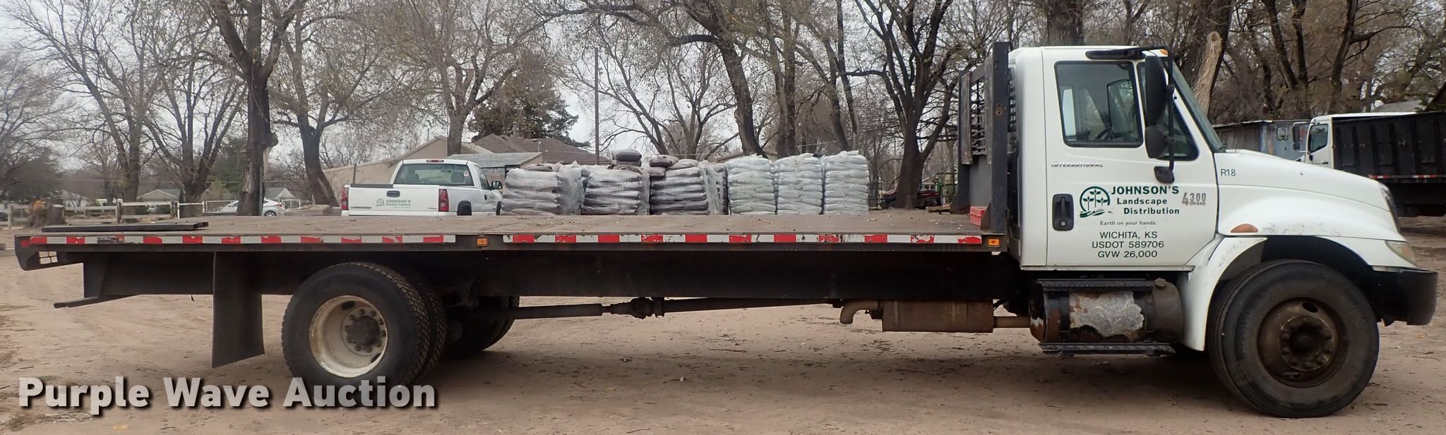 2008 International 4300 flatbed truck. 229,635 miles on odometer. Engine Displacement: 7.6L, Cylinders: 6, Fuel type: Diesel. Transmission Eaton Fuller, Manual, Speed: 6. Chassis Axles: Single, Suspension: Spring, Brakes: Air, GVWR: 25,999 lbs. Interior AC, Heat, Cruise control. Operational Flatbed Length: 24', Width: 96". Tires Size: 11R22.5. Kansas title. Title distribution may be delayed up to 14 days from verification of funds. 1HTMMAAL78H535072. Johnson's Garden Center. Wichita, KS 67204