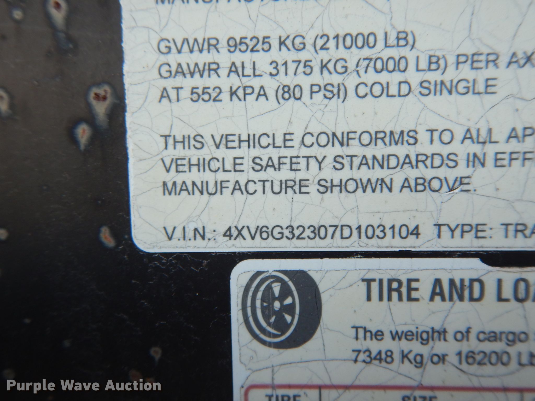 2007 Apache equipment trailer. 40'L x 107"W overall, 32'L x 83"W wood deck, 16" side height, 24" floor height, Dual leg landing gear, Spring suspension, Electric brakes, ST235/85R16 tires, GVWR 21,000 lbs, Unit# T-76. Texas title. Title distribution may be delayed up to 30 days from verification of funds. 4XV6G32307D103104. ROC Service. 191 Energy Way. Bridgeport, TX 76426