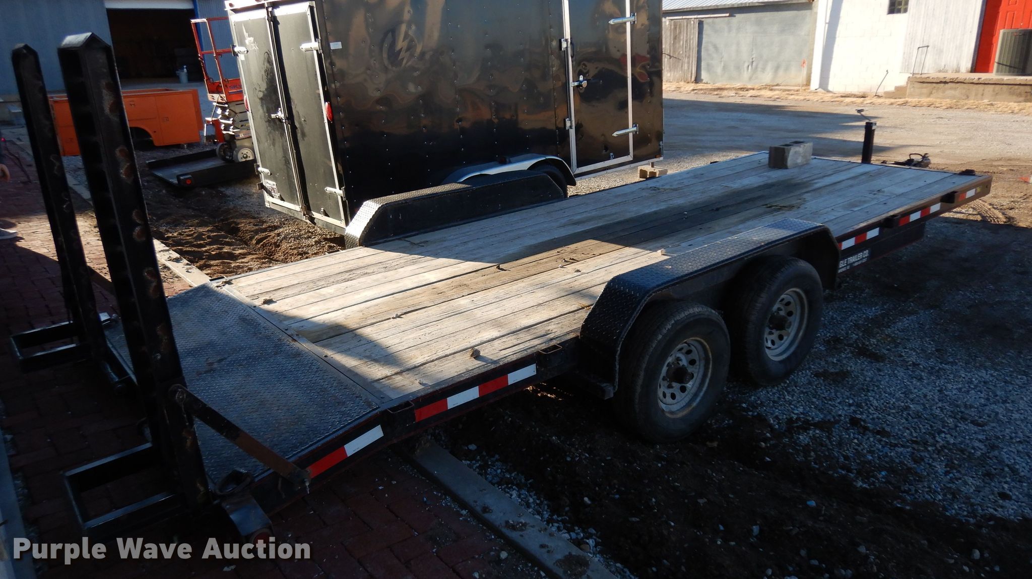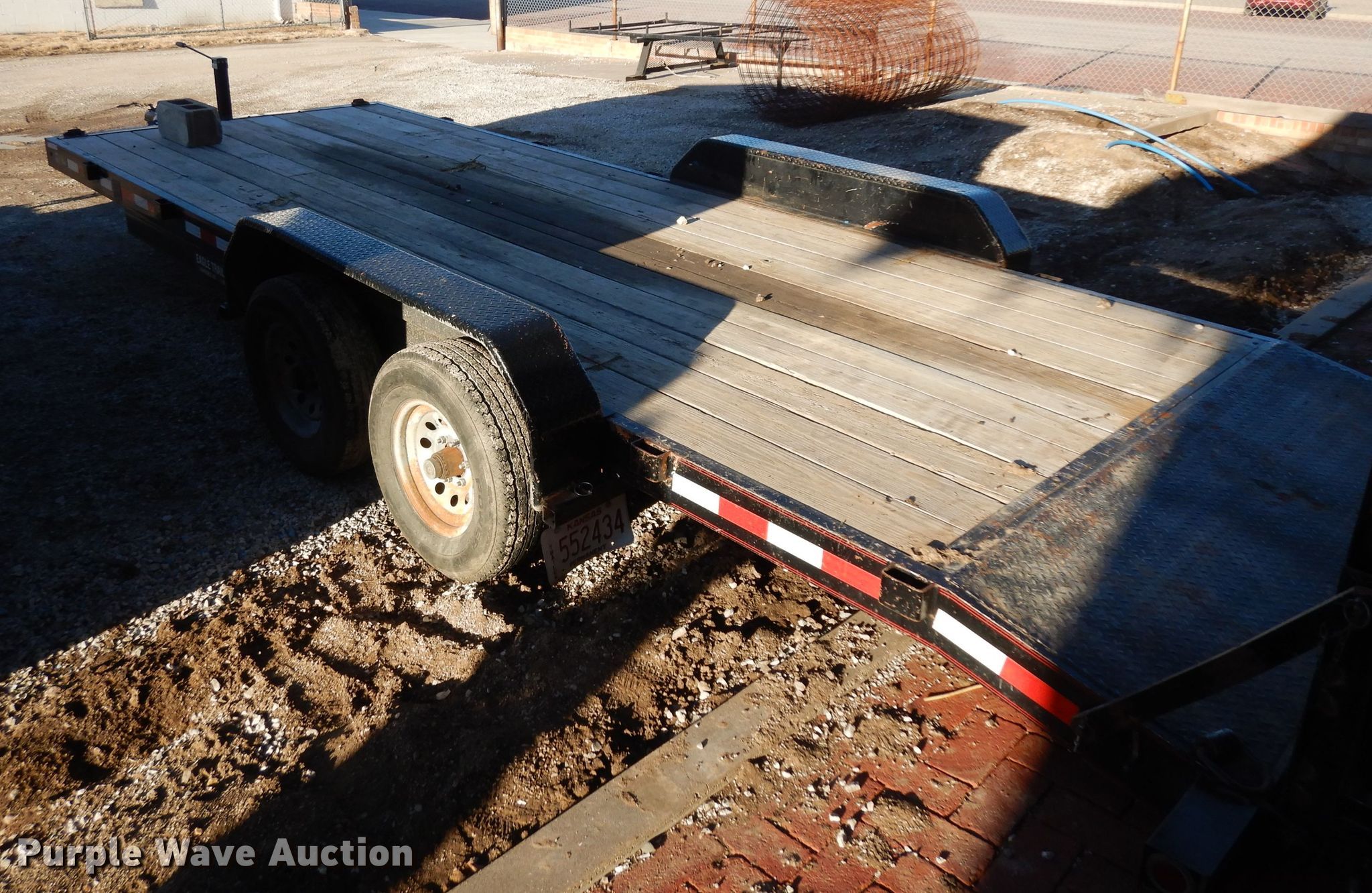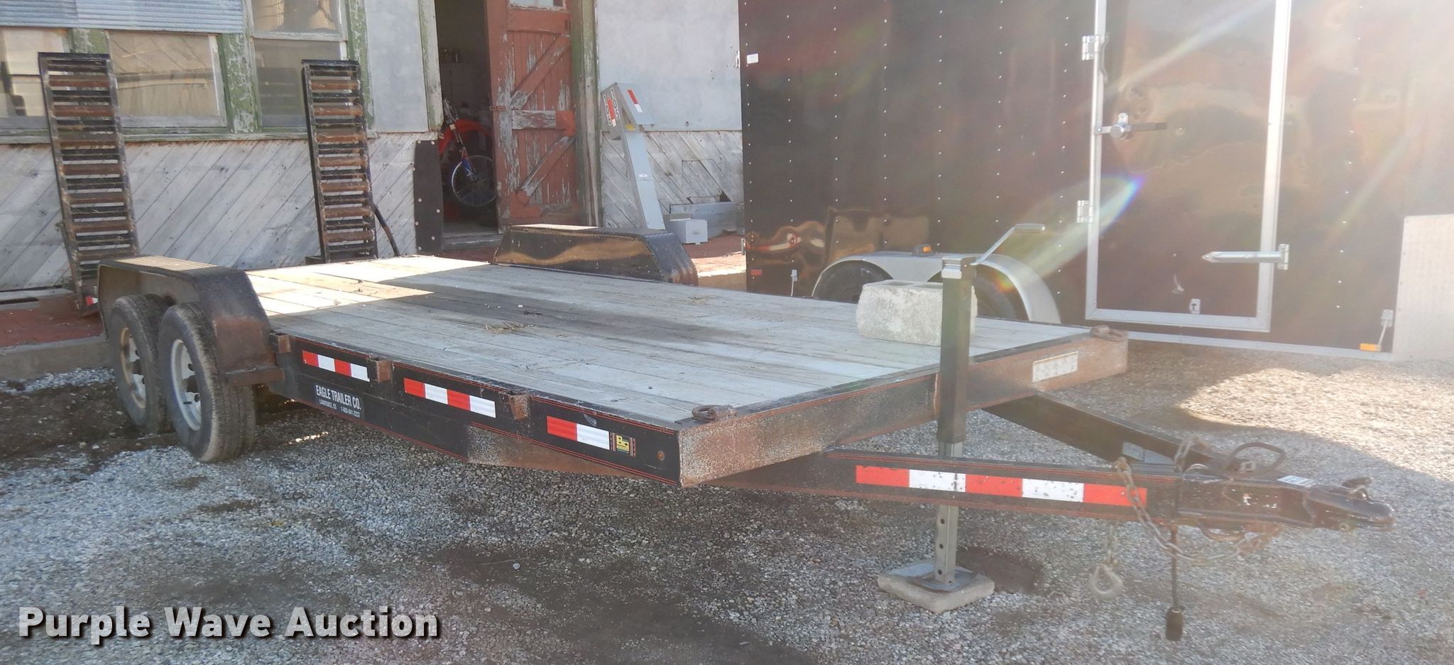 Purple Wave is selling a used Car or Utility Trailer in Kansas. This item is a 2014 Eagle utility trailer with the following: 24'L x 103"W overall, 18'L x 83"W wood deck, 2'L tail, 5'L ramps, 25" floor height, 2 5/16" ball hitch, Single leg landing gear, Tandem axle, Spring suspension, Electric brakes, 225/75R15 tires, GVWR 9,990 lbs