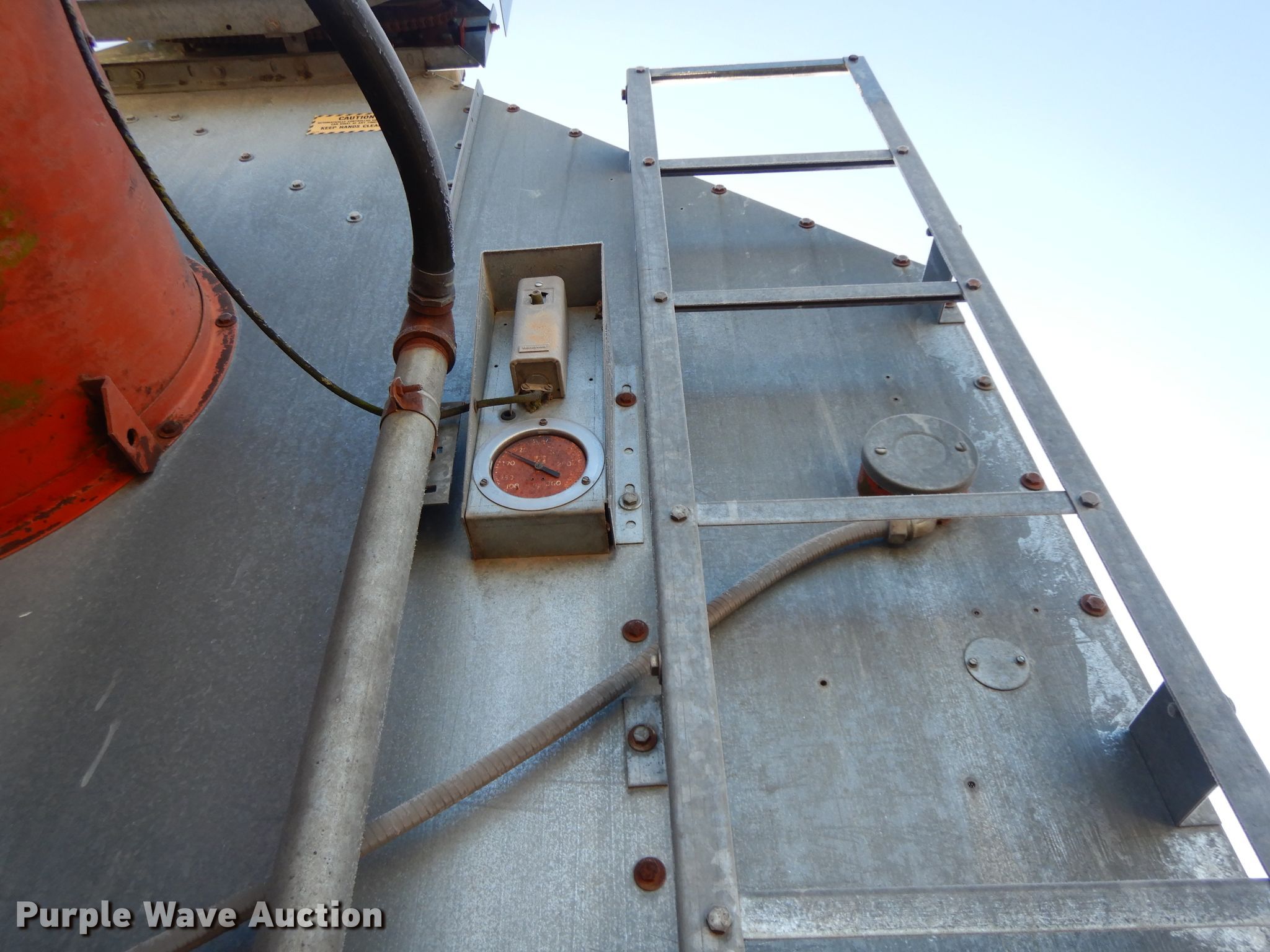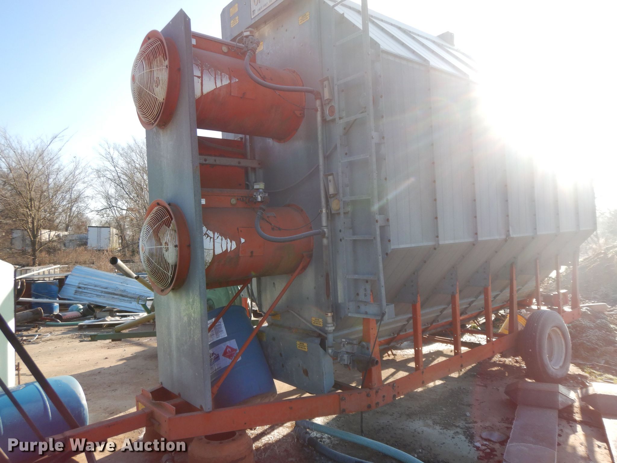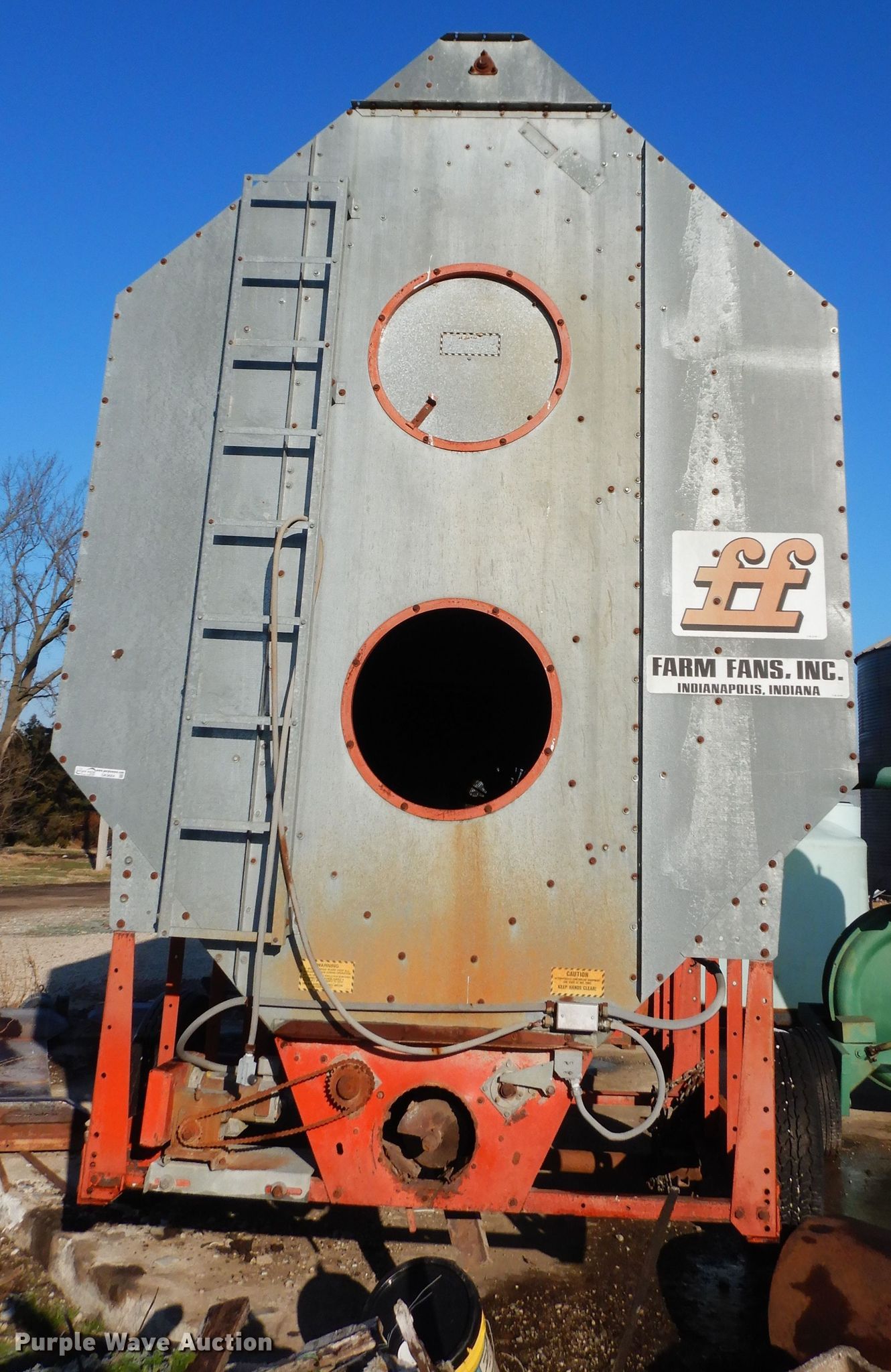 Purple Wave is selling a used Grain Dryer in Kansas. This item is a Farm Fan U1024 JDHI-3-440VNG grain dryer with the following: 922 hours on meter, 14' x 149" dryer compartment, Dual fans, Front and rear access ladders, Chain drive, Electric motor, Model M3611T, 208-230-/460V, 1,725 RPM, Three phase, Serial 35L100Y334, Enclosed control panel, Model CF/SA 320 3E 440V NG DSS HR 10/10, Serial L-6012, Single axle, Currently unattached, 7.50R16 tires, Serial 118088
