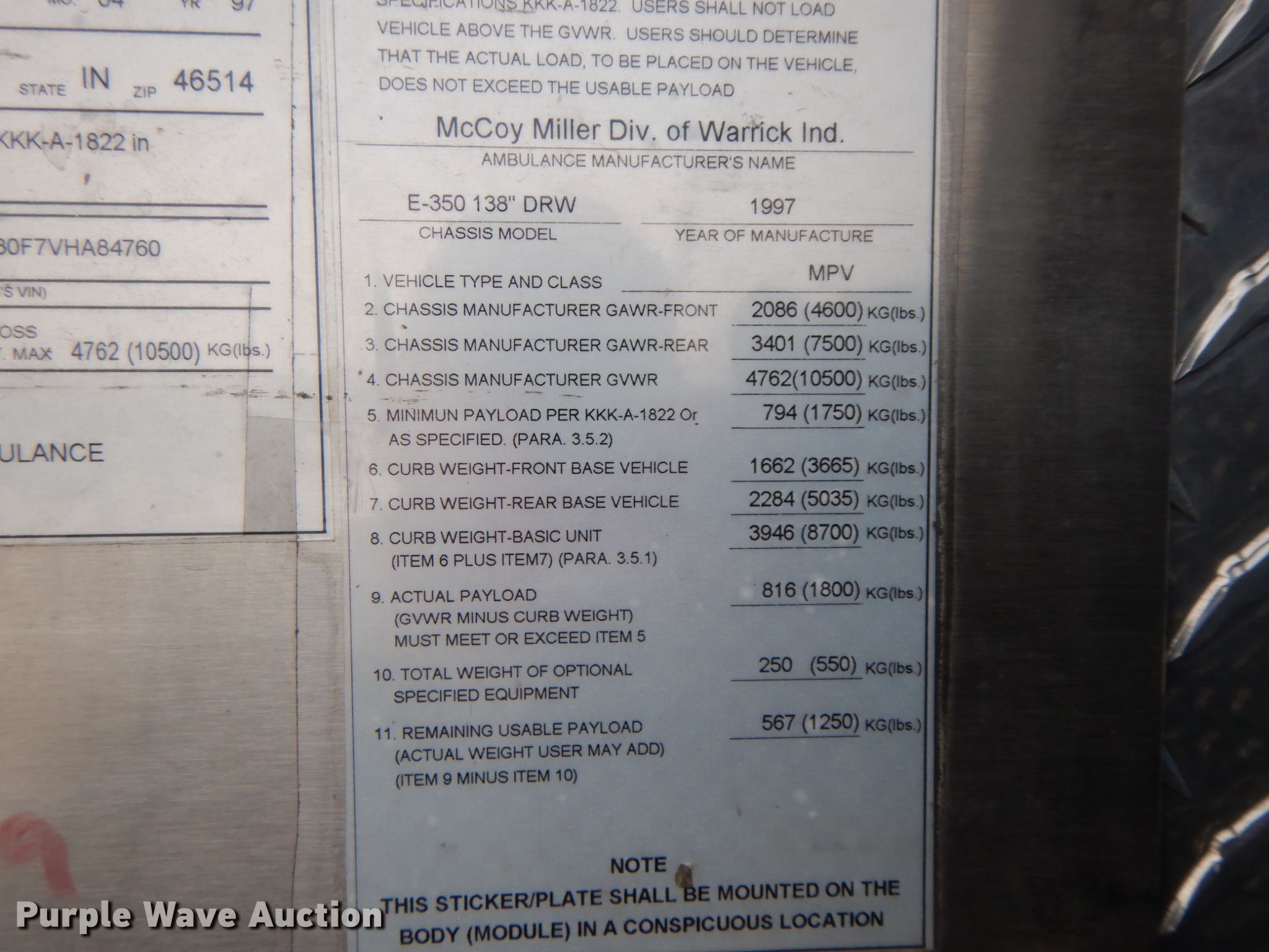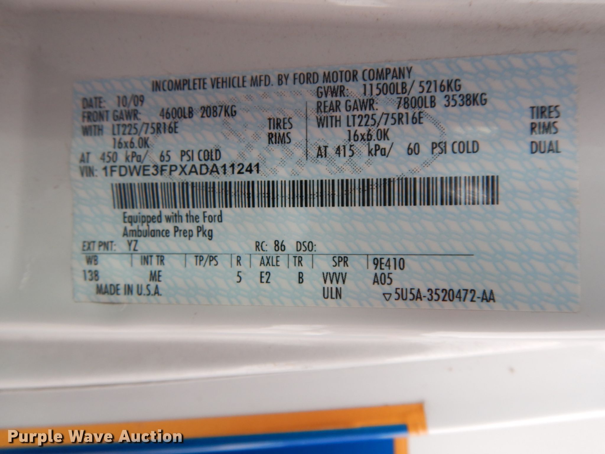 2010 Ford E350 Super Duty ambulance. 116,537 miles on odometer Miles may vary, still in use, Unit #: 503. Engine Displacement: 6.0L V8 OHV 32V, Cylinders: 8, Fuel type: Diesel. Transmission Automatic. Chassis Axles: Single, Suspension: Spring, Brakes: Hydraulic, GVWR: 11,500 lbs, Wheelbase: 137". Interior AC, Heat, Power windows, Power locks, Cruise control. Operational Ambulance body McCoy Miller E-350 138" DRW, PA / siren controls, Oxygen hookups. Tires Size: LT225/75R16. Notes Engine replaced in February 2014 at 46,757 miles, Fuel leak, Emergency equipment and two-way radio will be removed prior to auction, Power loader not included. View repairs. Missouri title. 1FDWE3FPXADA11241. Sullivan County Ambulance Dist. 113 South Leewood. Milan, MO 63555