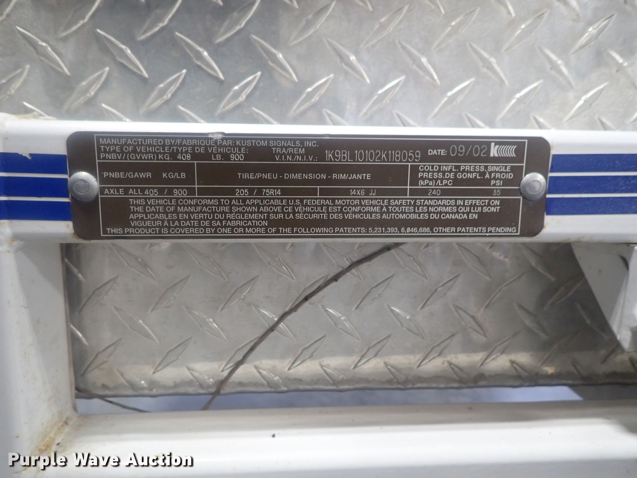 Purple Wave is selling a used Road Safety Equip. in Kansas. This item is a 2002 Kustom Signals speed detection trailer with the following: 72" x 48" trailer, 12V battery, Ball hitch, 205/75R14 tires