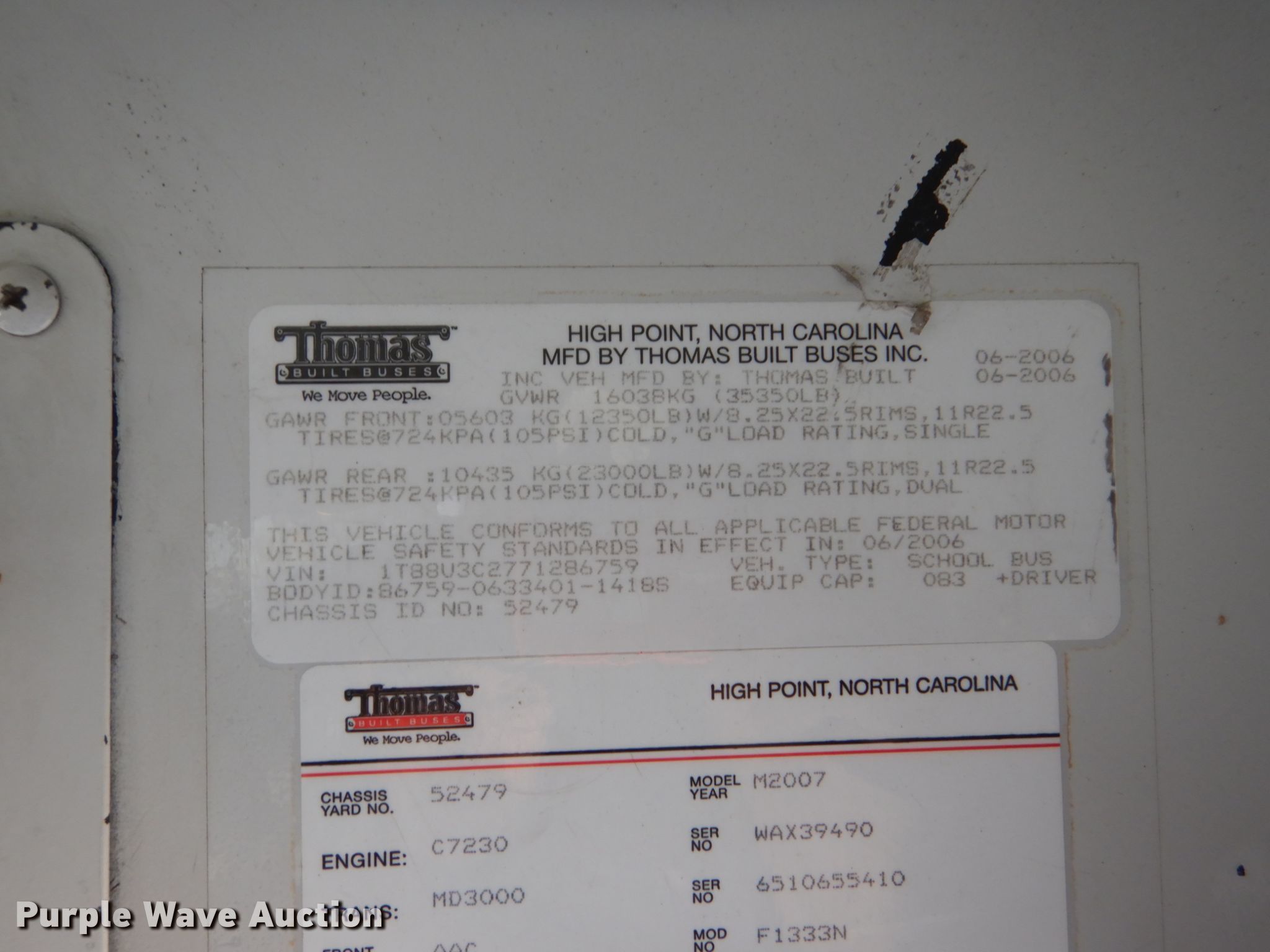 2007 Thomas Built Saf-T-Liner MVP EF school bus. 173,342 miles on odometer, Unit #: 526. Engine Caterpillar C7, Displacement: 7.2L, Cylinders: 6, Fuel type: Diesel. Transmission Automatic. Chassis Axles: Single, Suspension: Air, Brakes: Air. Interior AC, Heat, Heated mirrors, Electric passenger sliding door, Passengers: 83, Seats Adult seats: 28. Tires Size: 11R22.5. Iowa title. Seller is a government entity who will be assigning and distributing the title. Please contact the seller for distribution questions. 1T88U3C2771286759. Des Moines Public Schools. 1915 Prospect Rd. Des Moines, IA 50310