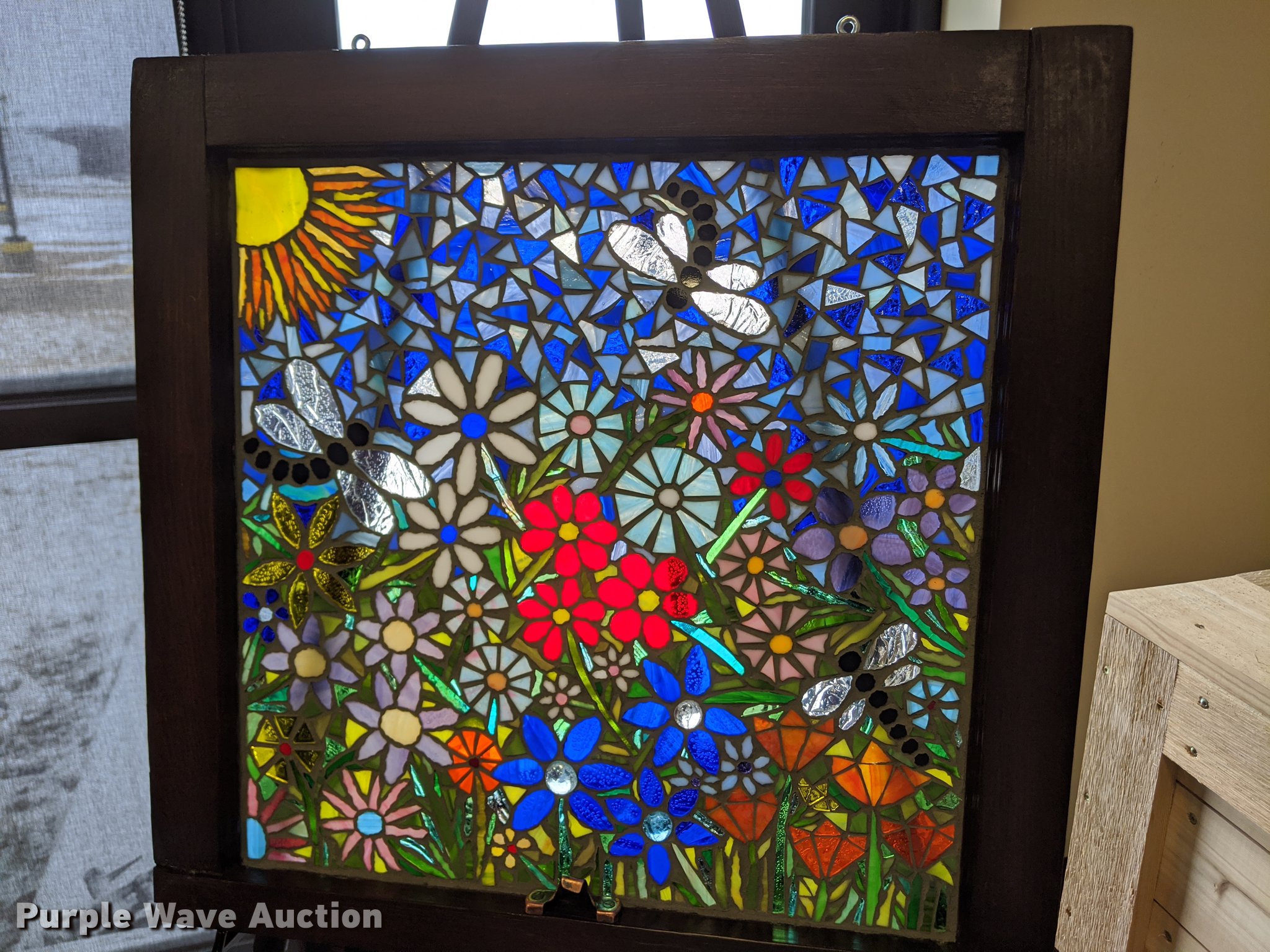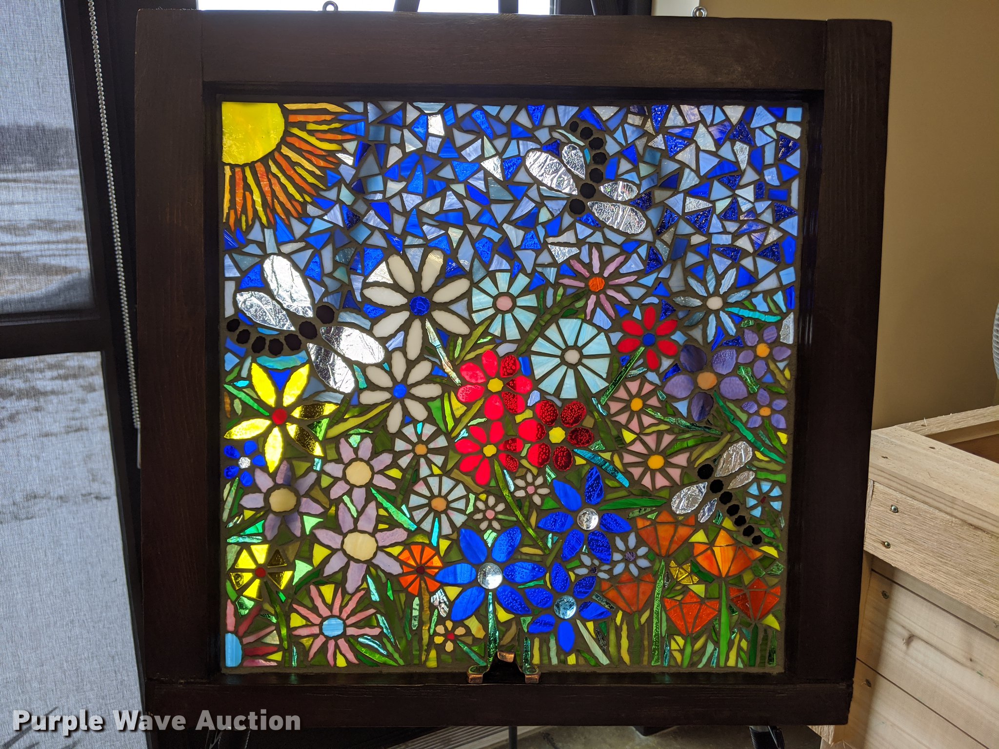 Purple Wave is selling a used All Other Household Items in Kansas. This item is a Vintage Framed Stained Glass Mosaic Window with the following: "Spring has Sprung" 22" x 21" vintage framed stained glass mosaic window, This stained glass mosaic piece of art is full of flowers and dragonflies, Hand cut stained glass is glued to the window then grouted, This vibrant piece would brighten any home of office for years to come