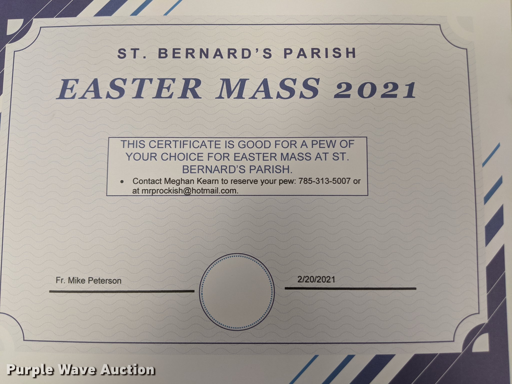 Reserved Seating for Easter Mass 2021. 1 pew. Donated by St. Bernard's Parish. Estimated value = Priceless. St. Bernard Catholic Church. 17665 Old Post Rd.. Wamego, KS 66547