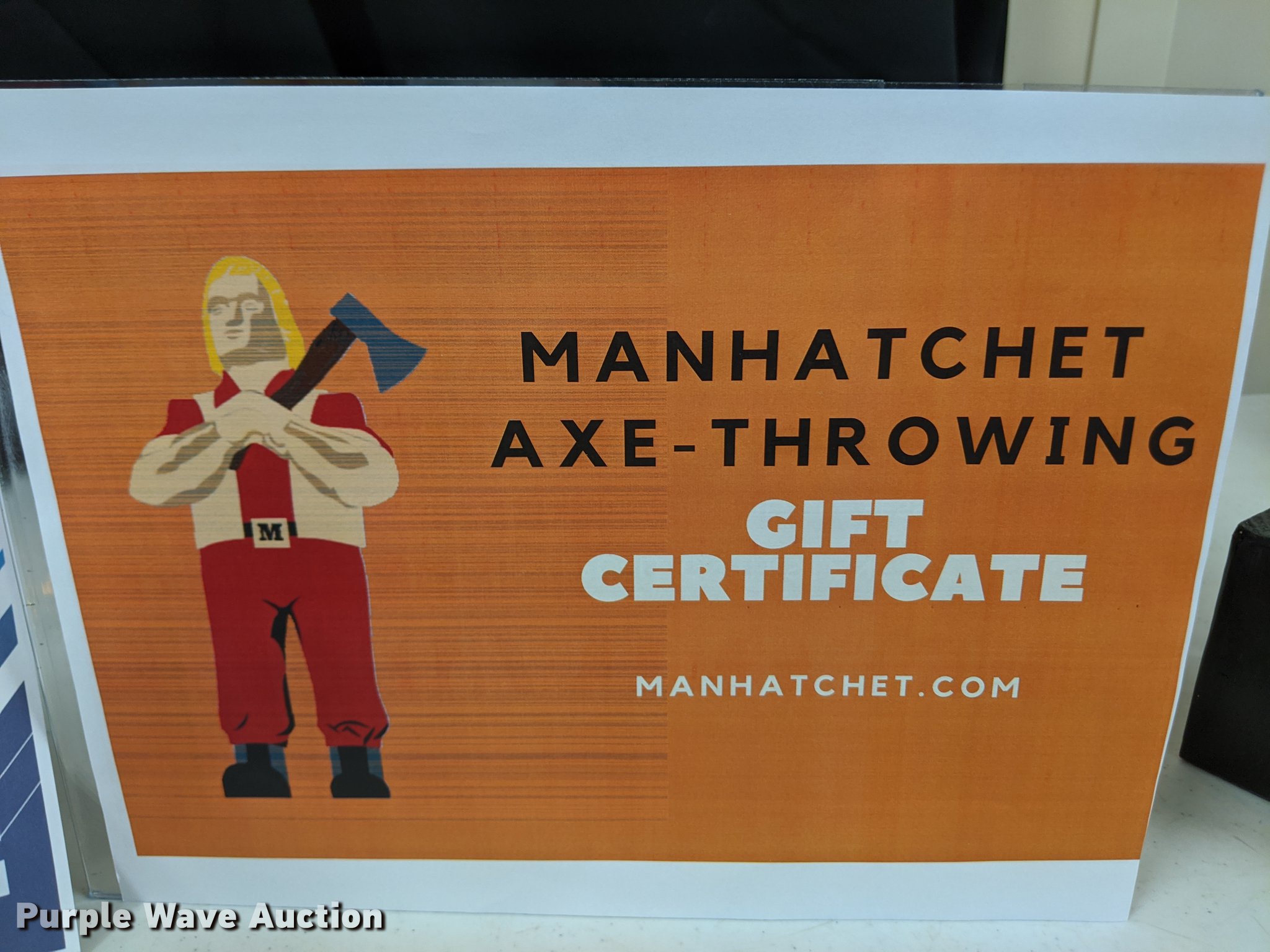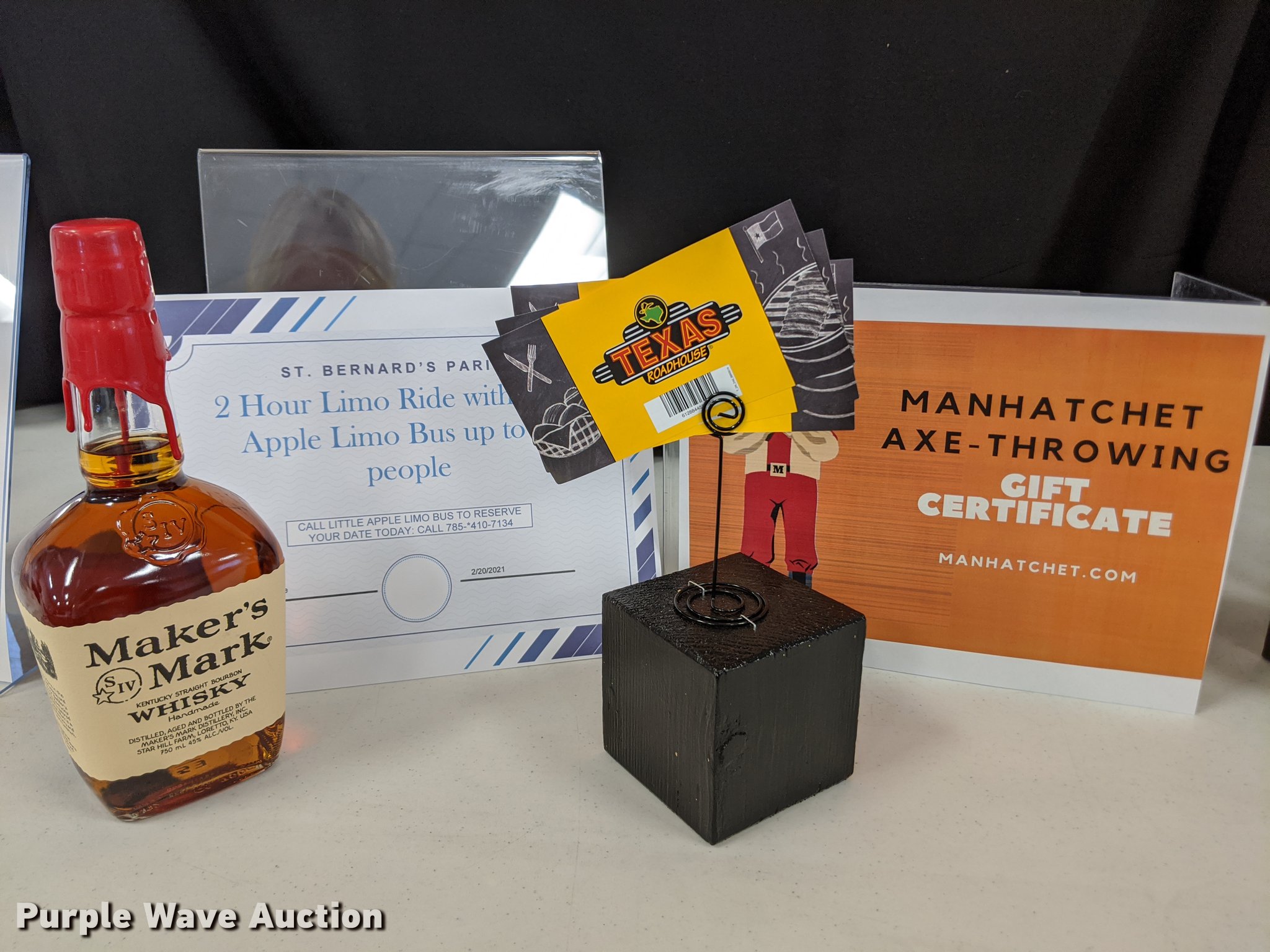 Purple Wave is selling a used All Other Household Items in Kansas. This item is a Outing for six to Manhatchet, Texas Roadhouse and a Limo Ride with the following: This package includes:, Certificate for one lane at Manhatchet, Dinner for six at Texas Roadhouse, Two hour Limo Ride provided by Little Apple Limo Service
