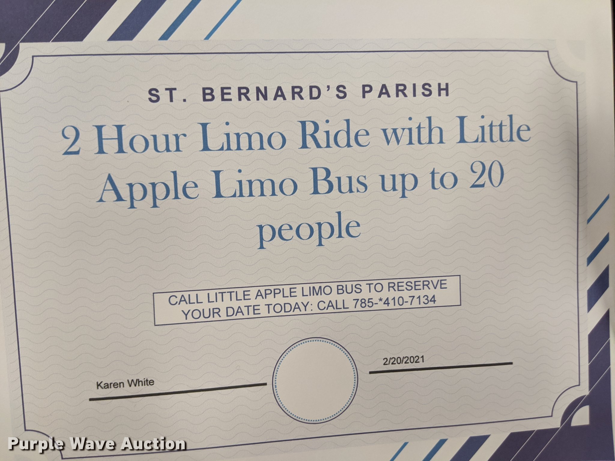 Outing for six to Manhatchet, Texas Roadhouse and a Limo Ride. This package includes: Certificate for one lane at Manhatchet , Dinner for six at Texas Roadhouse, Two hour Limo Ride provided by Little Apple Limo Service. Donated by Sarah & Thomas Pacheco, Little Apple Limo Bus and Texas Roadhouse. Estimated value = $765.00. St. Bernard Catholic Church. 17665 Old Post Rd.. Wamego, KS 66547