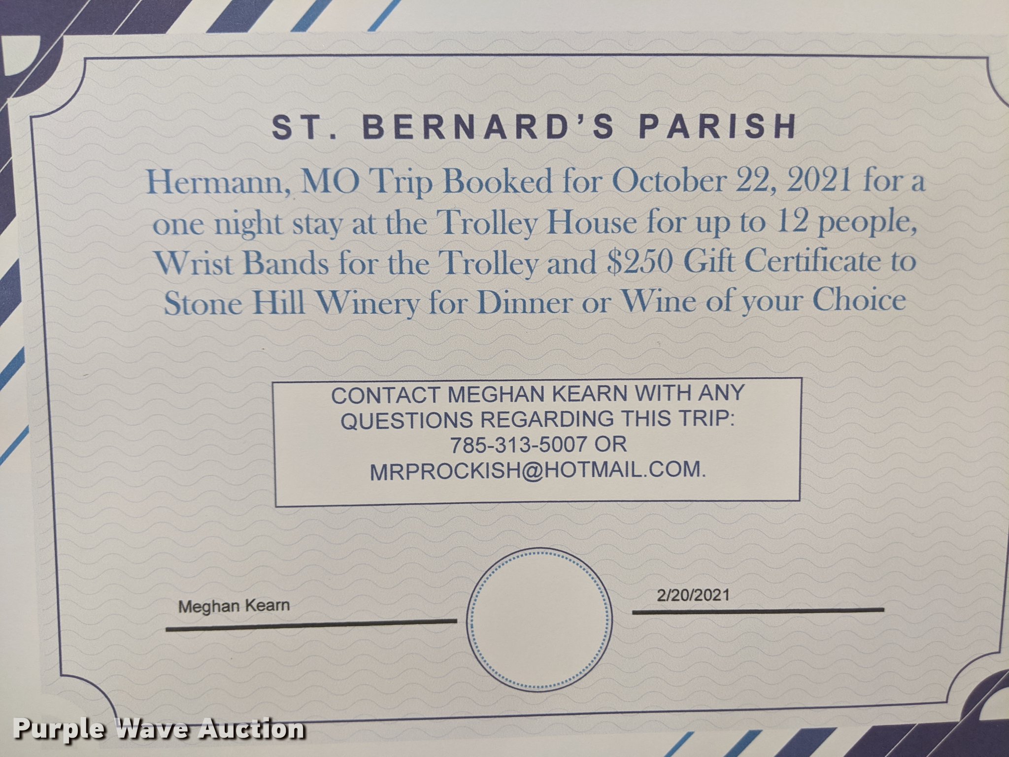 Hermann, MO Trip. October 22, 2021 , A one night stay at the Trolley House for twelve, Wrist bands for the Trolley , $250 gift certificate to Stone Hill Winery for dinner or wine of your choice. Donated by Bank of the Flinthills and Wamego Council Knights of Columbus. Estimated value = $1400.00. St. Bernard Catholic Church. 17665 Old Post Rd.. Wamego, KS 66547