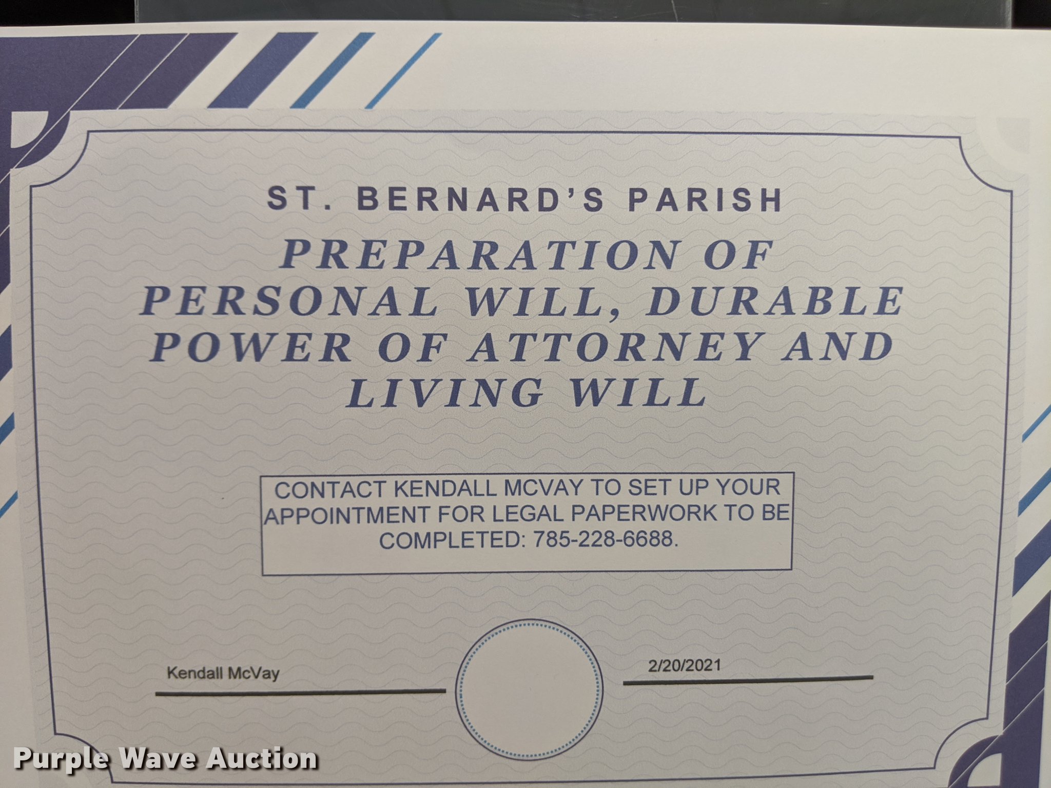 Get Yourself Covered: Attorney Services. Preparation of Personal will, Durable power of attorney, Living will. Donated by McVay Law Office. Estimated value = $500.00. St. Bernard Catholic Church. 17665 Old Post Rd.. Wamego, KS 66547